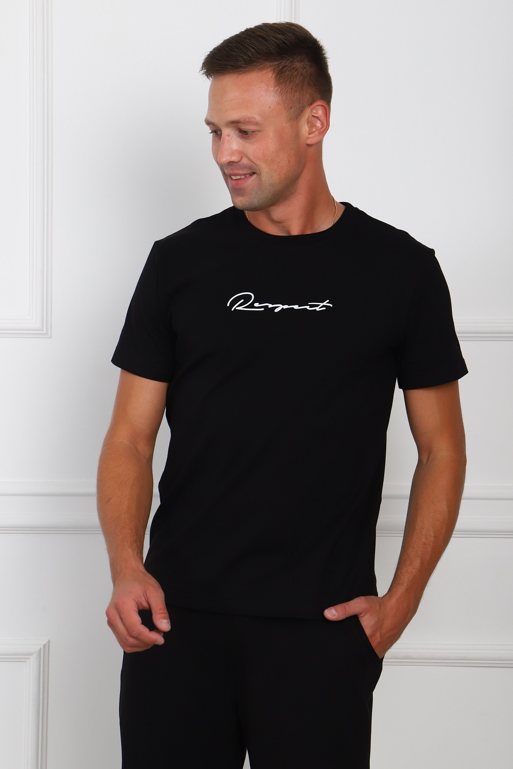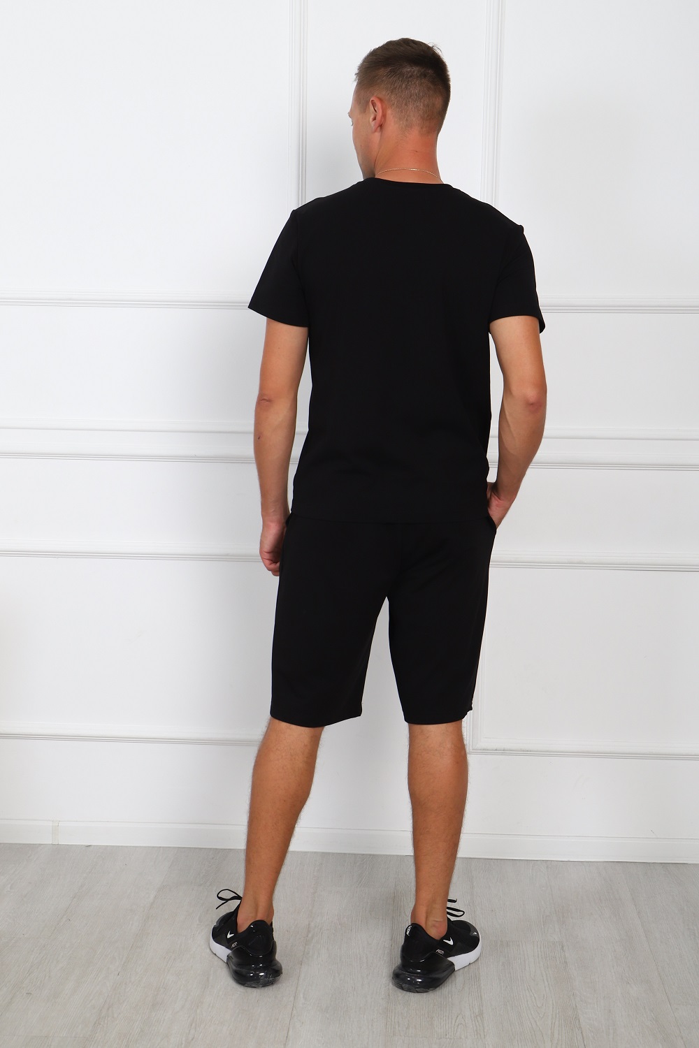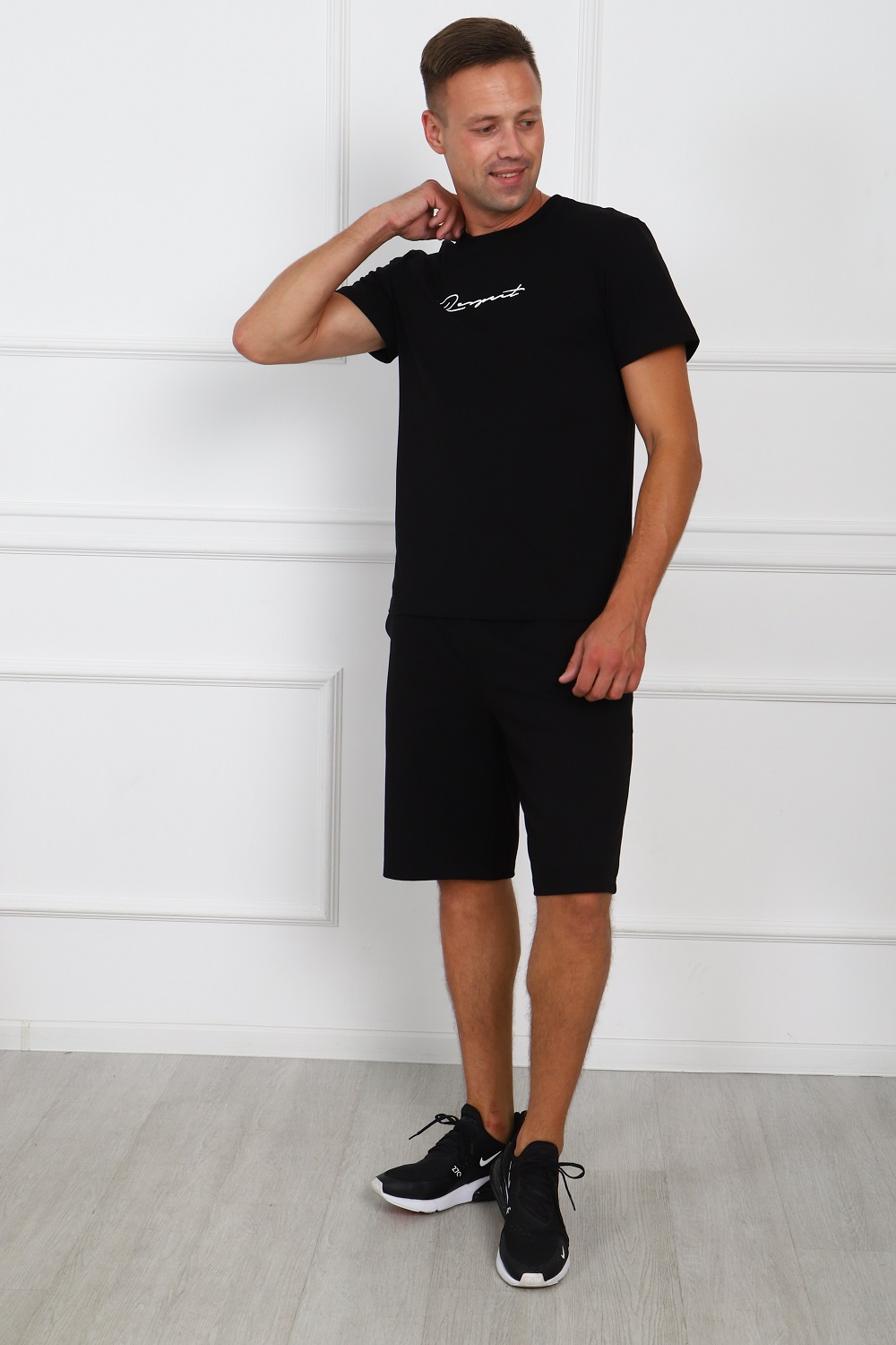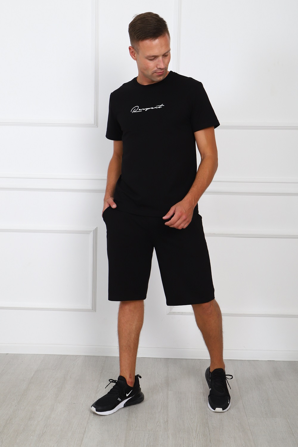 Костюм мужской: футболка из кулирки-пенье, с короткими рукавами с принтом на полочке; шорты из футера с боковыми карманами.