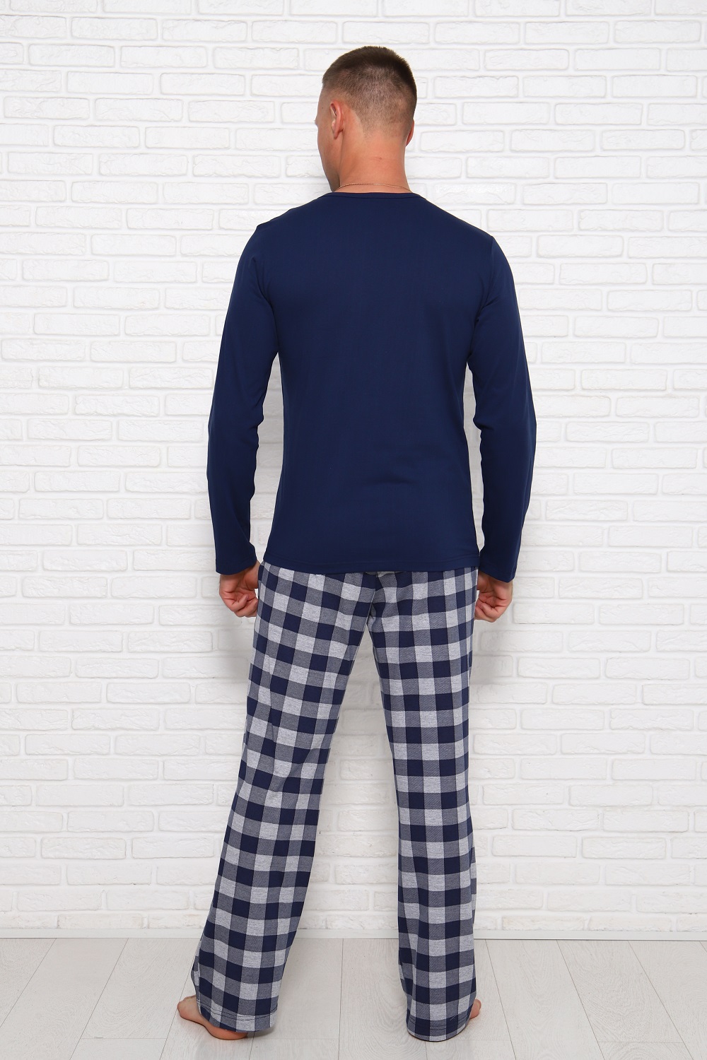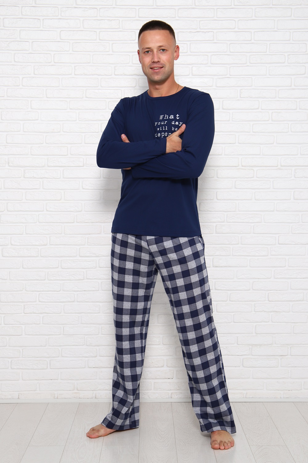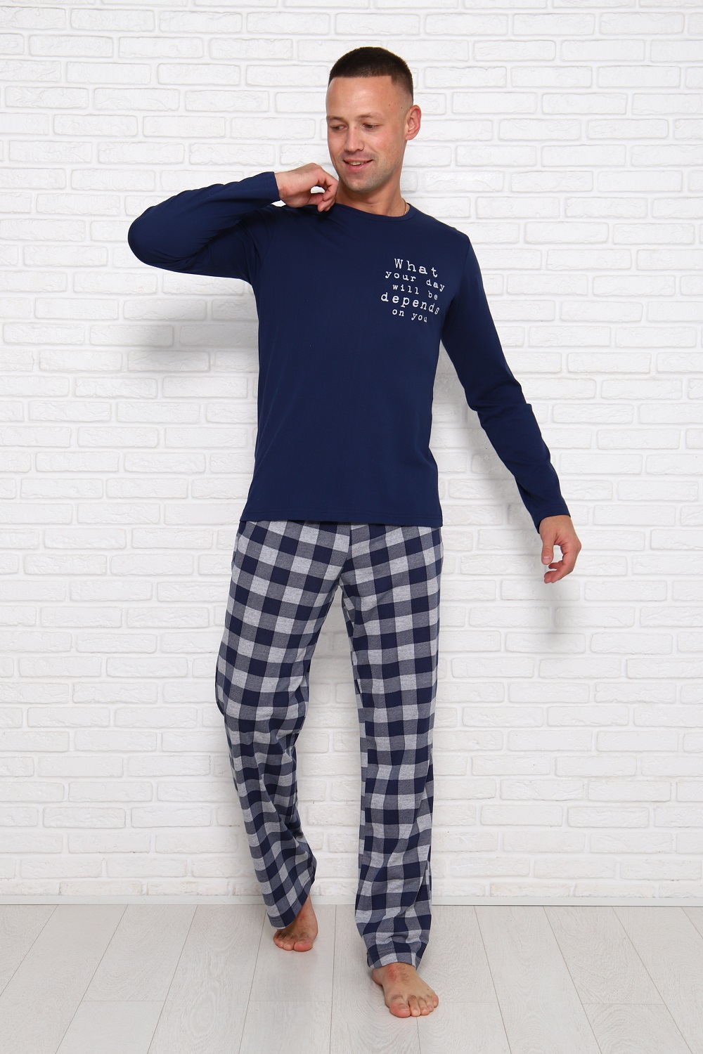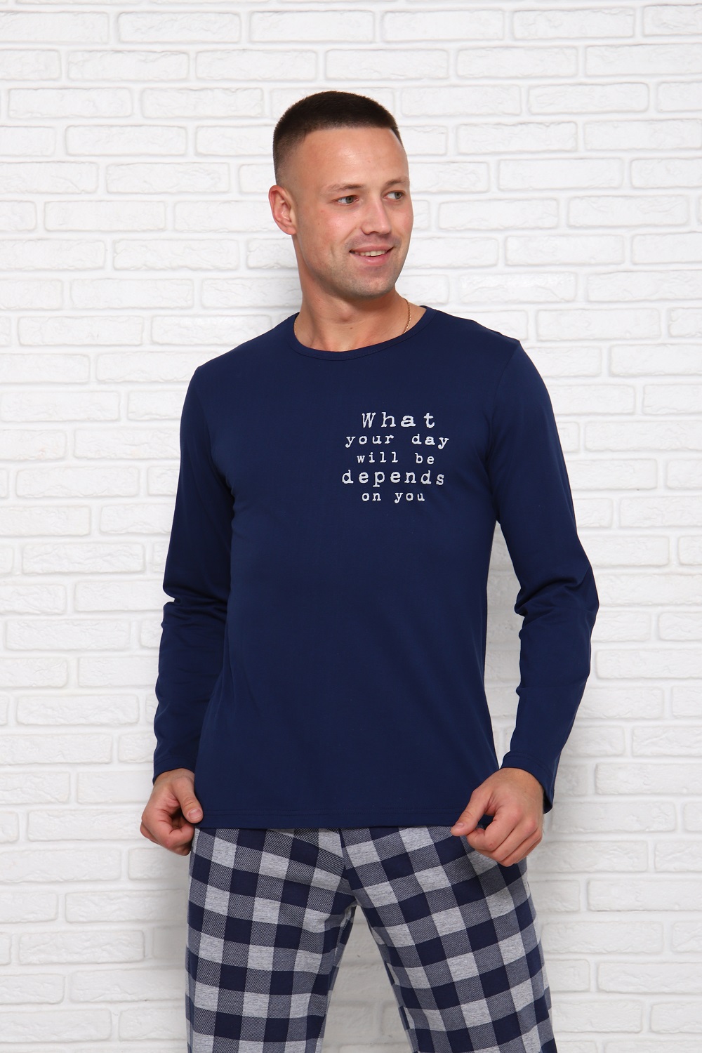 Комфортная мужская пижама из 100% хлопка - брюки в клетку с боковыми карманами, на эластичном поясе и футболка с длинным рукавом и стильным принтом на полочке. Данная модель пижамы составляет комплект Family look с женской пижамой (арт. 1036).