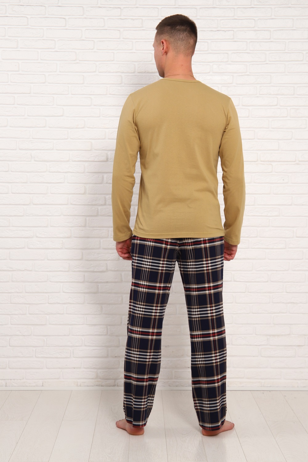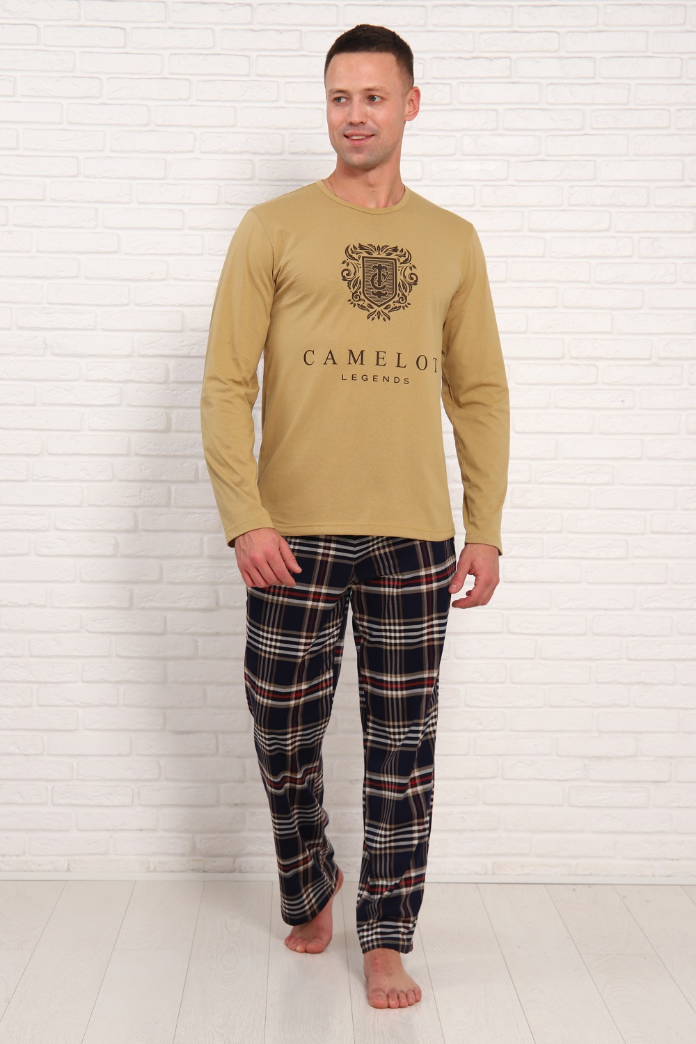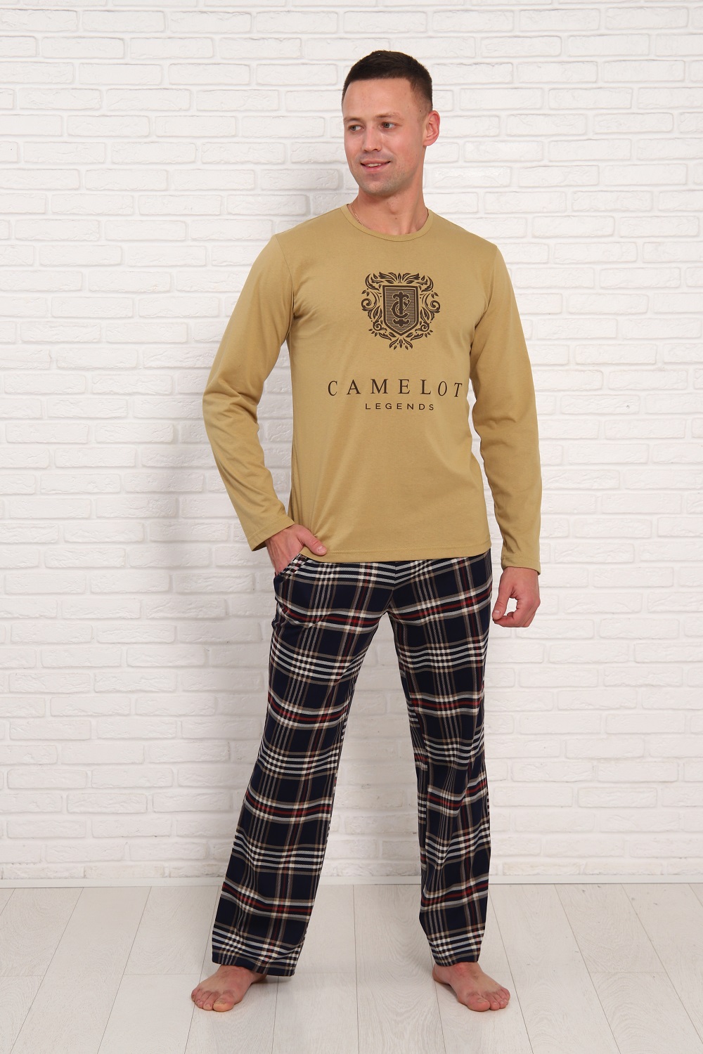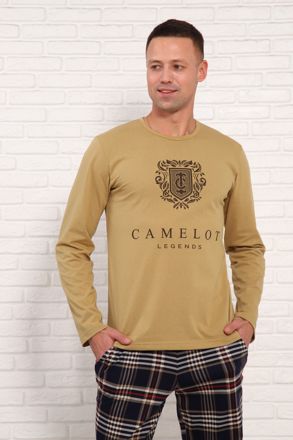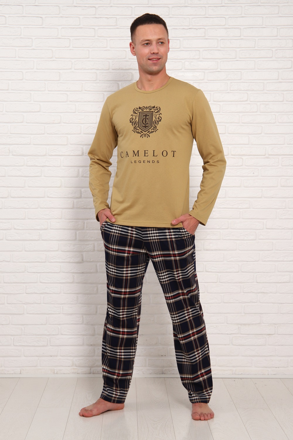 Мужская пижама классического кроя и стиля. Обнотонная футболка с принтом, с длинными рукавами и брюки в клетку, с боковыми карманами и эластичным поясом. Размеры 48-56.
