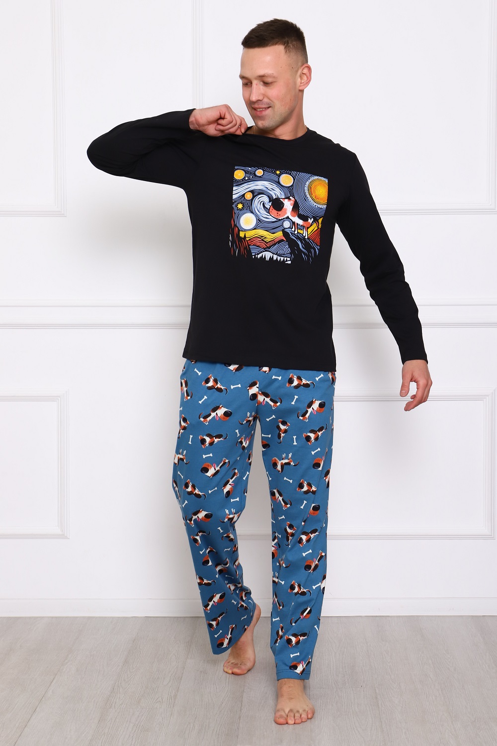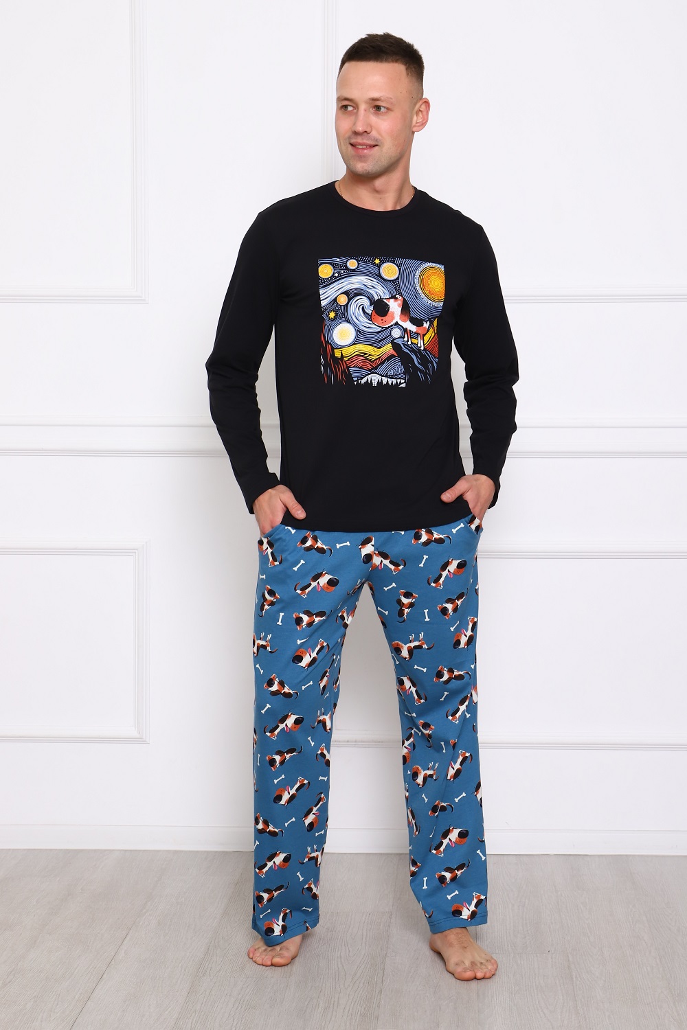 Стильный мужской домашний костюм, 100% хлопок: брюки на комфортном поясе, с боковыми удобными карманами; черная футболка с длинным рукавом и с оригинальным принтом на груди.