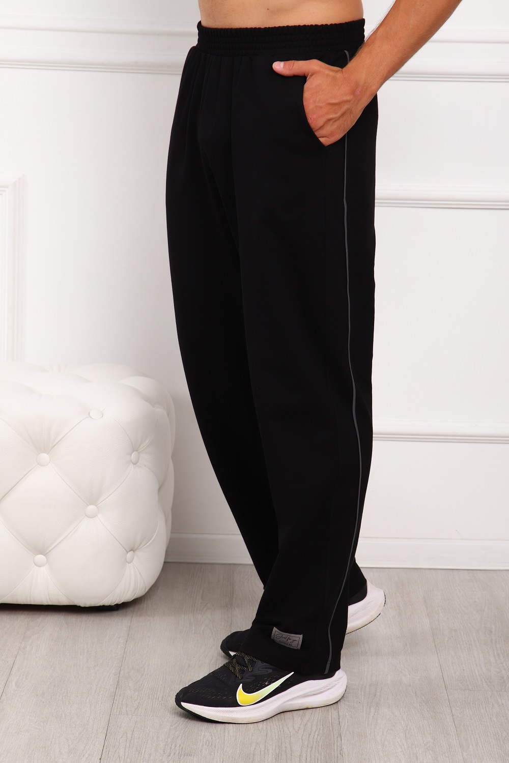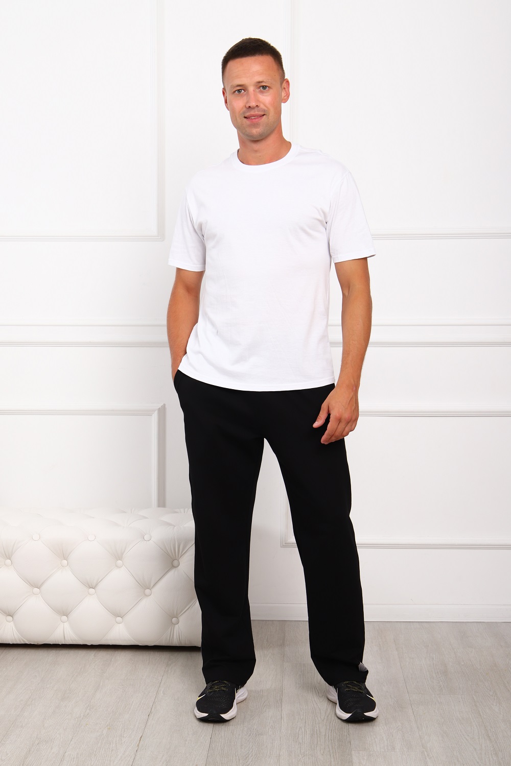 Брюки мужские с лампасами, с боковыми карманами и с нашивкой по низу левой брючины. Удобный эластичный пояс. Маломнущийся трикотаж, с высоким содержанием хлопка.