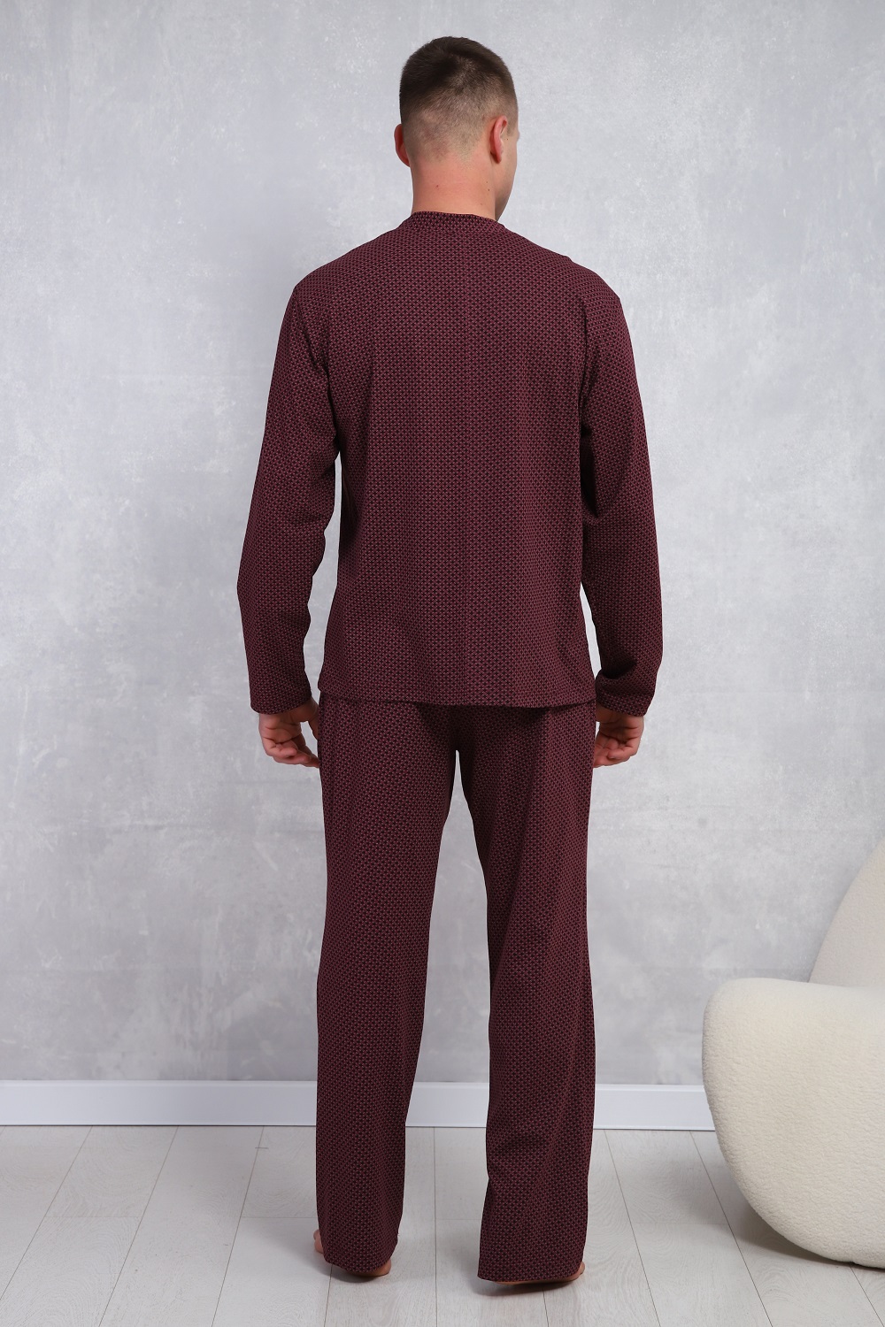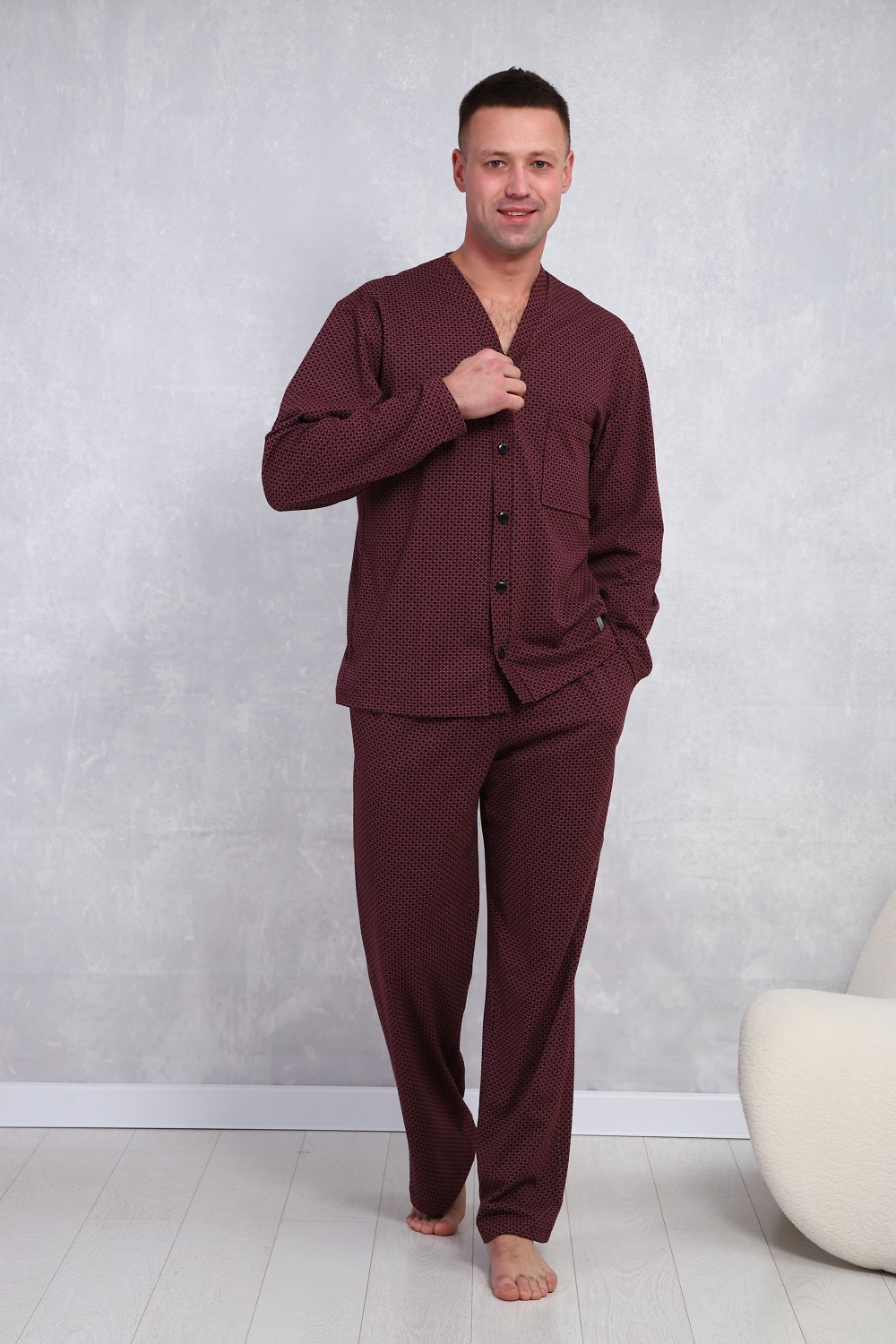 Пижама мужская в элегантном респектабельном стиле: сдержанный рисунок и классический крой. Брюки на эластичном поясе с боковыми карманами и верх с длинными рукавами и карманом на левой полочке. Хлопок 100%, обеспечит комфорт и уют.