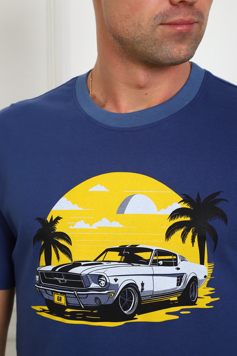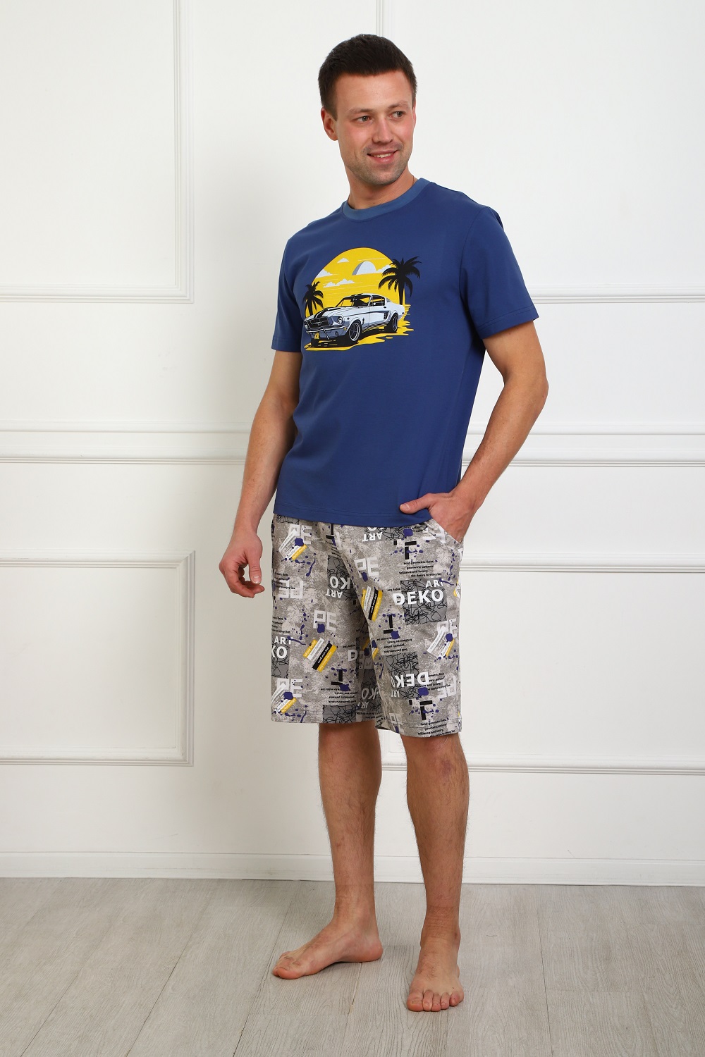 Костюм мужской: футболка с атмосферным принтом на груди, с короткими рукавами и шорты на эластичном поясе, с боковыми карманами. Комфорт 100% хлопка.