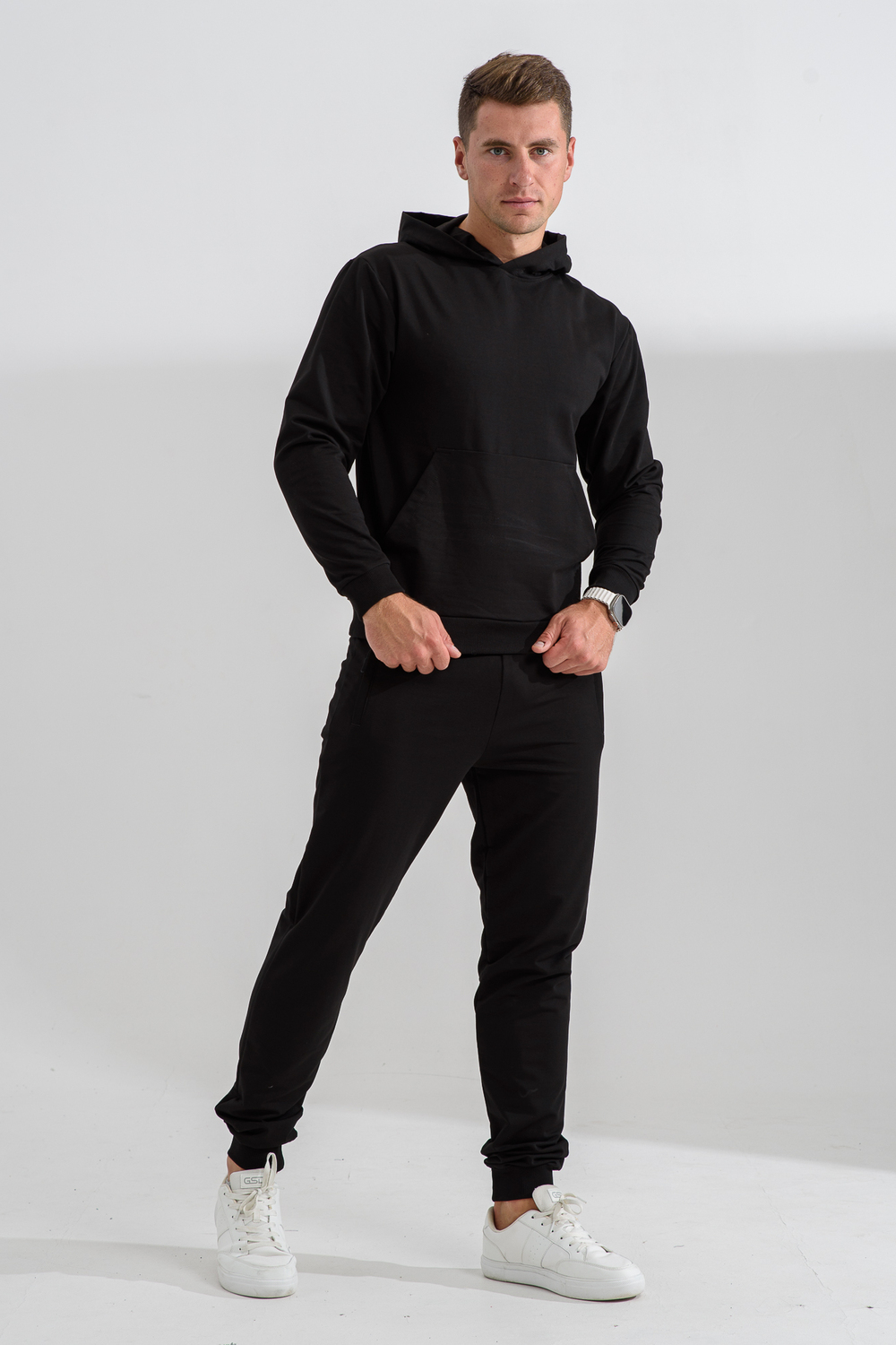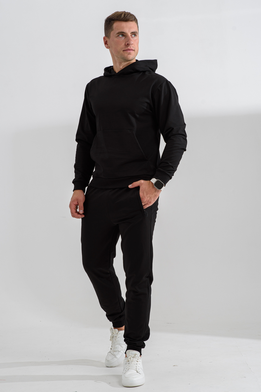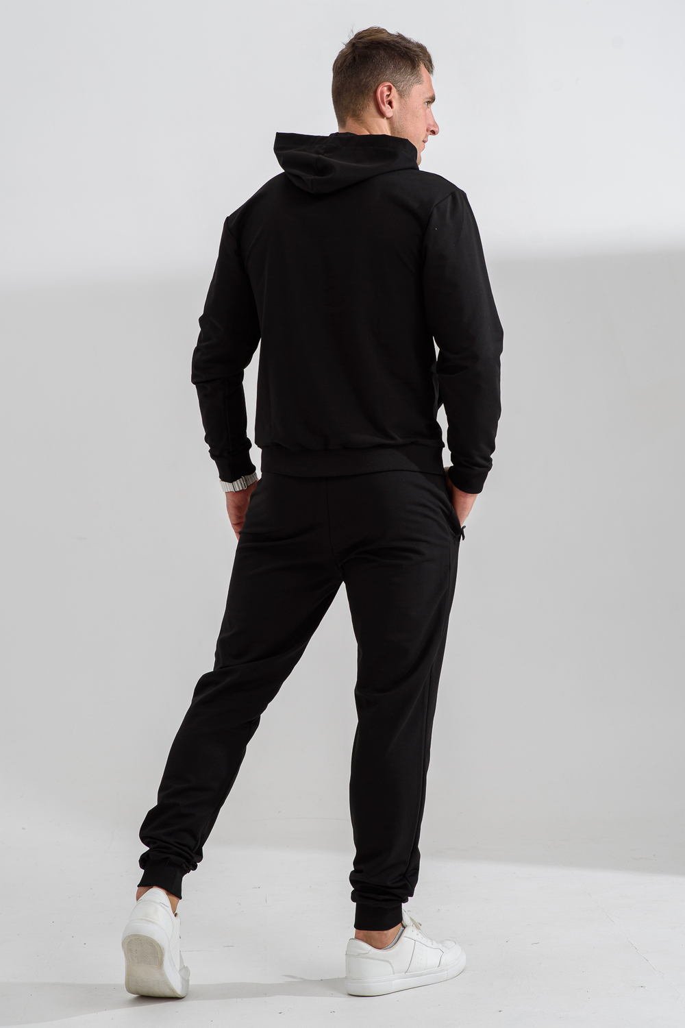Костюм спортивный мужской с худи и джоггерами. Костюм свободного кроя состоит из толстовки с капюшоном и карманом кенгуру и брюк джоггеров на манжете с карманами в боковых швах. Костюм однотонный сшит из качественного хлопкового трикотажного материала - футера 2-х нитки. Обладает отличной эластичностью, не сковывает движений. Идеален для занятий спортом. Зимой костюм возможно носить в тренажерный зал или использовать как домашнюю одежду.