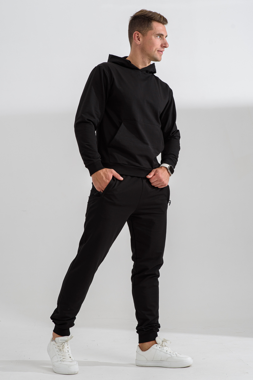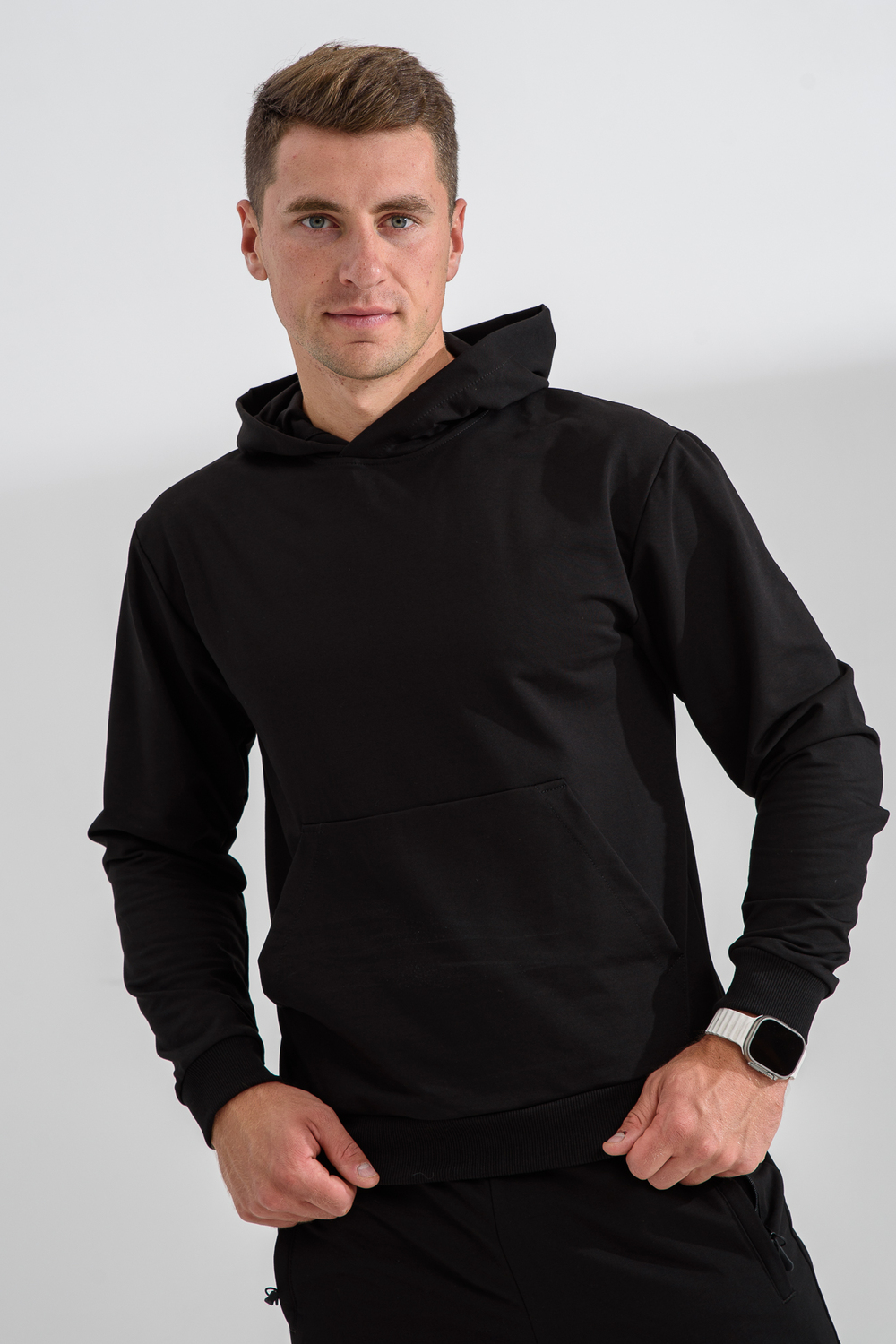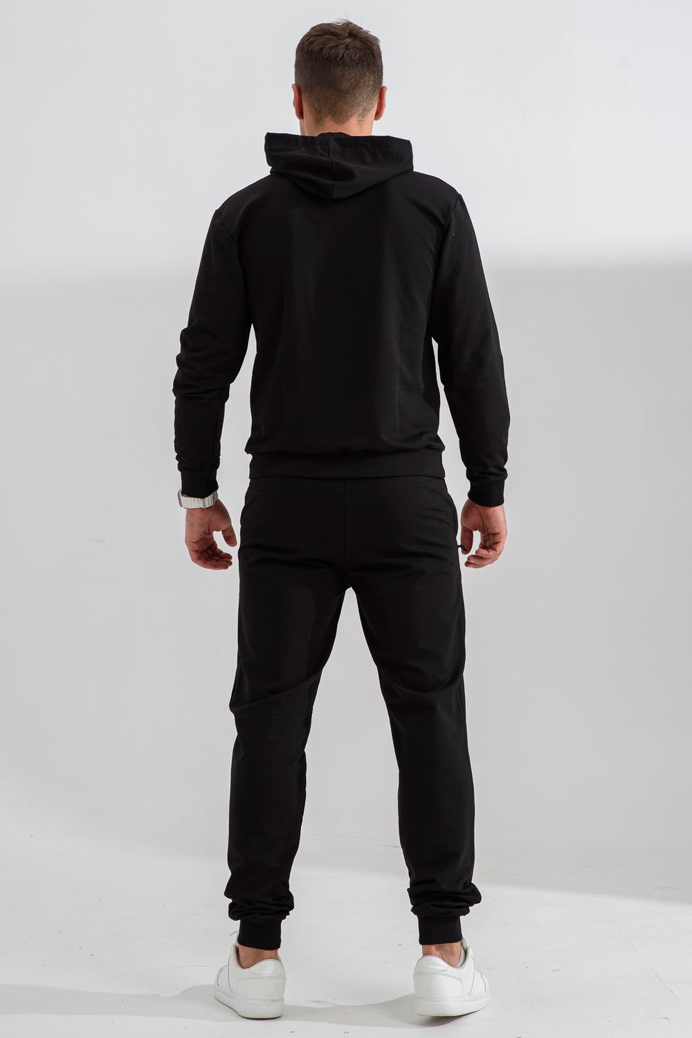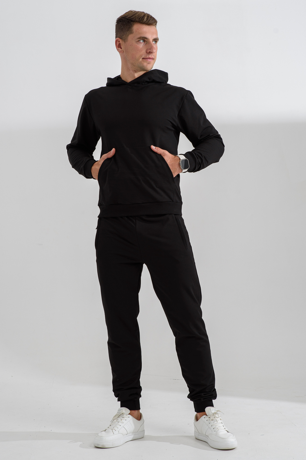 Костюм спортивный мужской с худи и джоггерами. Костюм свободного кроя состоит из толстовки с капюшоном и карманом кенгуру и брюк джоггеров на манжете с карманами в боковых швах. Костюм однотонный сшит из качественного хлопкового трикотажного материала - футера 2-х нитки. Обладает отличной эластичностью, не сковывает движений. Идеален для занятий спортом. Зимой костюм возможно носить в тренажерный зал или использовать как домашнюю одежду.