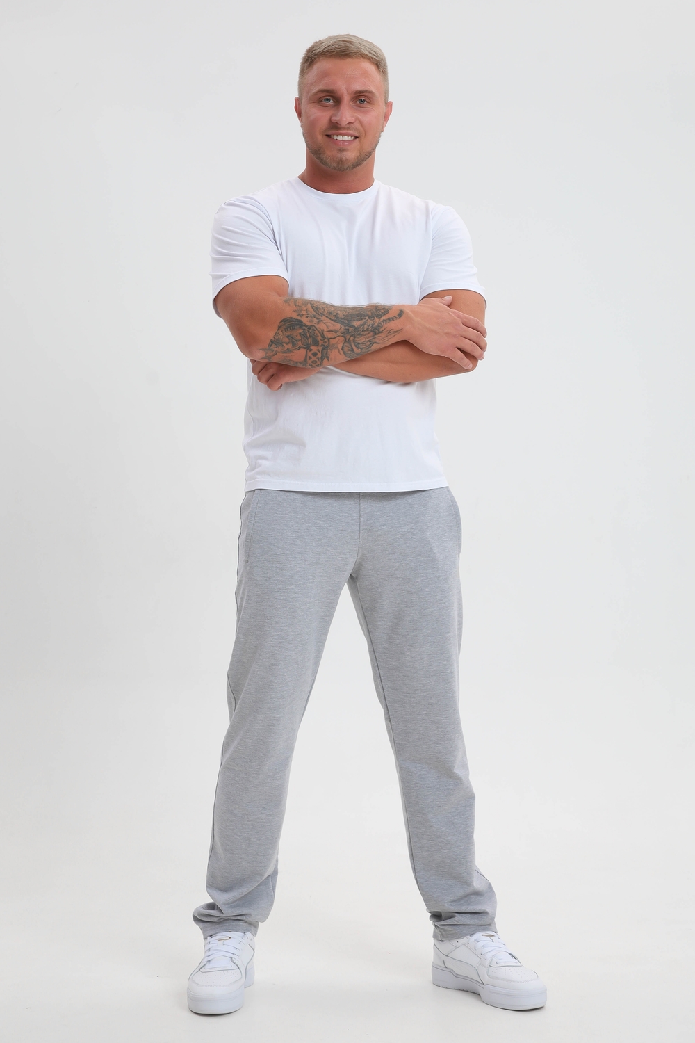 Трикотажные спортивные брюки для мужчин, базовая вещь гардероба. Штаны прямого кроя с двумя карманами на молнии и с эмблемой сбоку, пояс на резинке с внутренним шнурком. Брюки очень удобные и легкие, качественная турецкая ткань. Подойдут как для повседневного ношения, также для прогулок, занятий спортом.