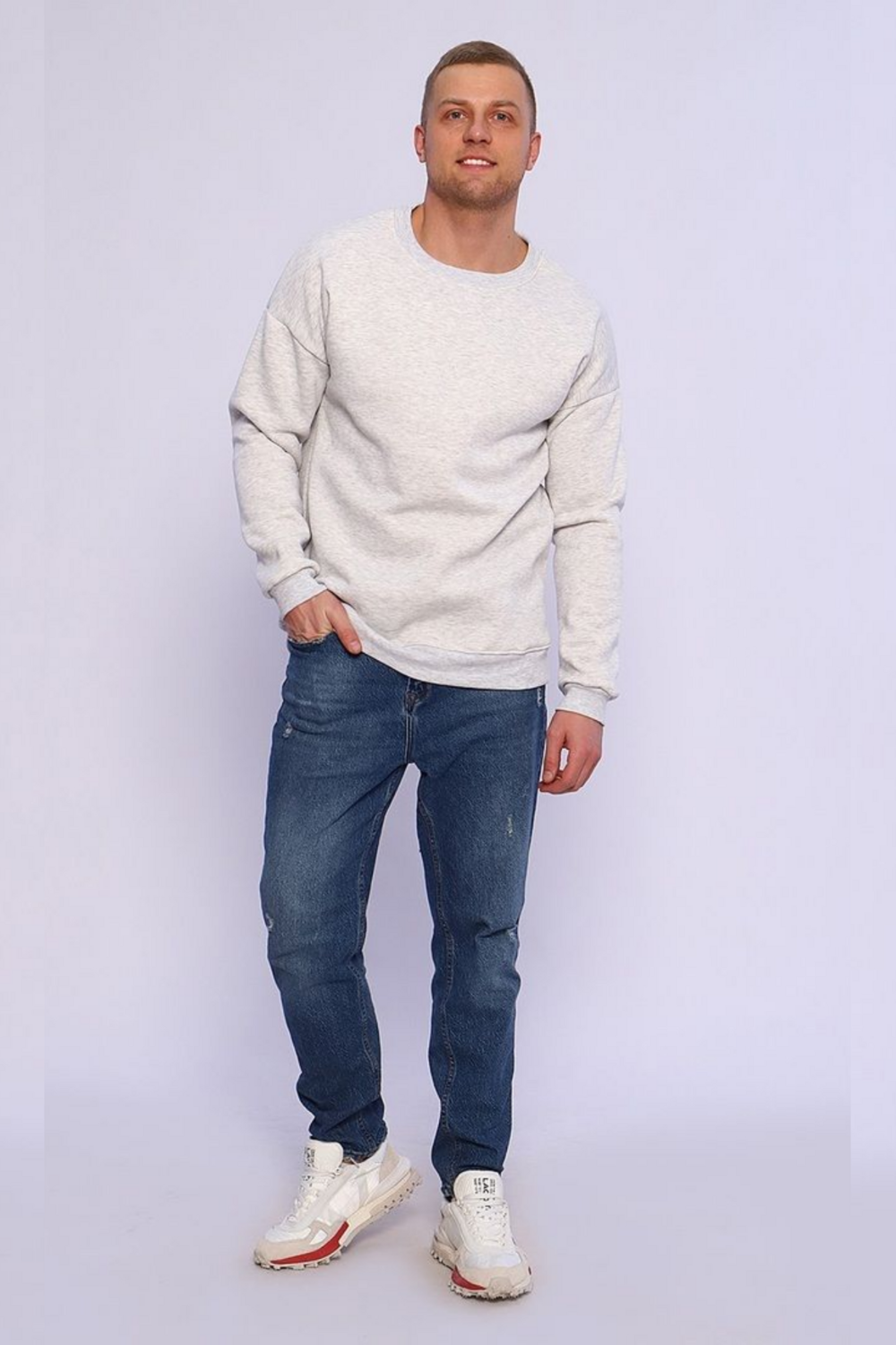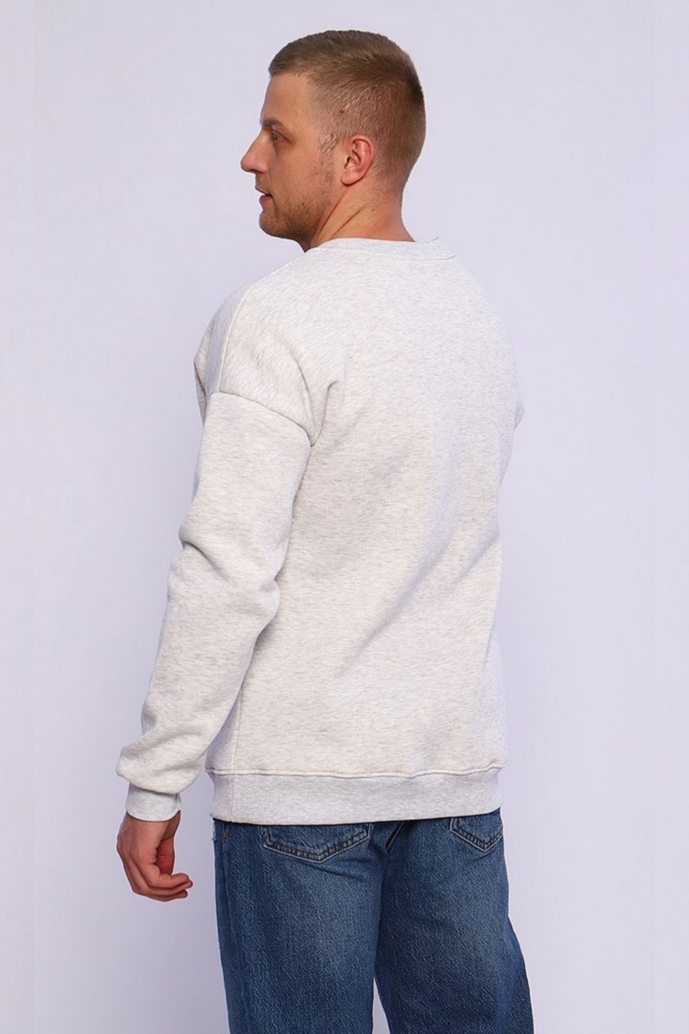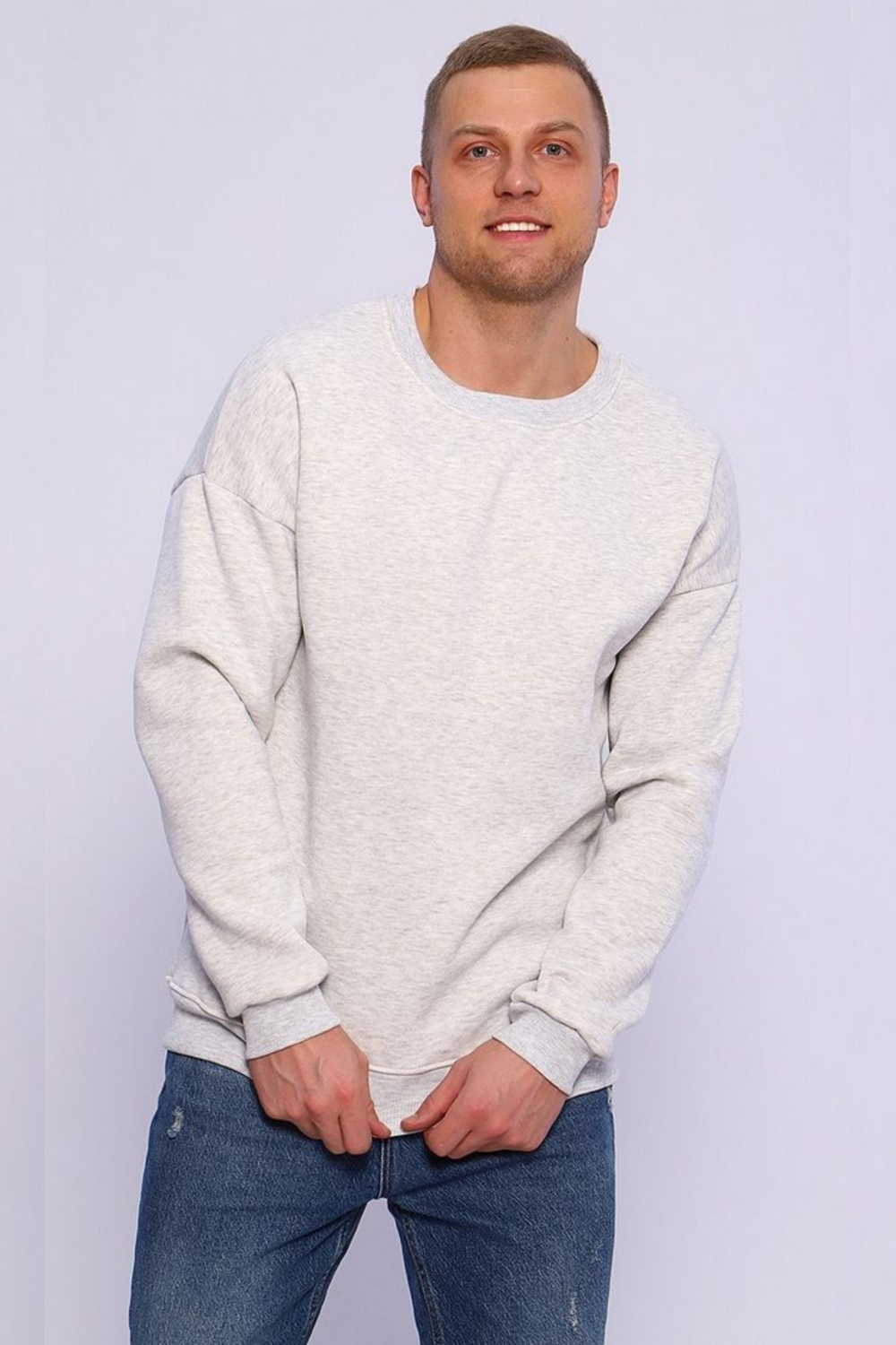Мужской свитшот в цвете серый меланж это базовая модель свободного кроя (оверсайз), выполненная из плотного футера с начесом. Такая одежда хорошо удерживает тепло и подходит для прохладной погоды.