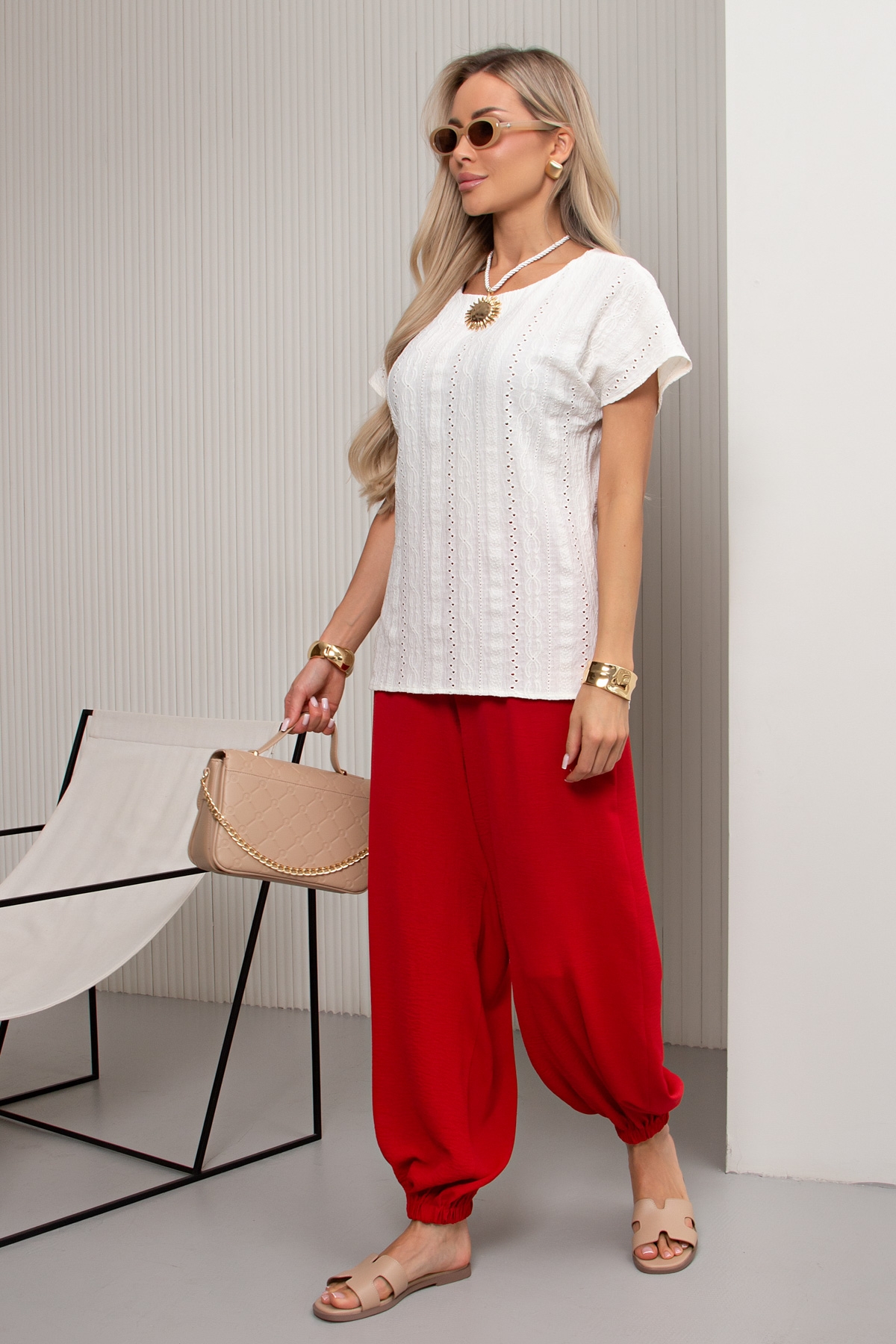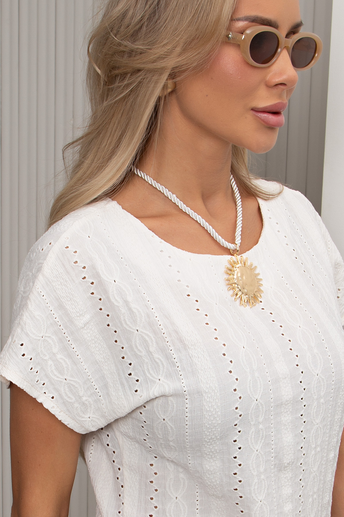 Женственная, летняя блузка свободного кроя выполнена из блузочной ткани "шитье". Округлая горловина на внутренней обтачке. Цельнокроеный короткий рукав. Низ ровный , по бокам разрезы.