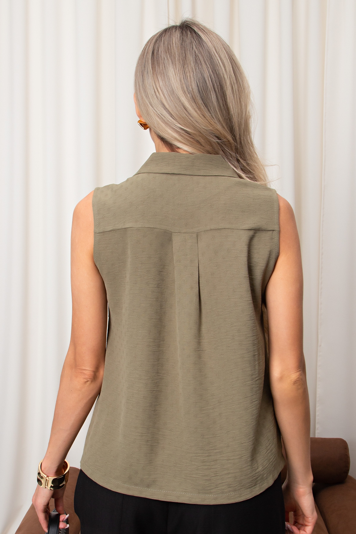 Летняя блузка прямого кроя выполнена из смесовой ткани с эффектом крэш (жатка). V- образная горловина оформлена отложным воротником. По переду застежка на петли и пуговицы .Низ ровный,без разрезов.