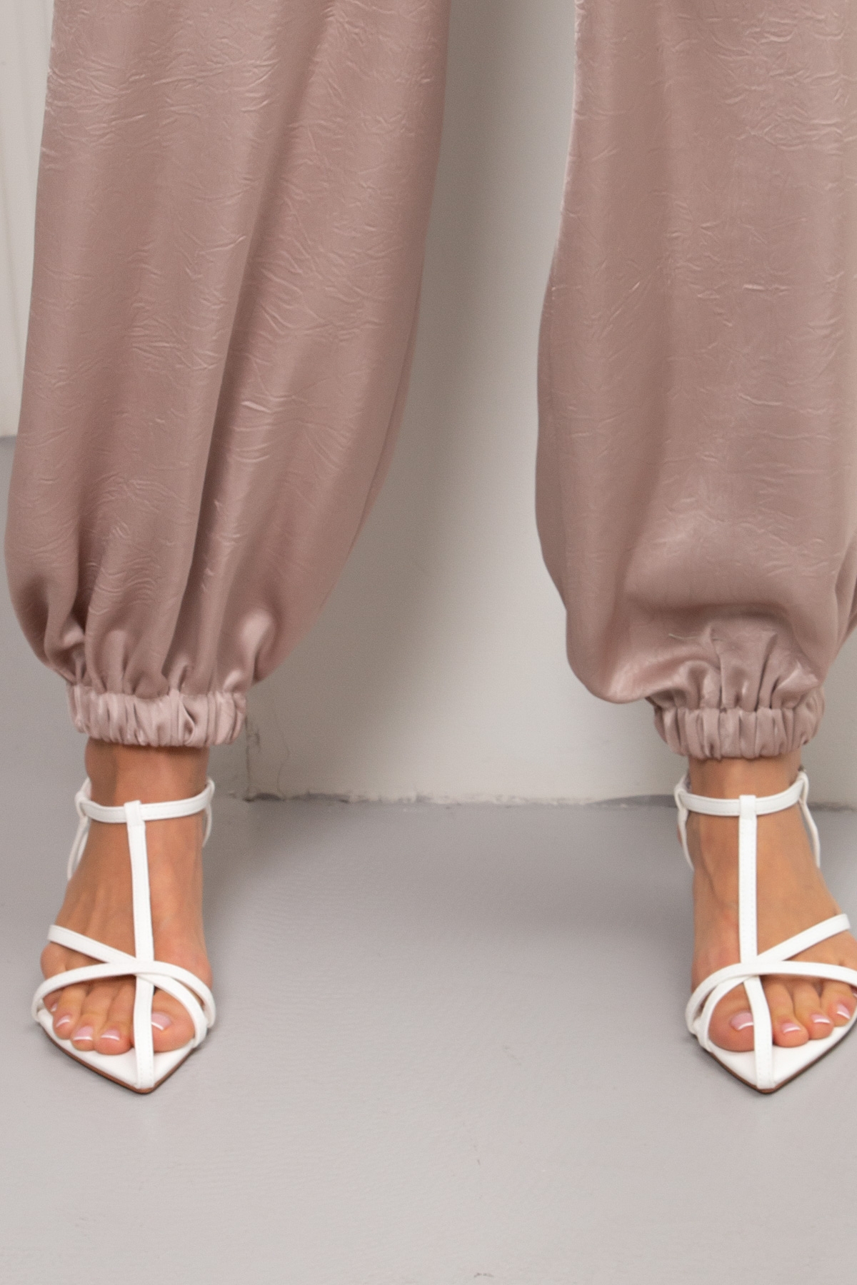 Летние брюки Алладины выполнены из атласа с эффектом крэш (жатка). Брюки свободного силуэта с комфортной посадкой по талии, которую обеспечивает притачной пояс на резинке. Низ на резинке.