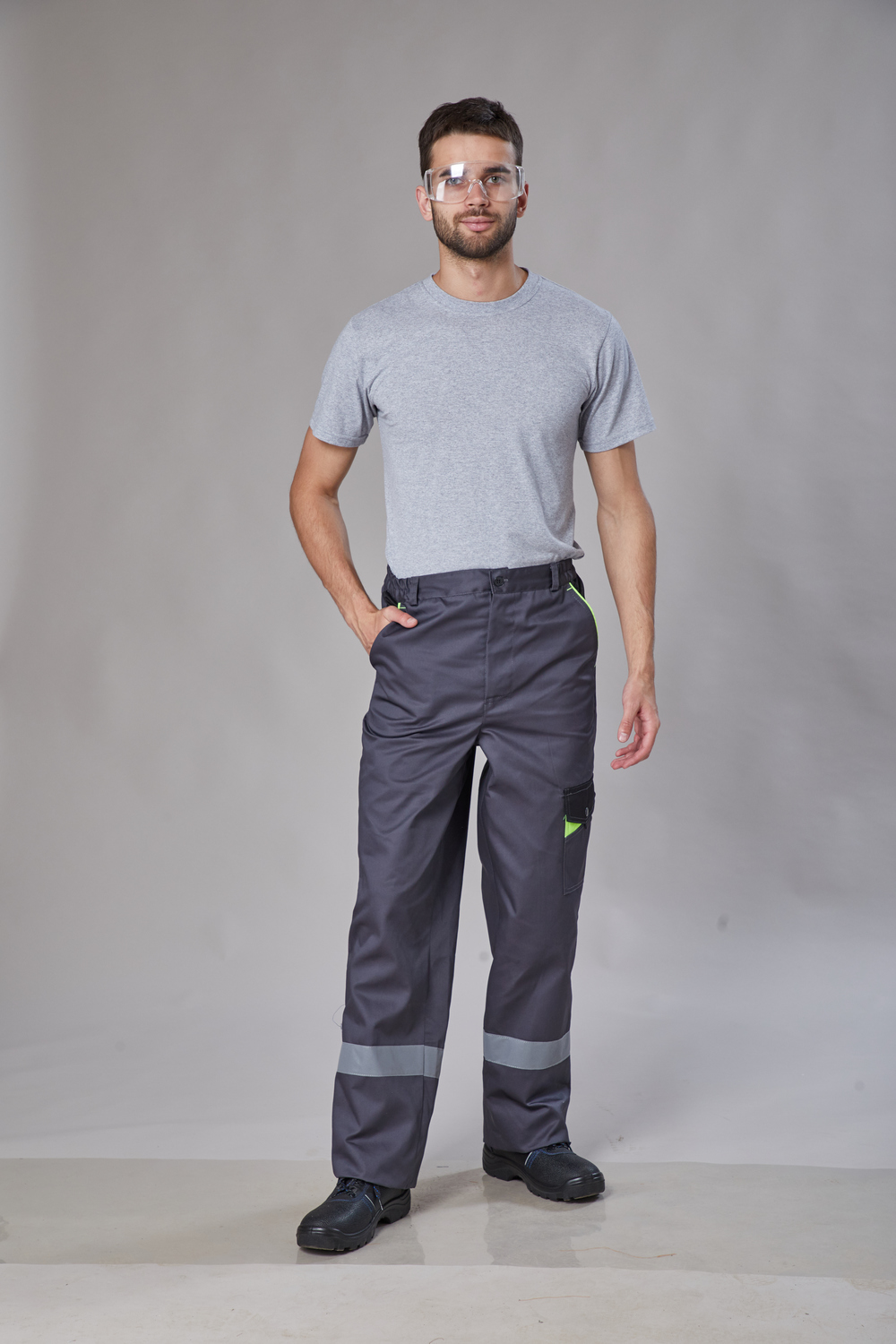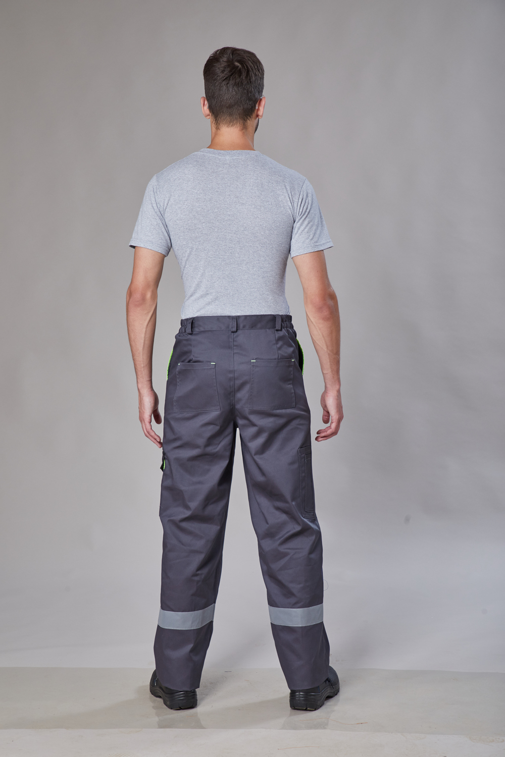 Брюки мужские прямого кроя, с застёжкой гульфика на молнию. Притачной пояс с резинкой по бокам и шлевками. Накладные карманы на левом боковом шве с клапаном с патой на кнопке. Два задних накладных кармана и карман для инструментов. Длинна брюк указана по шаговому шву.