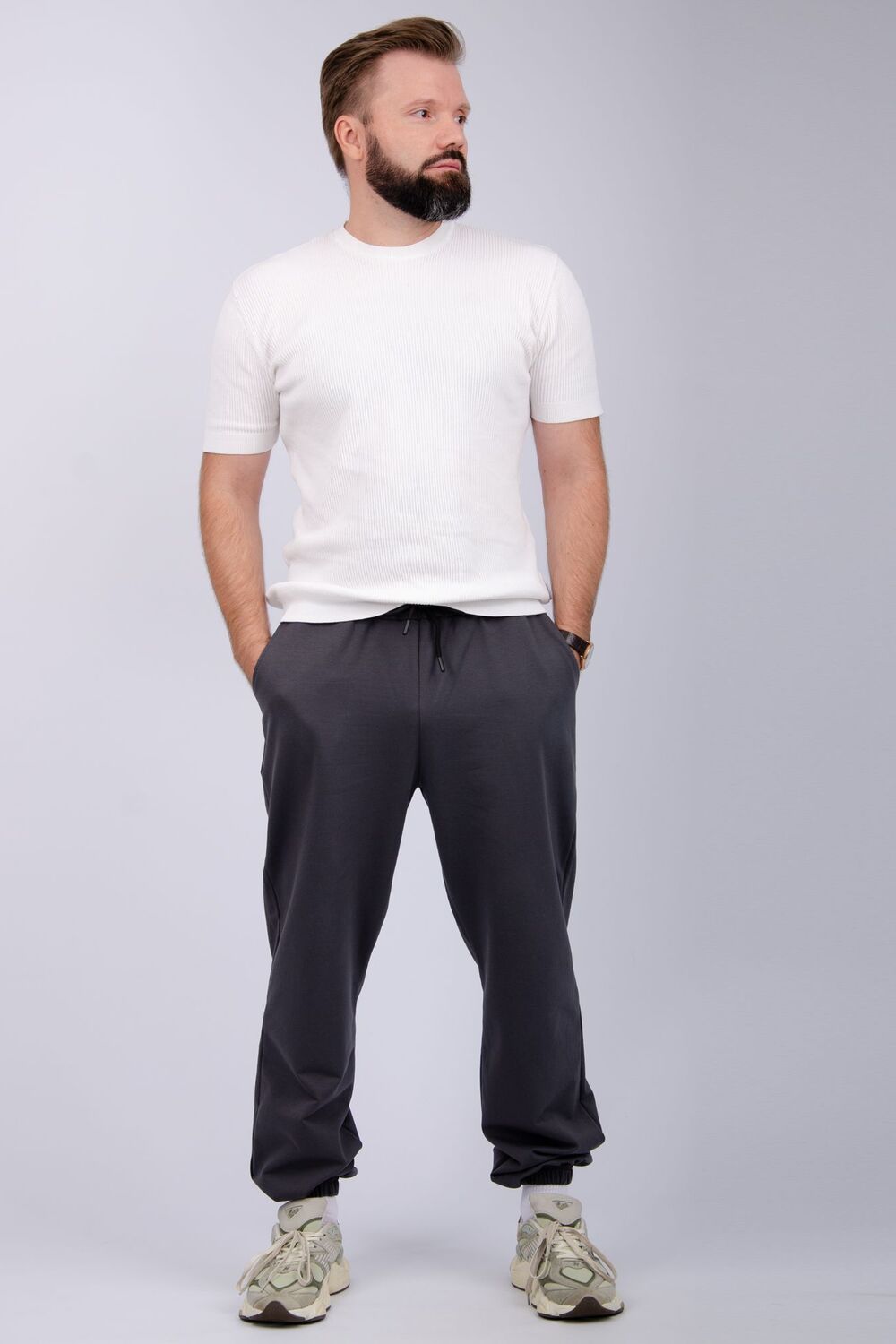 Мужские, спортивные брюки. Пояс на резинке, по бокам два кармана. Низ на манжетах. Они изготовлены из высококачественного трикотажа, за счет чего штаны не вытягиваются на месте колен и не теряют свой вид. Удобная, приятная к телу ткань и не ограничивает движения. Подойдут для спорта, отдыха и повседневной носки.