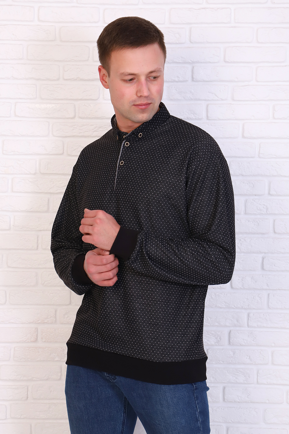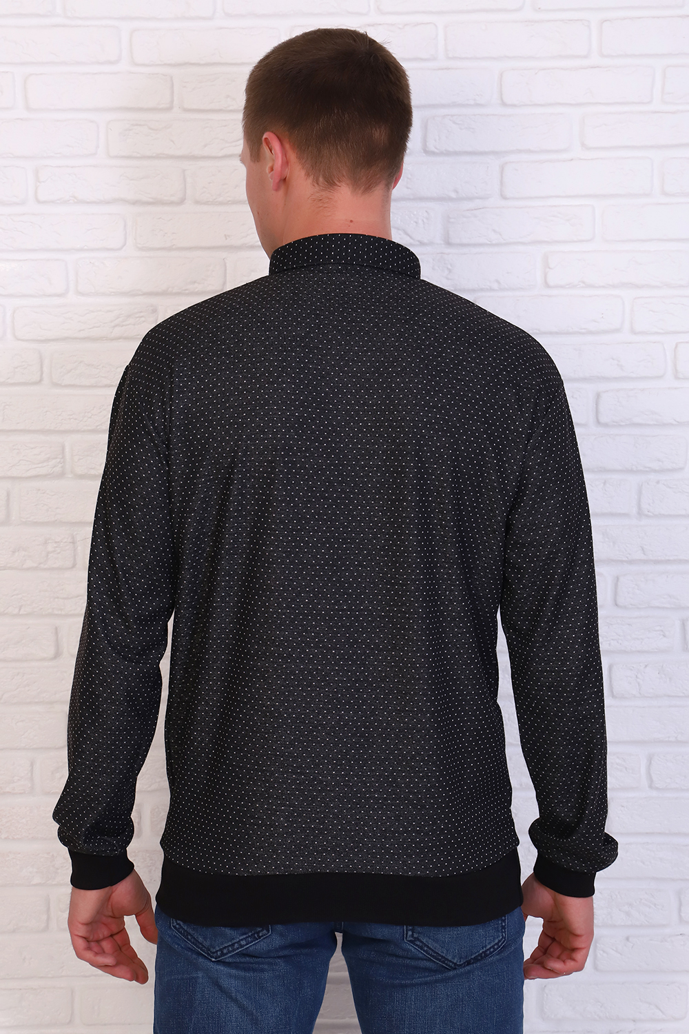 Мягкий, упругий и эластичный джемпер из жаккарда. Приятная на ощупь ткань не потеряет свой первоначальный вид после множества стирок. Модель стандартной посадки с воротником выполнена из трикотажа с узором. Актуальная модель создает непосредственный стиль в одежде. Для более свободной посадки рекомендуем приобретать на 1-2 размера больше.