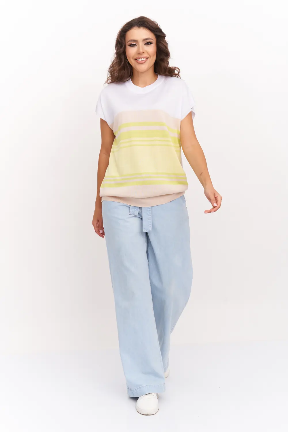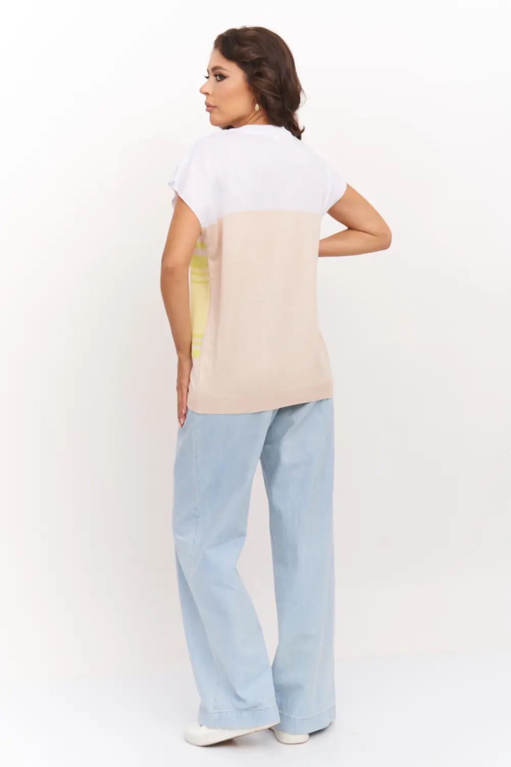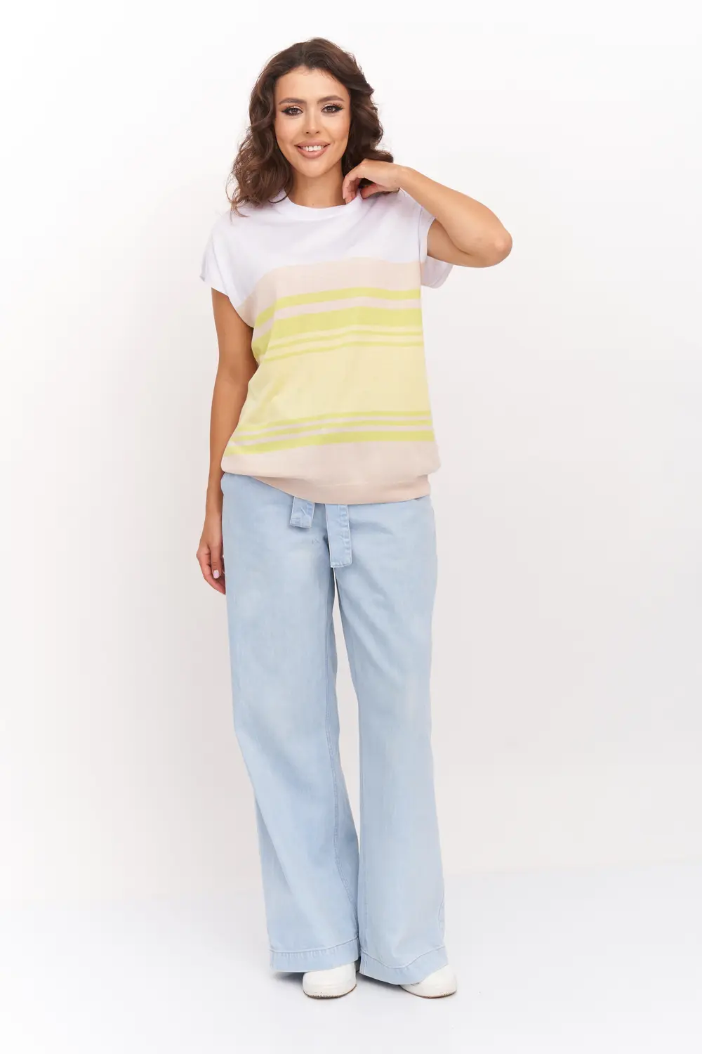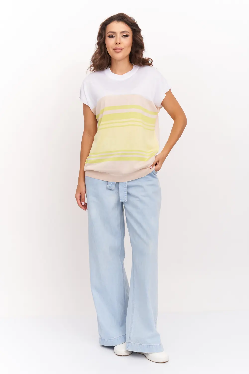 Легкий трикотажный джемпер со спущеной линией плеча и круглой горловиной. Выполнен из пряжи, в составе которой 50% вискозы, что позволяет носить его как базовую вещь летом, либо весной и осенью под пиджак. В джемпере будет Вам комфортно на прогулках в теплое время года. Джемпер прямого силуэта подойдет для любого типа фигуры и составит оригинальный, модный и женственный образ абсолютно с любым низом: юбка, брюки, джинсы.