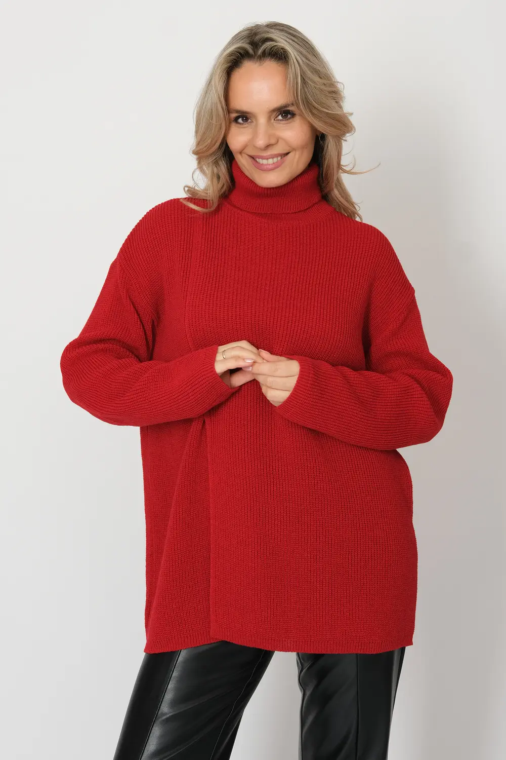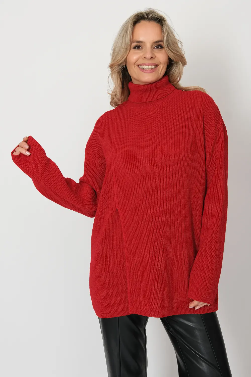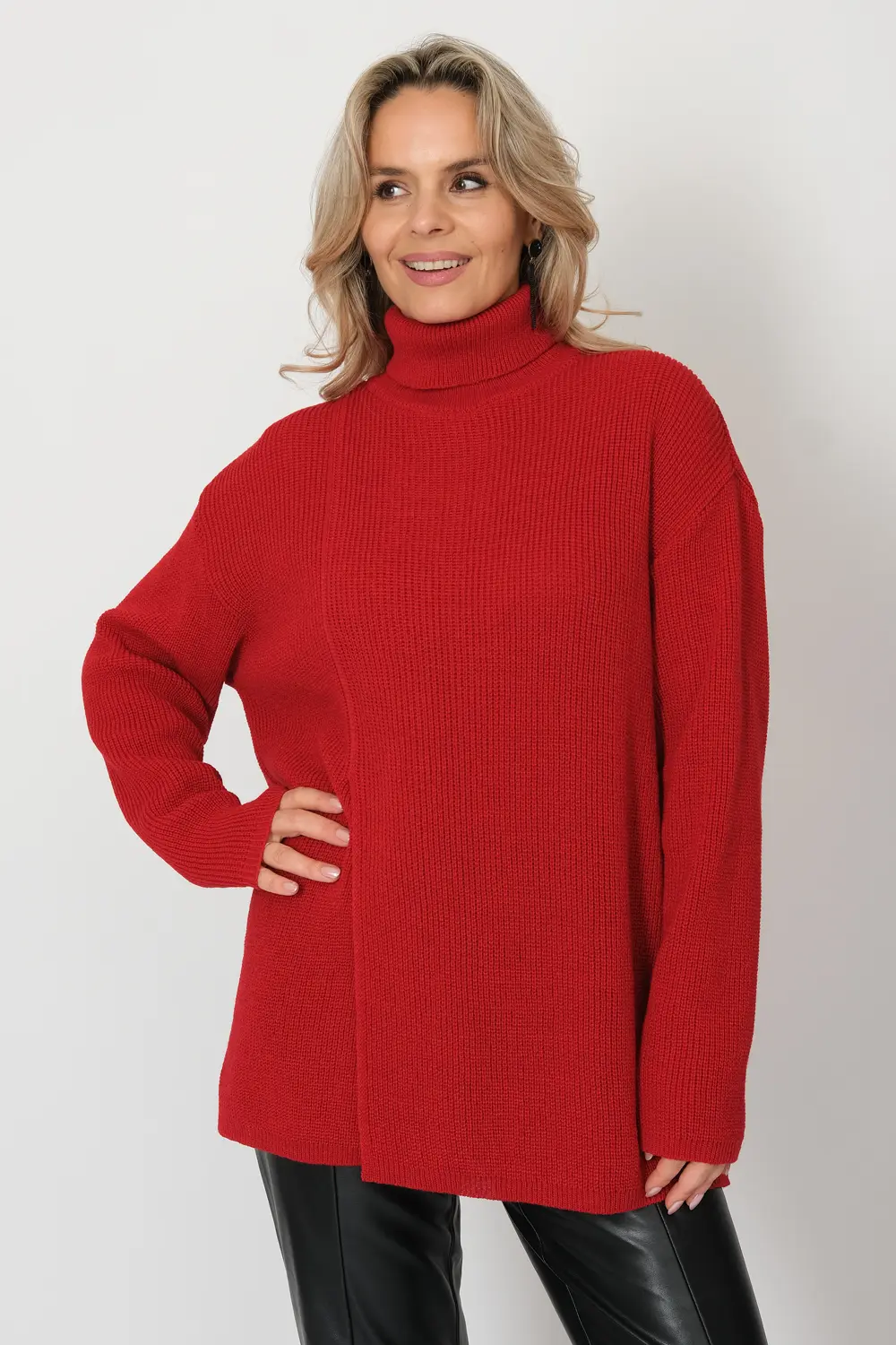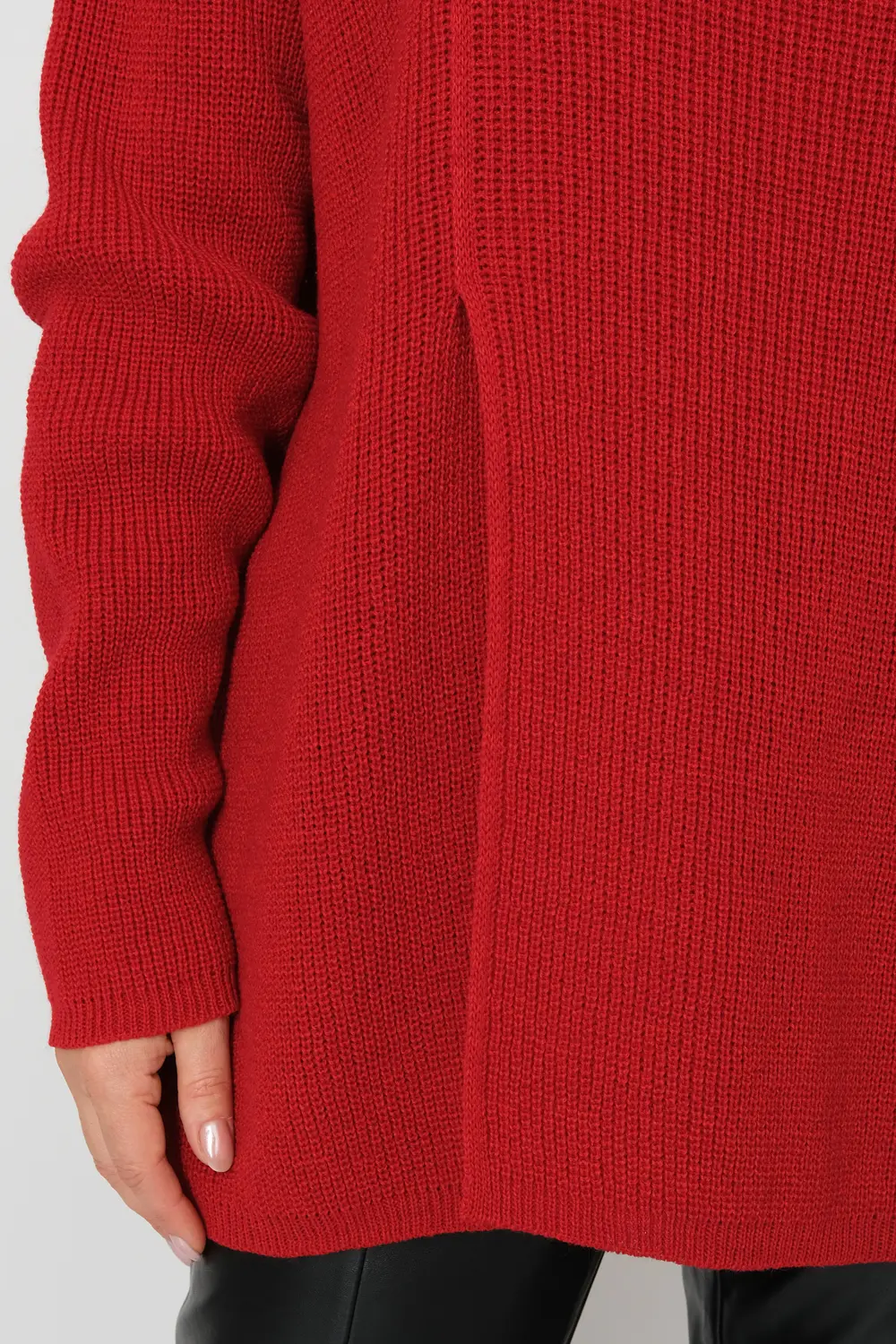 Джемпер оверсайз с воротом-стойкой. Рукава длинные со спущенным плечом. По переднему полотну изделия сбоку стильный глубокий разрез.