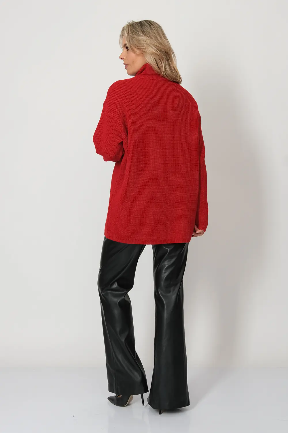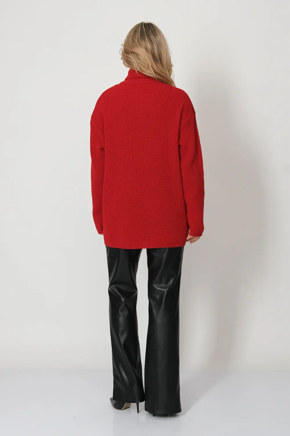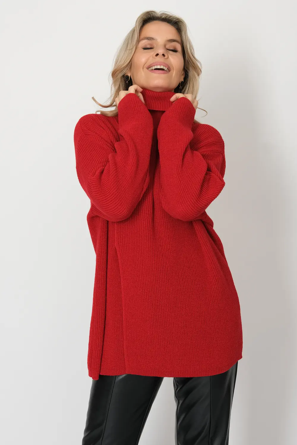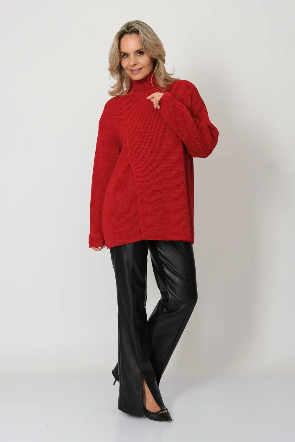 Джемпер оверсайз с воротом-стойкой. Рукава длинные со спущенным плечом. По переднему полотну изделия сбоку стильный глубокий разрез.