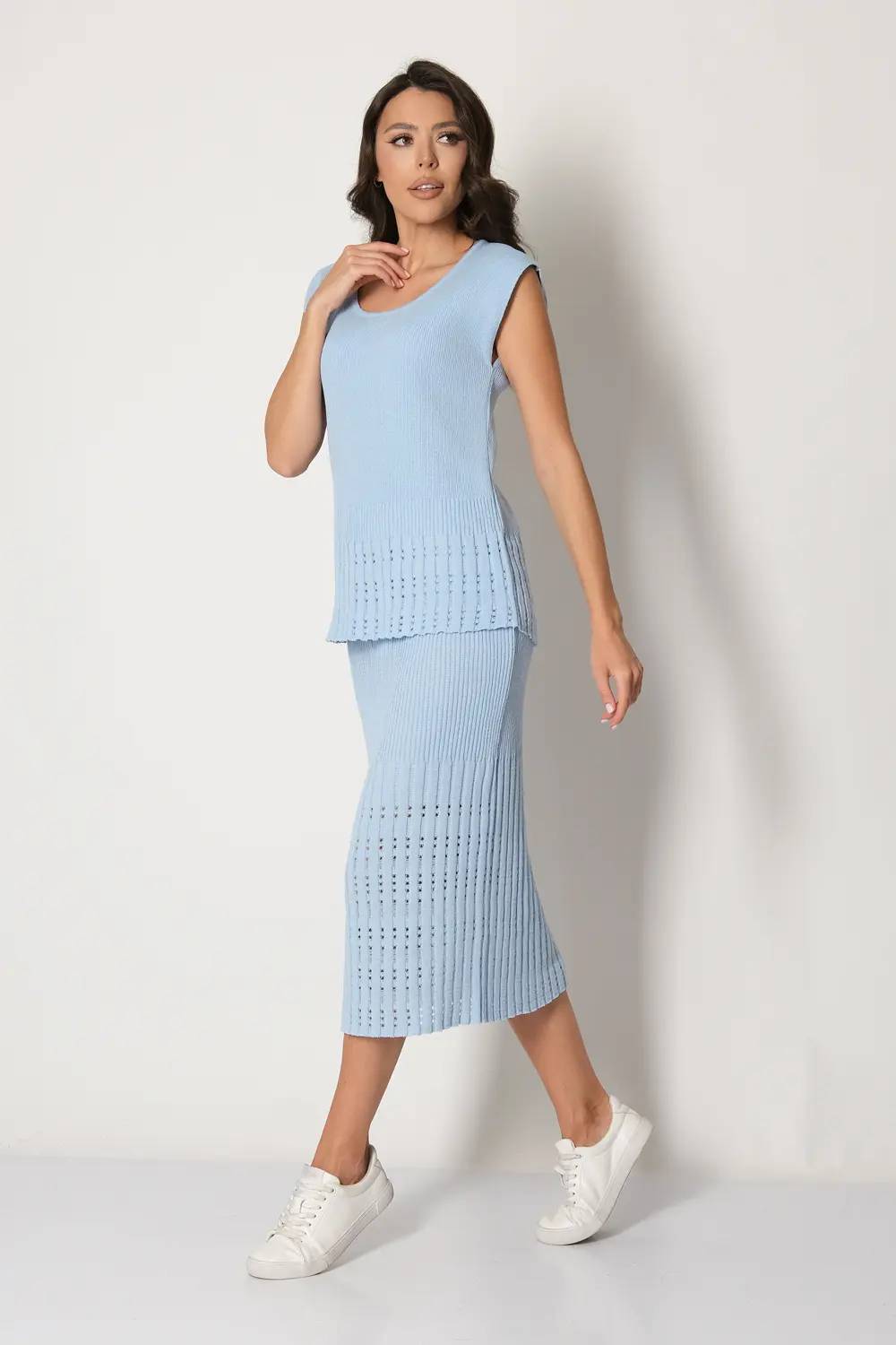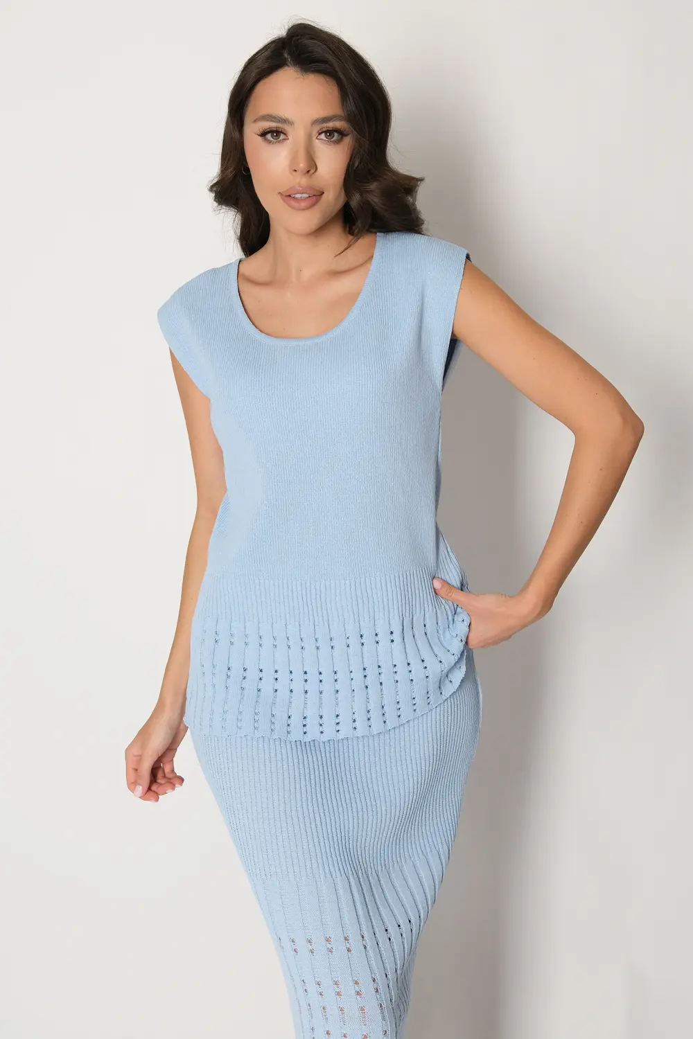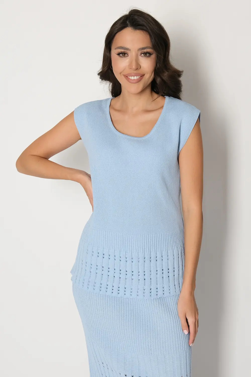 Женский вязаный джемпер полуприлегающего силуэта со спущенным плечом. Джемпер выполнен кулирной гладью, нижняя треть изделия переплетением-лапша с эффектом перфорации. Джемпер можно носить в комплекте с юбкой, вывязанной аналогичным переплетением и узором. Артикул юбок И 014, И 014дл, И 017.