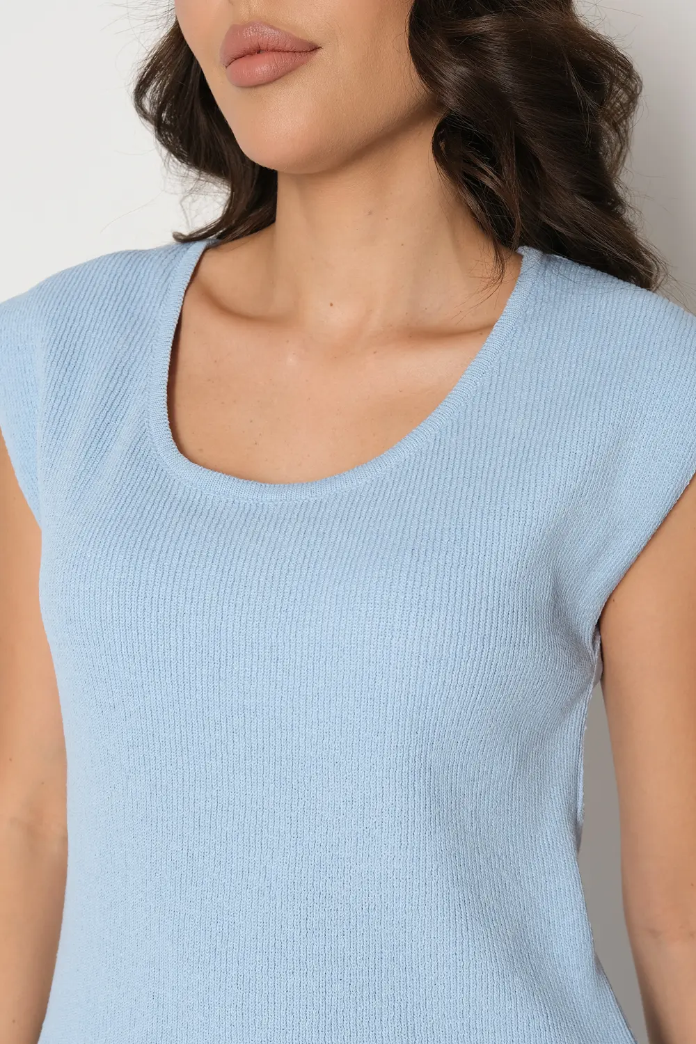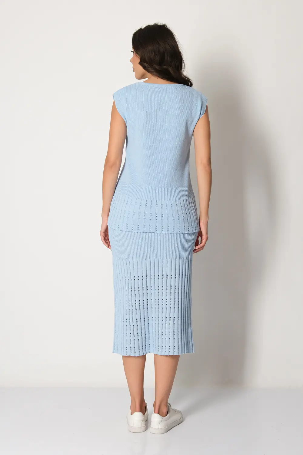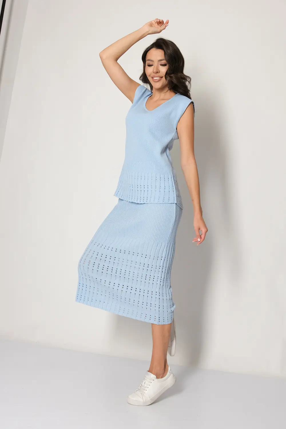 Женский вязаный джемпер полуприлегающего силуэта со спущенным плечом. Джемпер выполнен кулирной гладью, нижняя треть изделия переплетением-лапша с эффектом перфорации. Джемпер можно носить в комплекте с юбкой, вывязанной аналогичным переплетением и узором. Артикул юбок И 014, И 014дл, И 017.