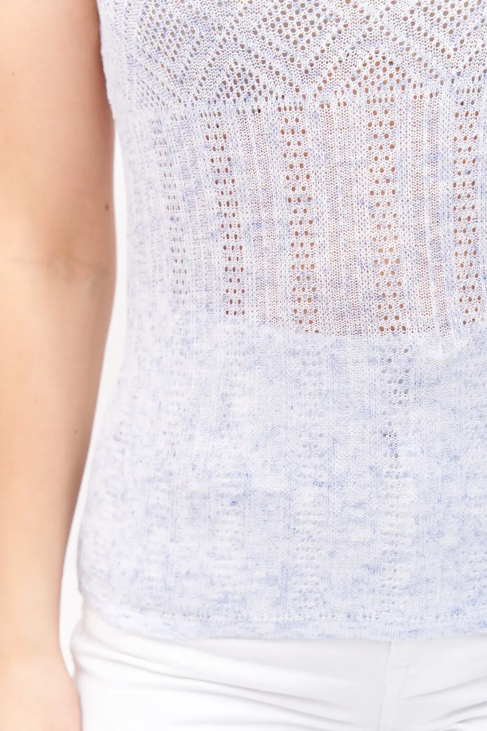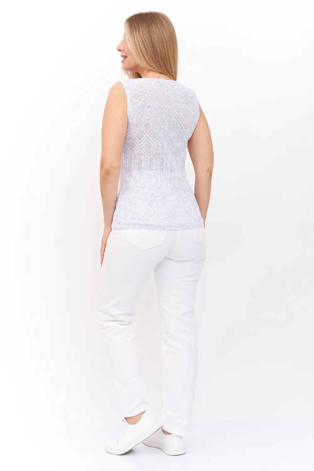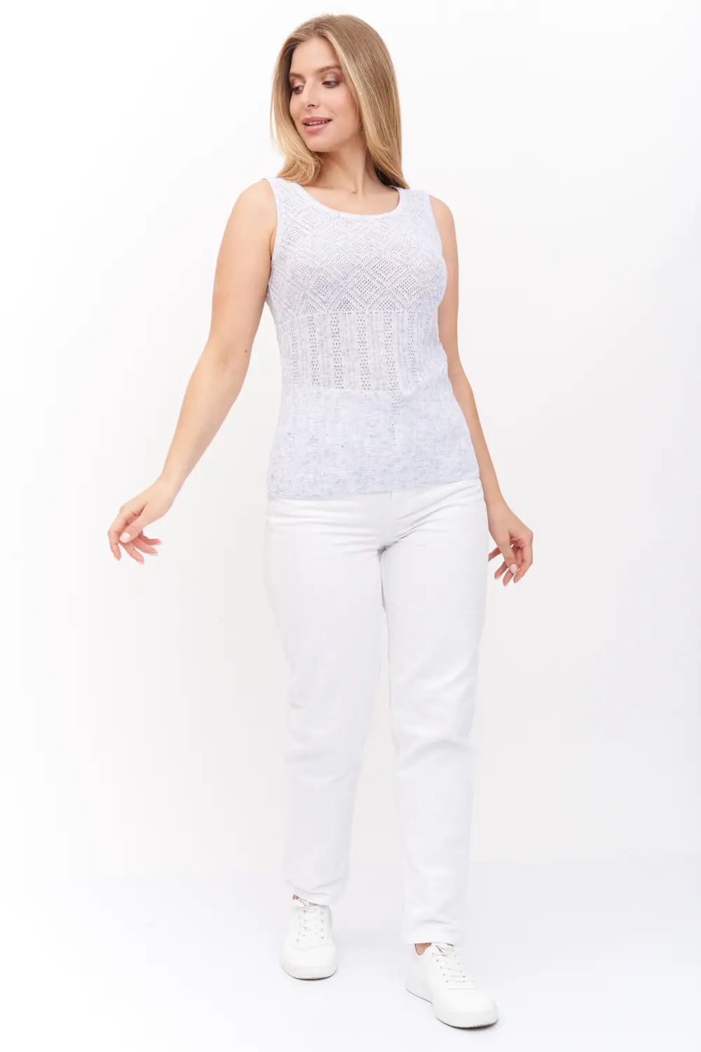 Легкий летний женский ажурный трикотажный джемпер-майка. Вырез горловины круглый. Джемпер выполнен ажурным переплетением, низ изделия, вырез горловины и пройймы рукавов выполнены эластичным переплетением.