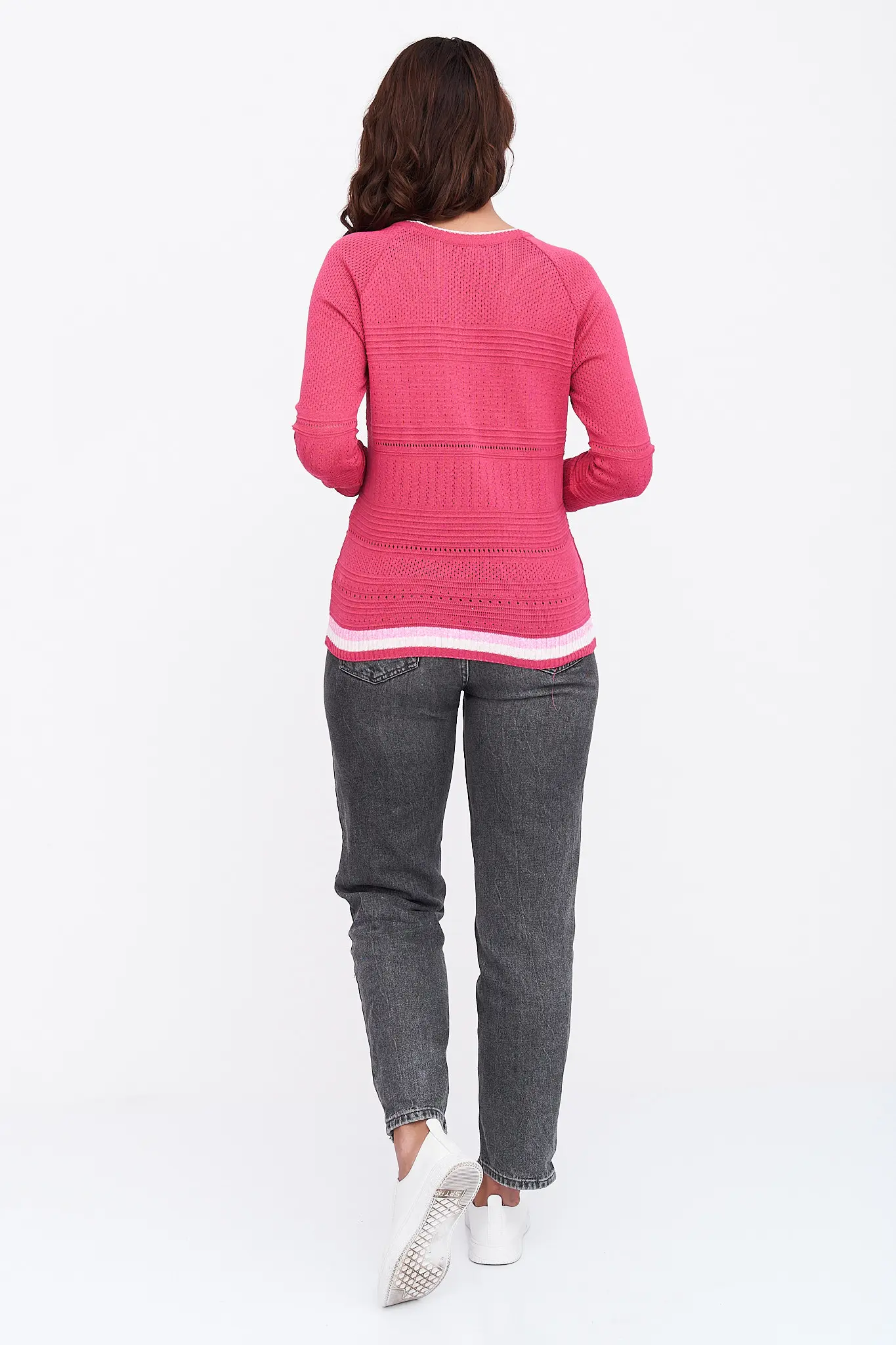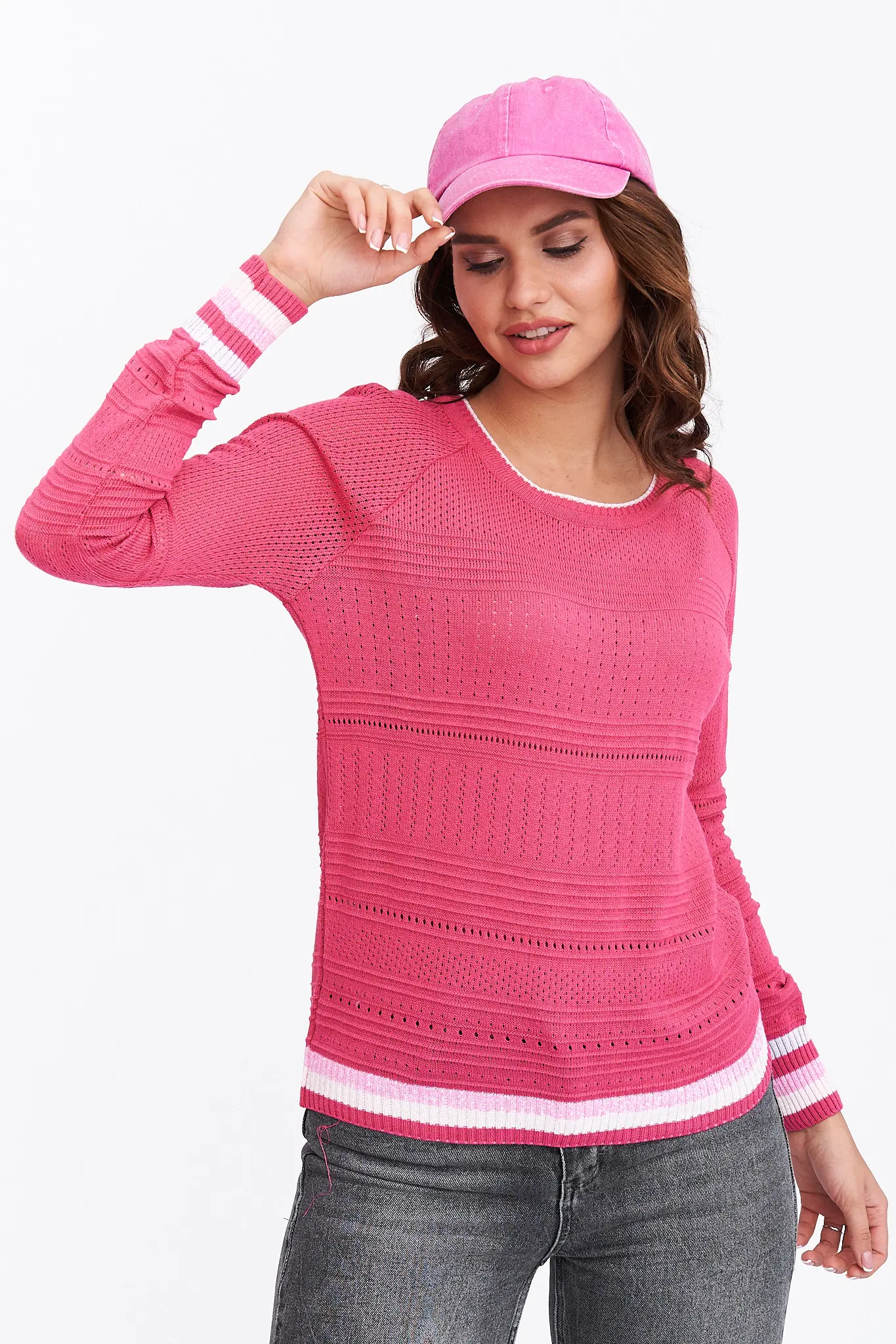 Женский трикотажный джемпер полуприлегающего силуэта. Рукава реглан длинные. Горловина круглой формы. Джемпер выполнен сочетание ажурного и структурного переплетения. Манжеты и низ рукавов выполнены эластичным переплетением с сочетанием полос контрастного цвета.