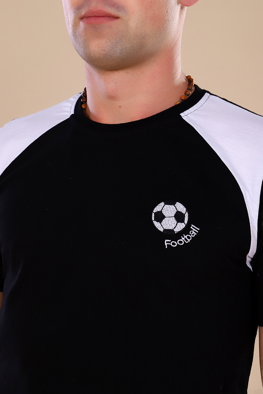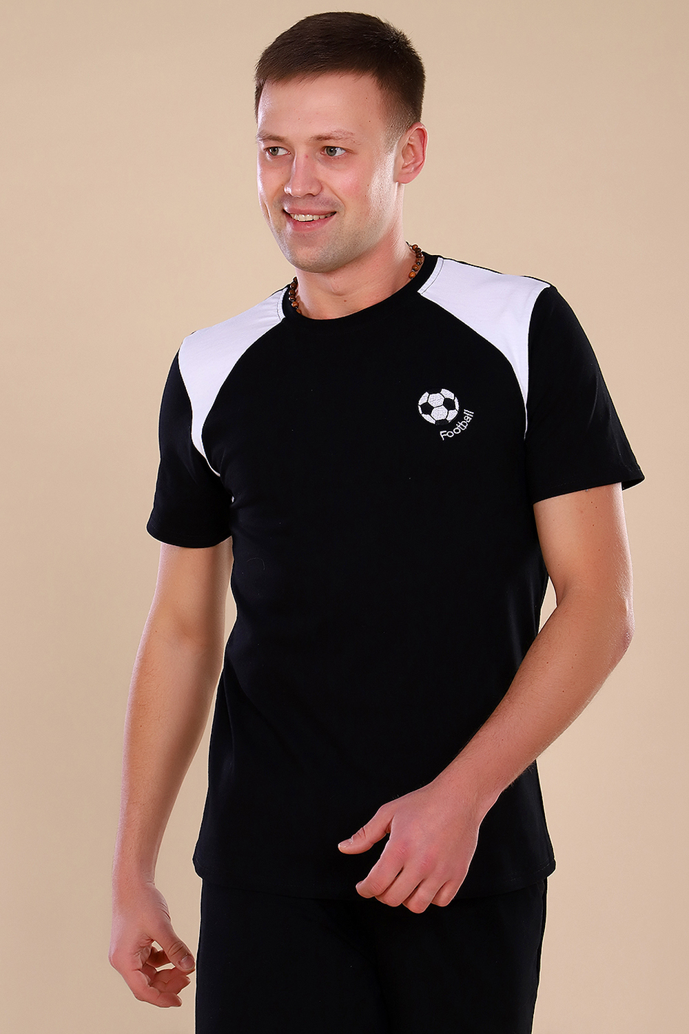 Футболка мужская комбинированная с коротким со втачным рукавом. Данная модель выполнена из трикотажного полотна (кулирка 100% хлопок с плотностью 180гр.). Горловина обработана трикотажным эластичным полотном (рибана с лайкрой). На полочке присутствует отрезная вставка и вышивка с символикой вашего любимого спорта (футбол). Отлично подходит для прогулок и отдыха и спорта.