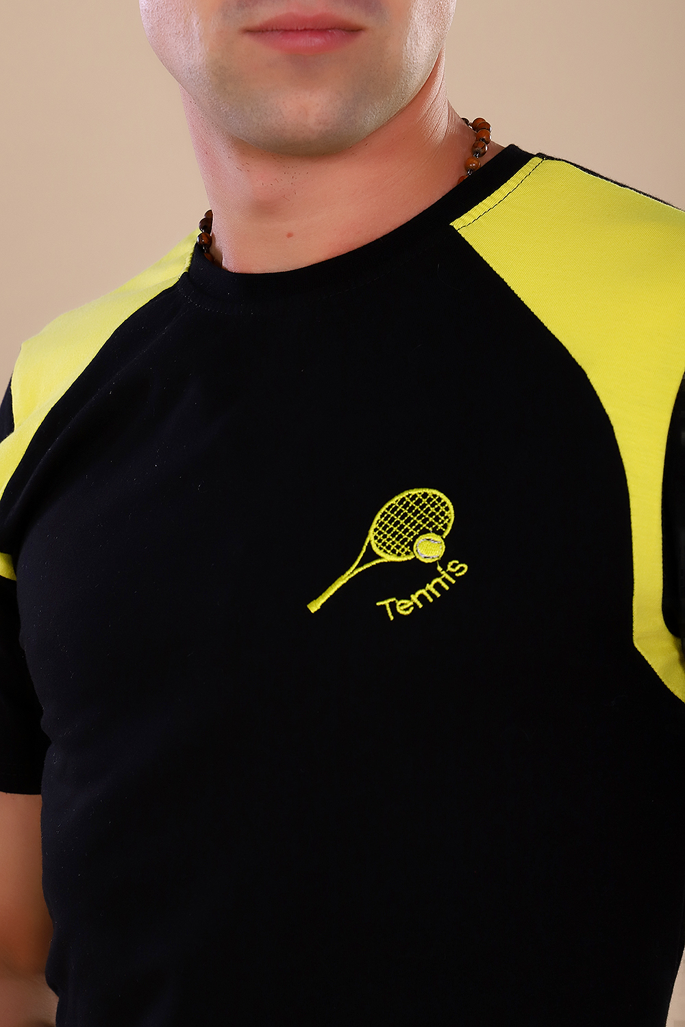 Футболка мужская комбинированная с коротким со втачным рукавом. Данная модель выполнена из трикотажного полотна (кулирка 100% хлопок с плотностью 180гр.). Горловина обработана трикотажным эластичным полотном (рибана с лайкрой). На полочке присутствует отрезная вставка и вышивка с символикой вашего любимого спорта (теннис). Отлично подходит для прогулок и отдыха и спорта.