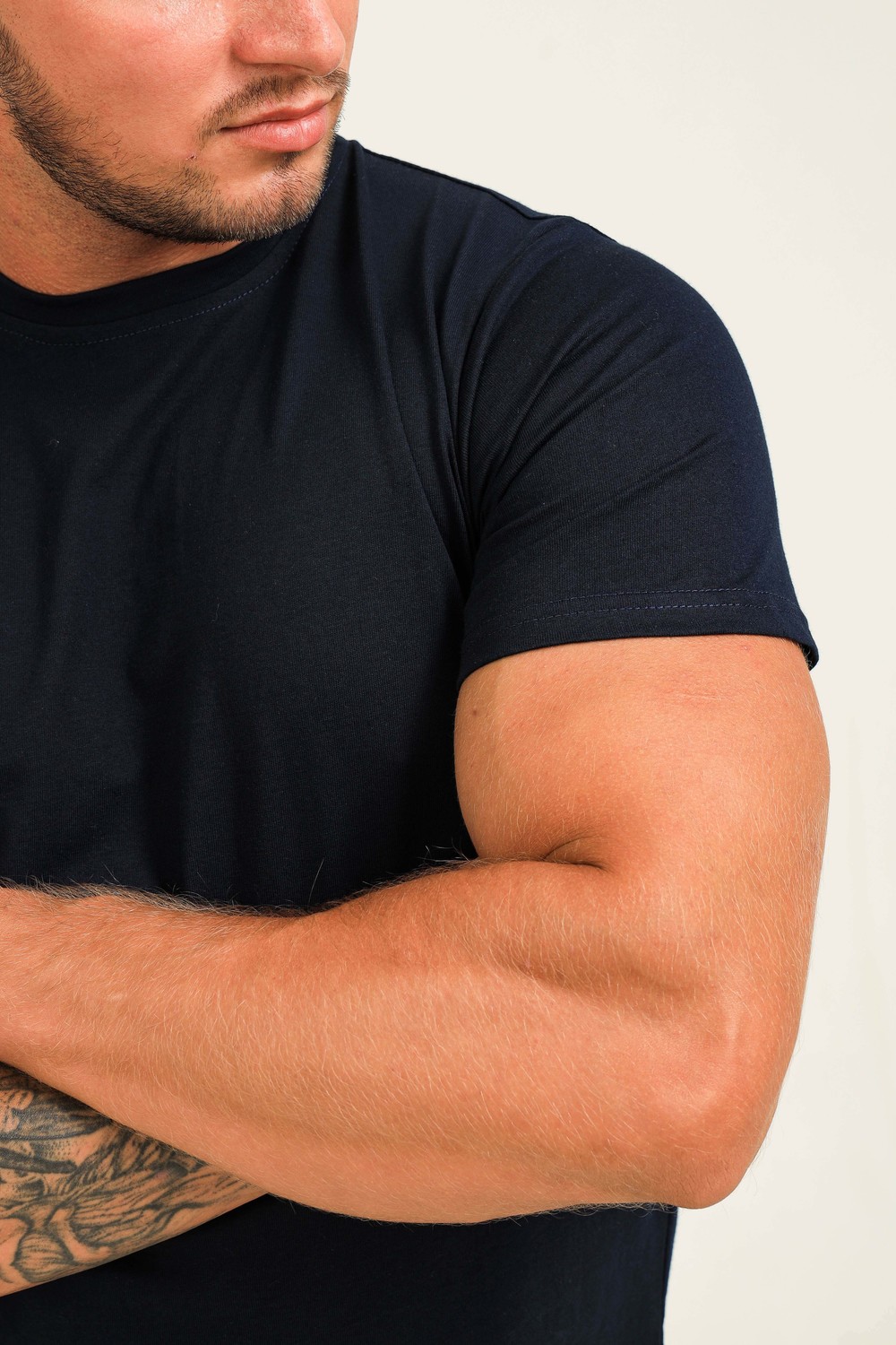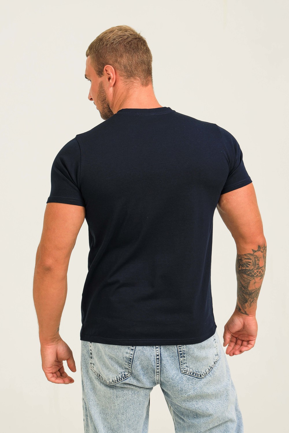 Мужская футболка однотонная, представлена в 3 базовых цветах - белый, черный, темно-синий. Спинка горловины отделана усилением. Плотная, износостойкая ткань не просвечивает и не вытягивается. Плотность ткани 190гр/м2. Размер на модели 52.