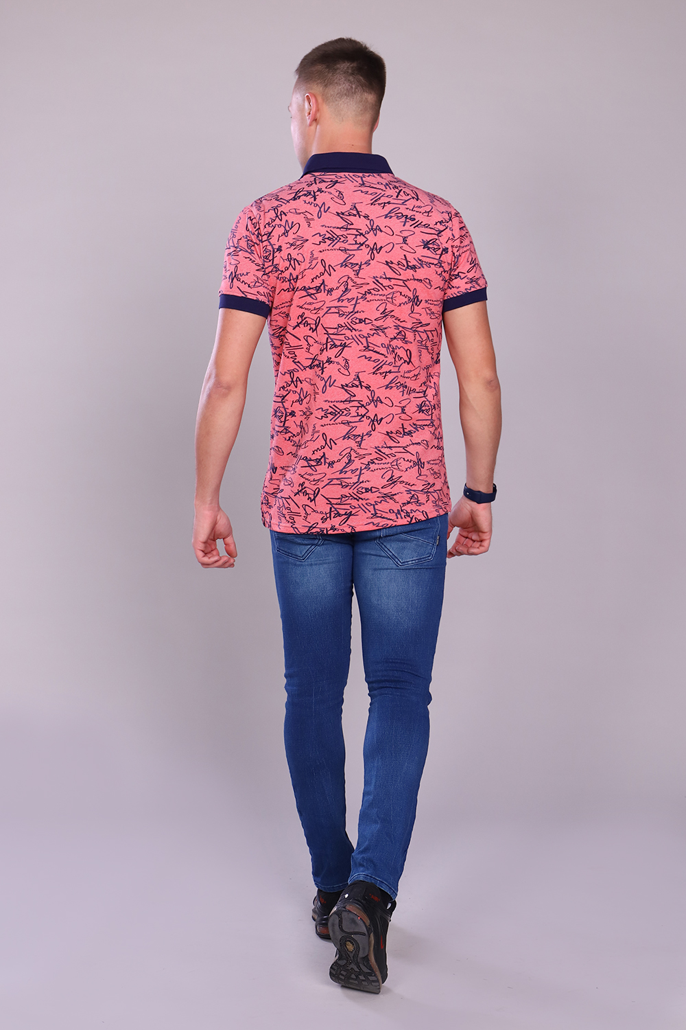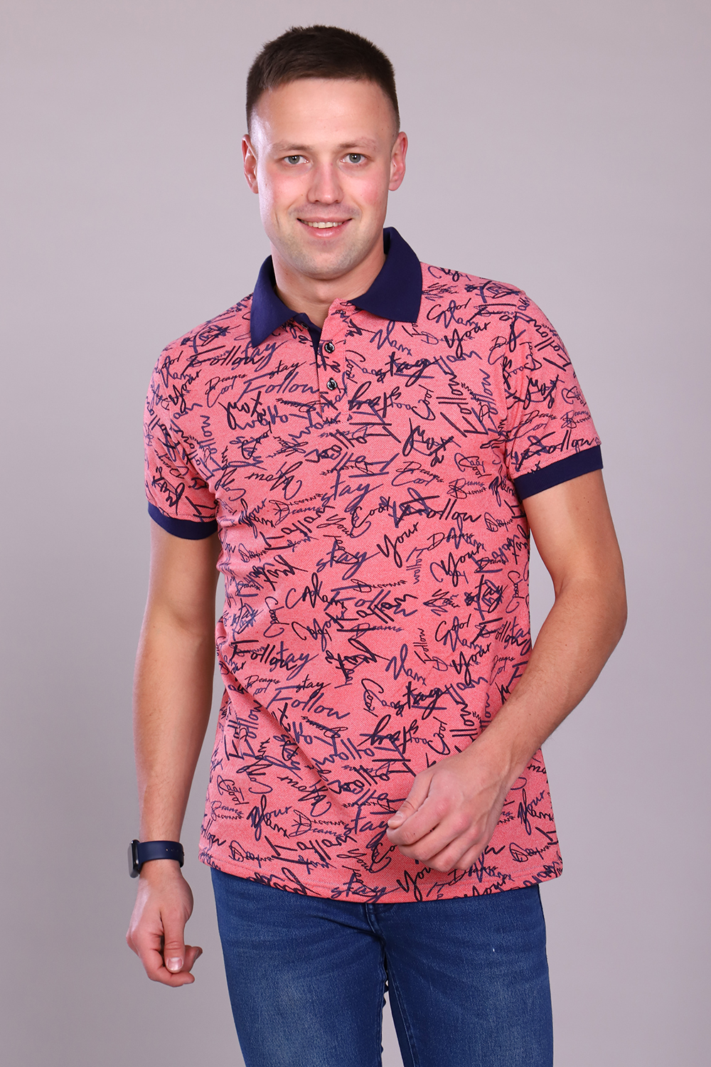 Футболка поло ткань пике лакост с рисунком в виде надписей. Воротник и манжеты вязаные, темно-синего или черного цвета. Планка на трех пуговицах. Для дома, отдыха, прогулок и спорта. Сохраняет цвет и форму после стирки.
