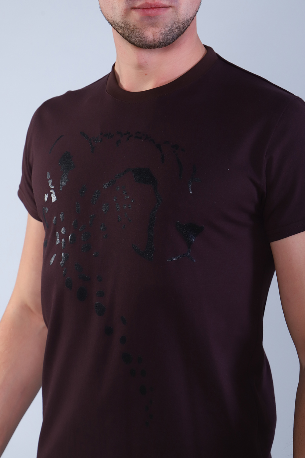Мужская футболка из мягкого, хлопкового трикотажа с оригинальным принтом в виде гепарда. Футболка прямого силуэта, круглая горловина обработана эластичной рибаной, короткий втачной рукав. Базовая, приятная к телу, не маркая футболка необходимая вещь в мужском гардеробе. Рост модели на фото 183 см, размер 52