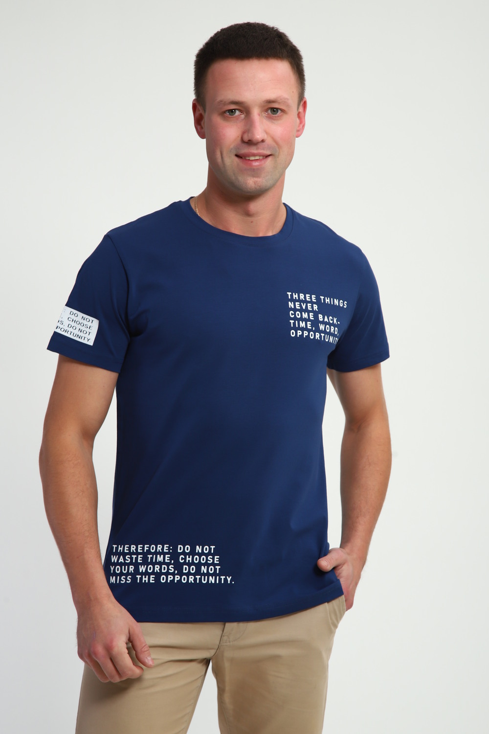 Базовая мужская футболка. Оформлена традиционным круглым неглубоким вырезом, с коротким рукавом. На футболке так же присутствует печать. Стильная футболка займет достойное место в вашем гардеробе: просто выберите ваш цвет.