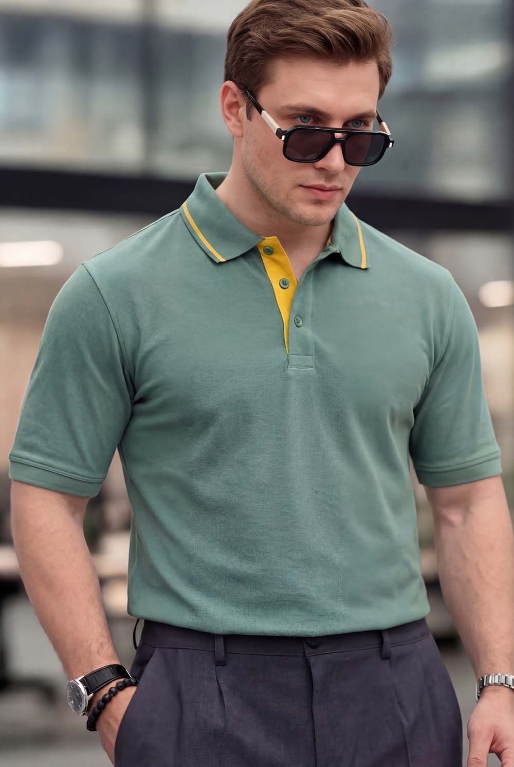 Встречайте современную классику мужское поло трендового зелёного оттенка с яркими жёлтыми акцентами. Эта модель идеально подойдёт как для офисных встреч, так и для прогулок по городу.