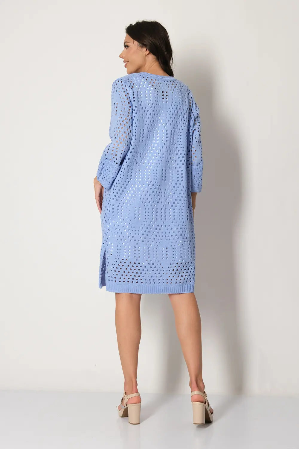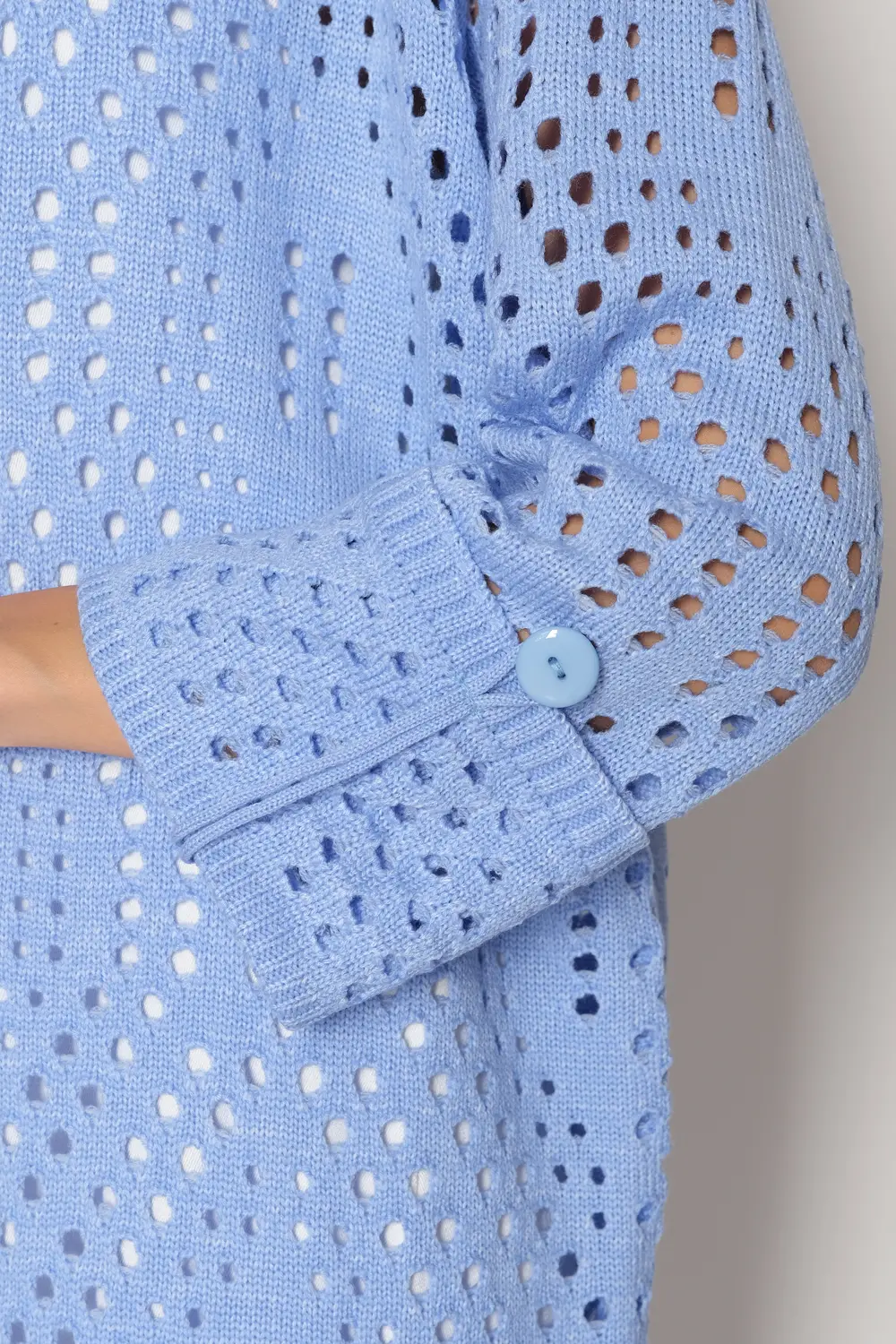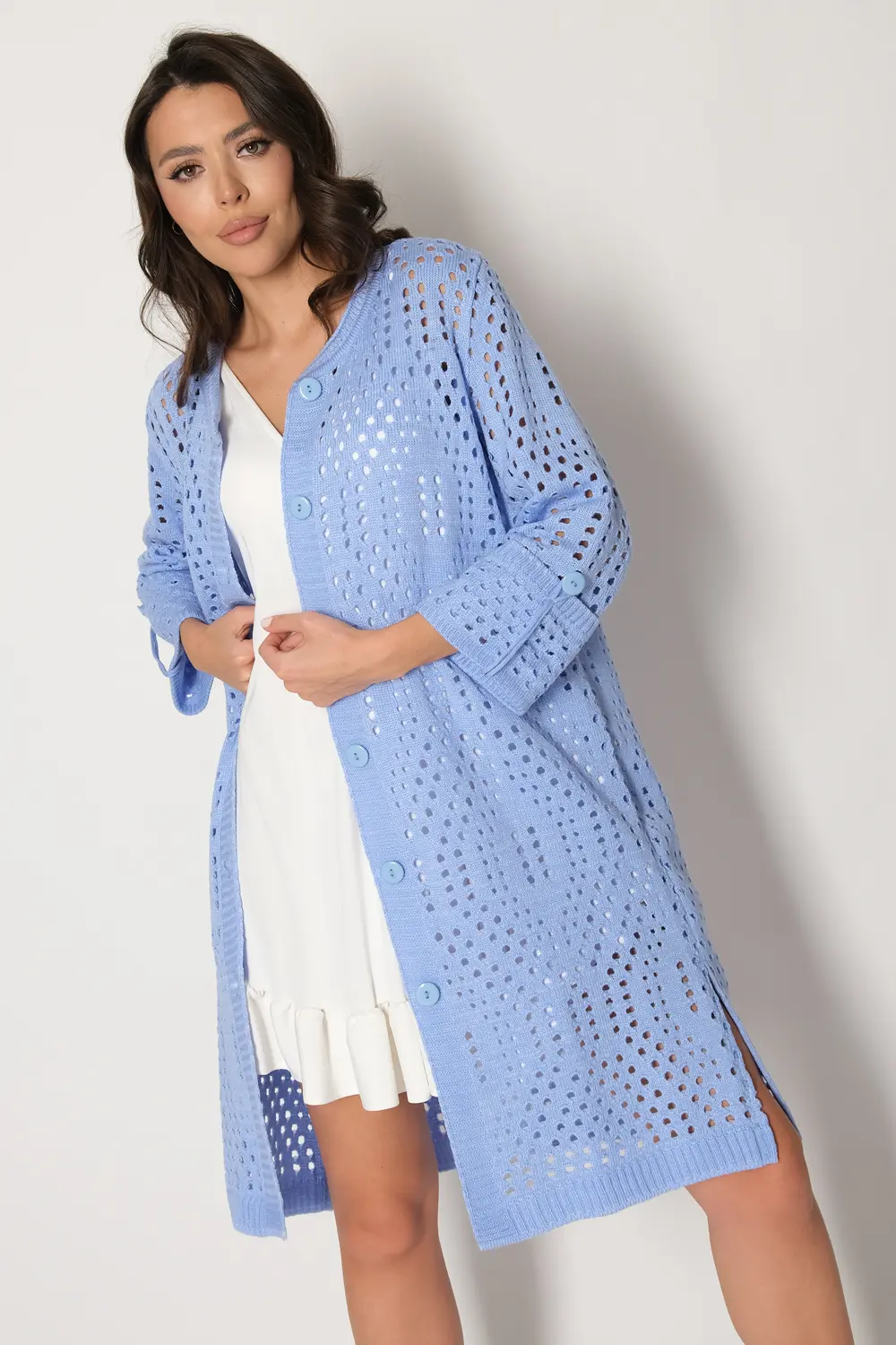 Ажурный кардиган с круглой горловиной, застегивается на крупные пуговицы. Рукава втачные длиной 7/8 с манжетом и патой на пуговице.
