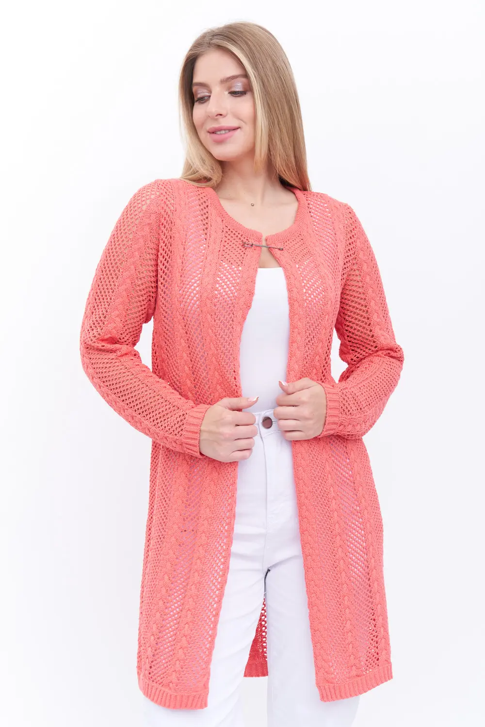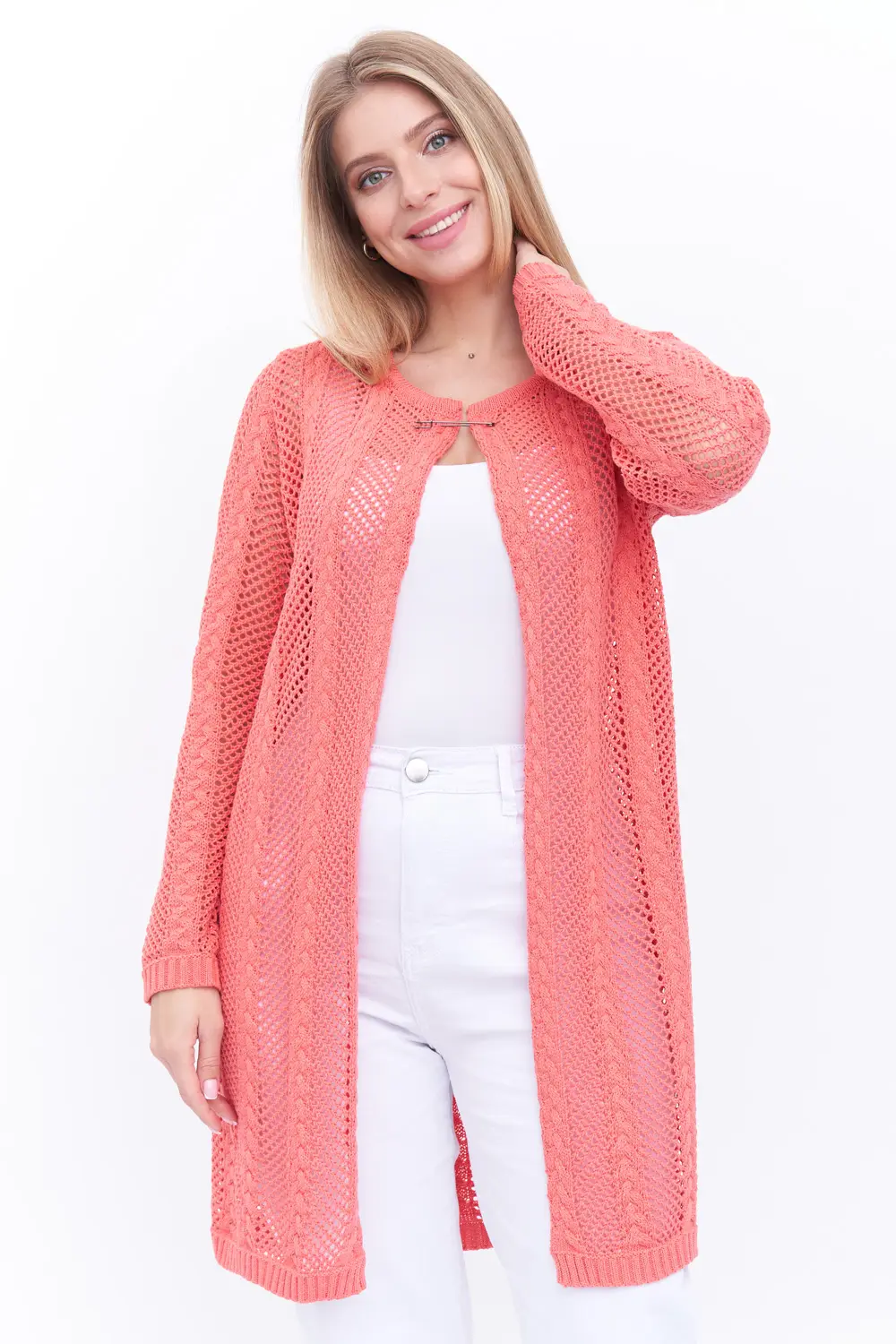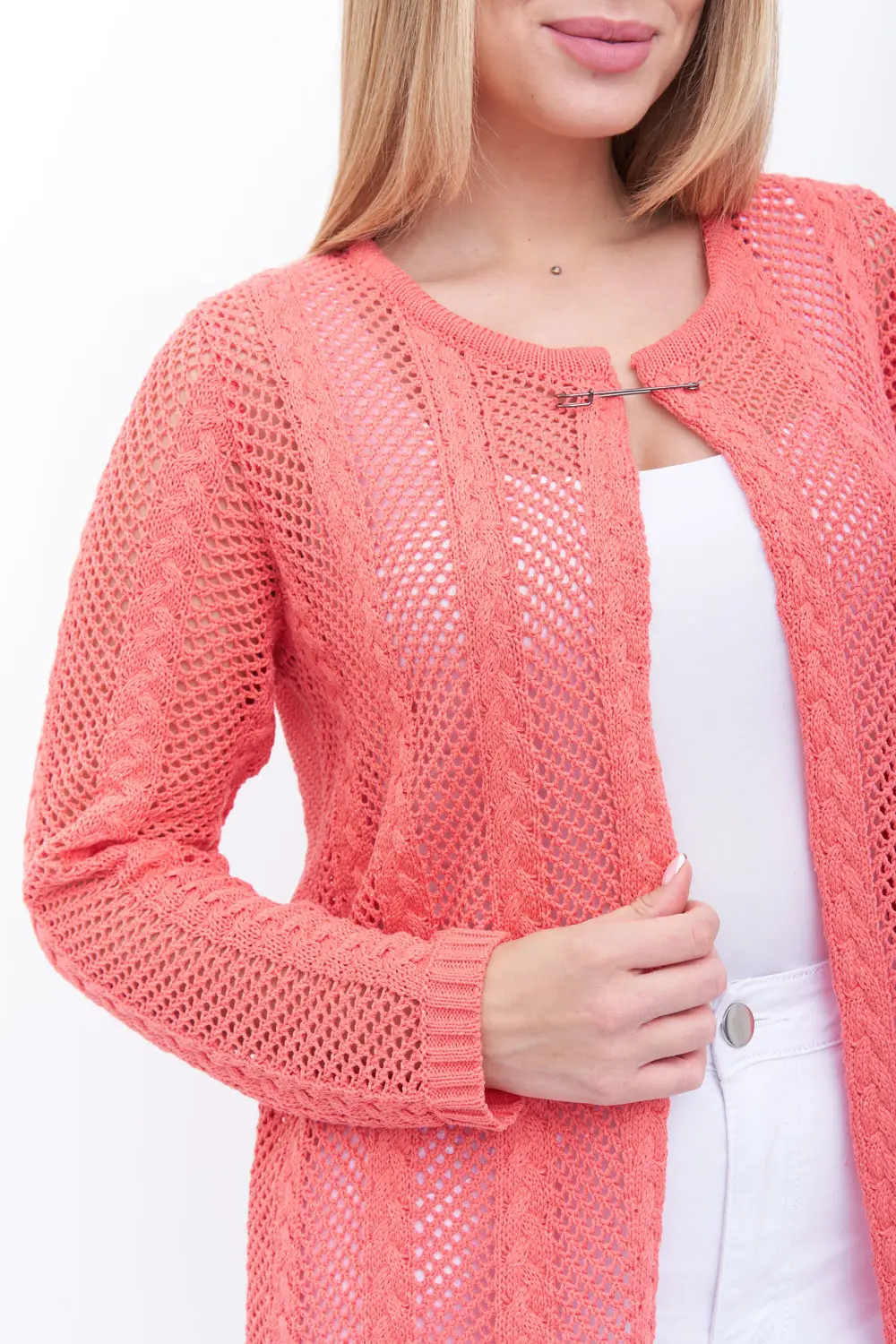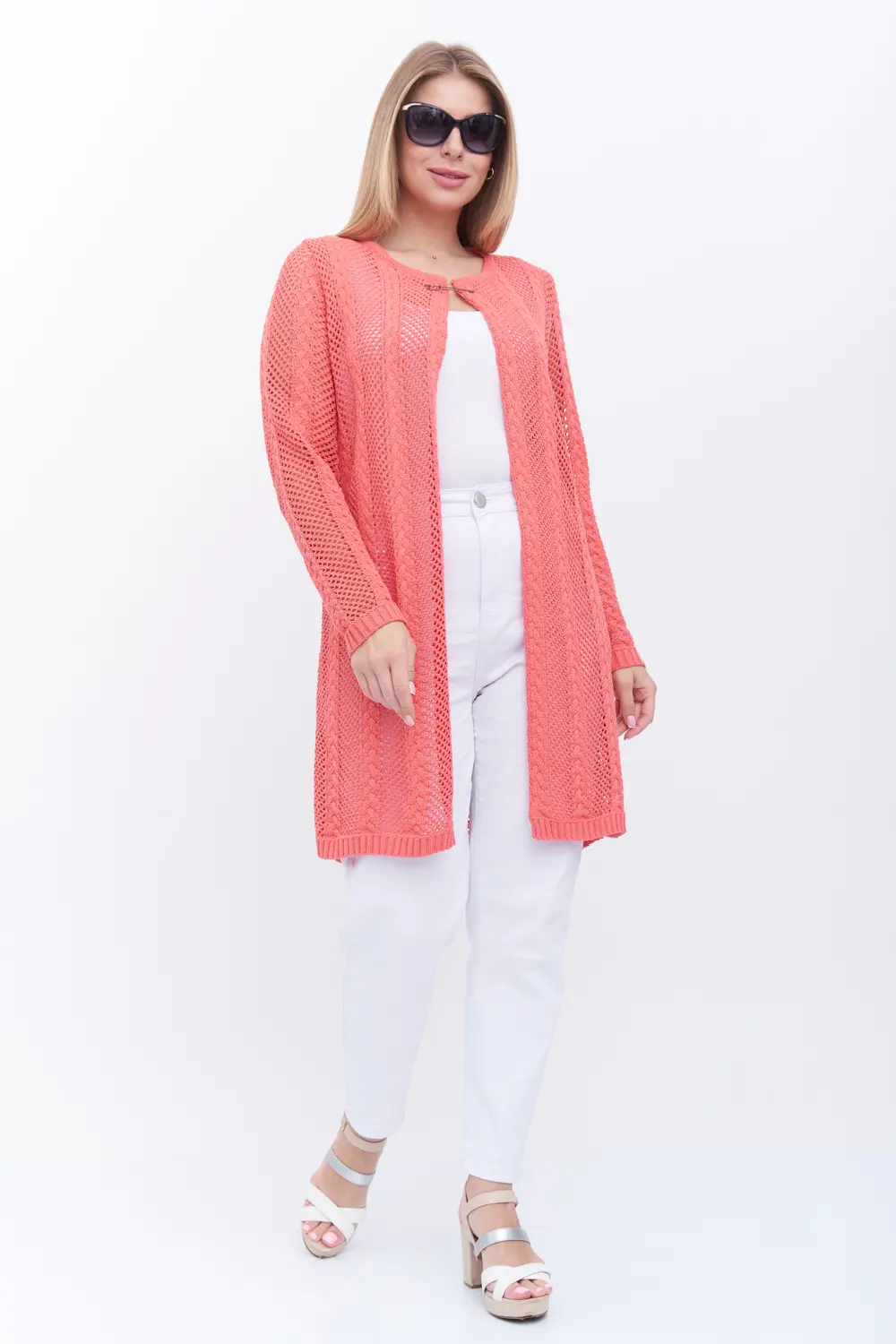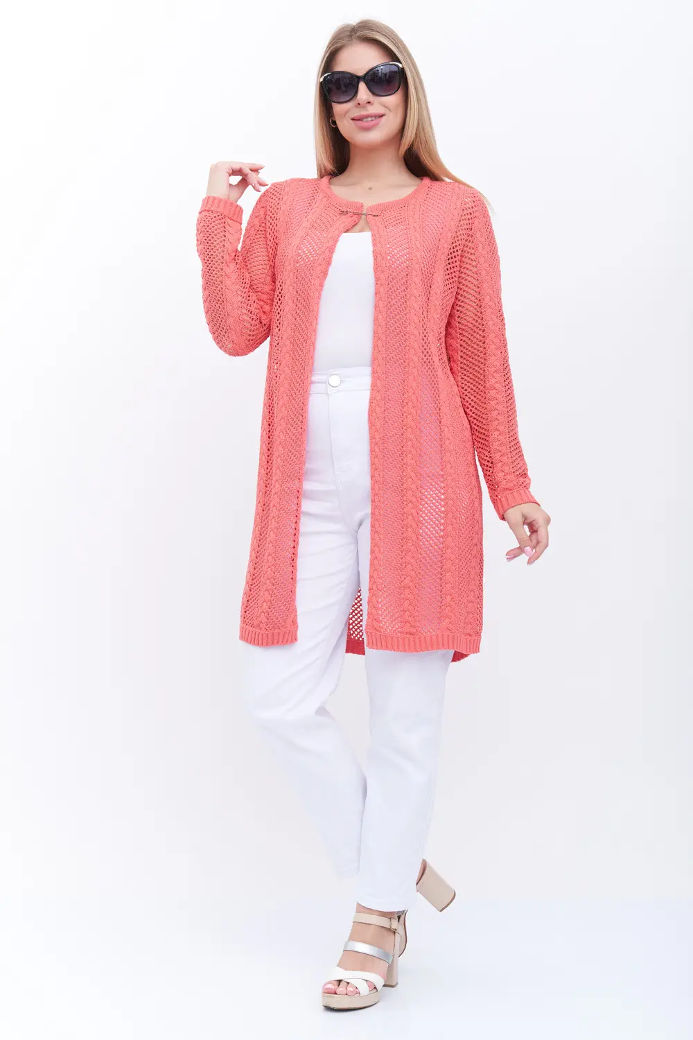 Кардиган женский вязаный, элегантный. В составе 50% хлопка. Ажурный вертикальный узор. Округлая горловина придаёт кардигану выраженную женственность. Рукава втачные, свободные, полной длины. Изделие можно сочетать с брюками и юбками разных фасонов. Декоративные элементы Внимание! Декоративные элементы и фурнитура могут отличаться от заявленного на фото!