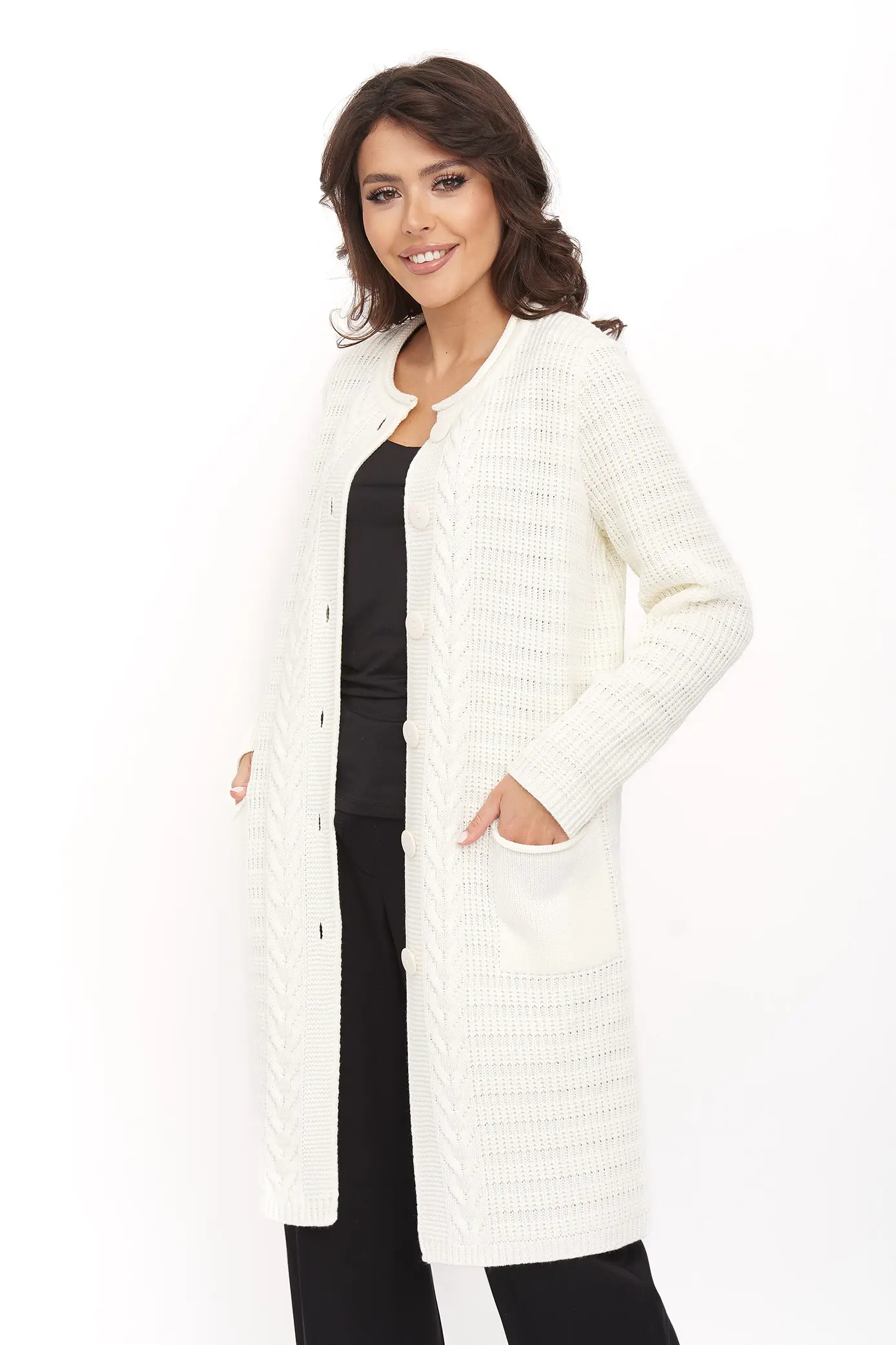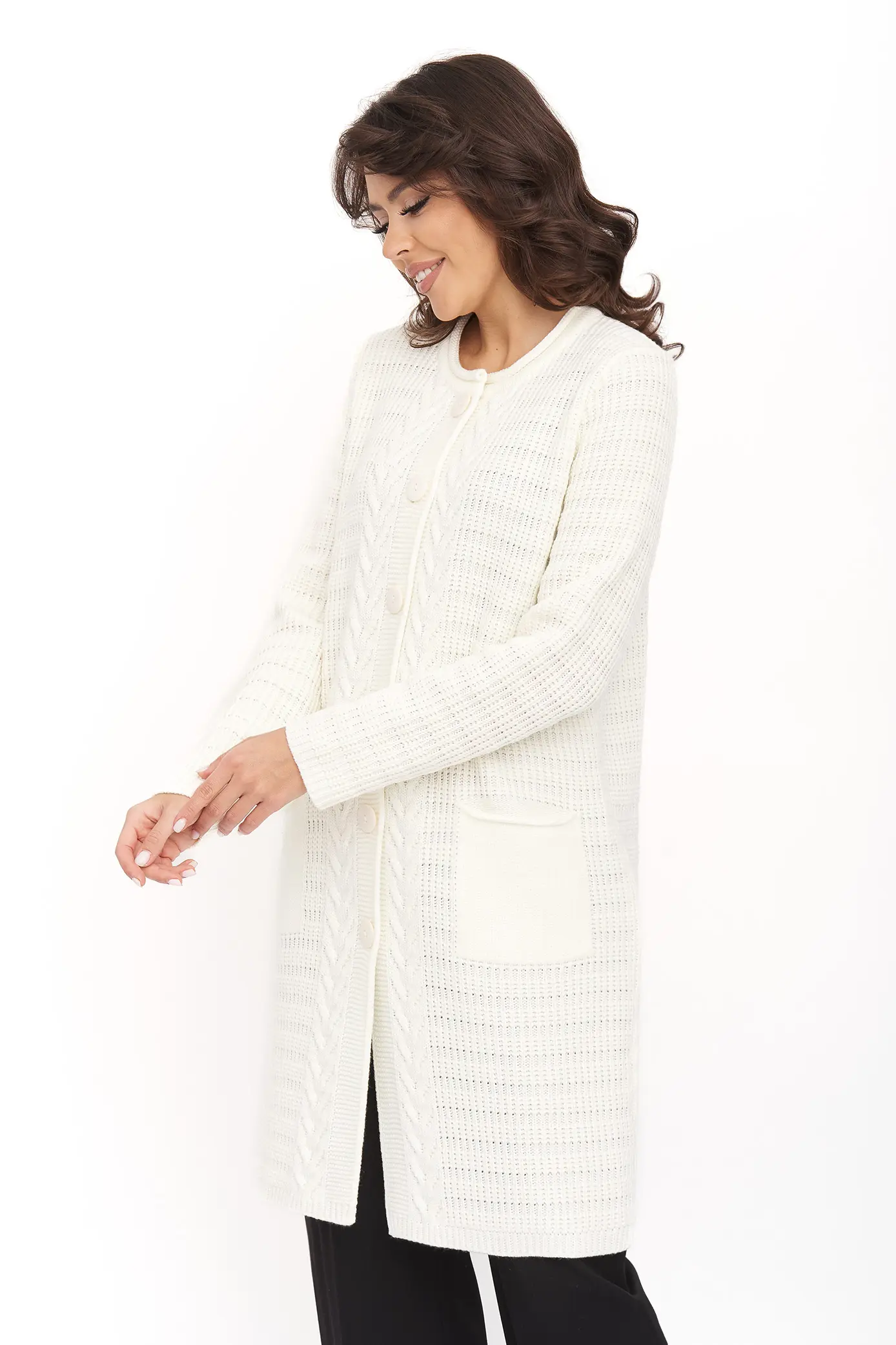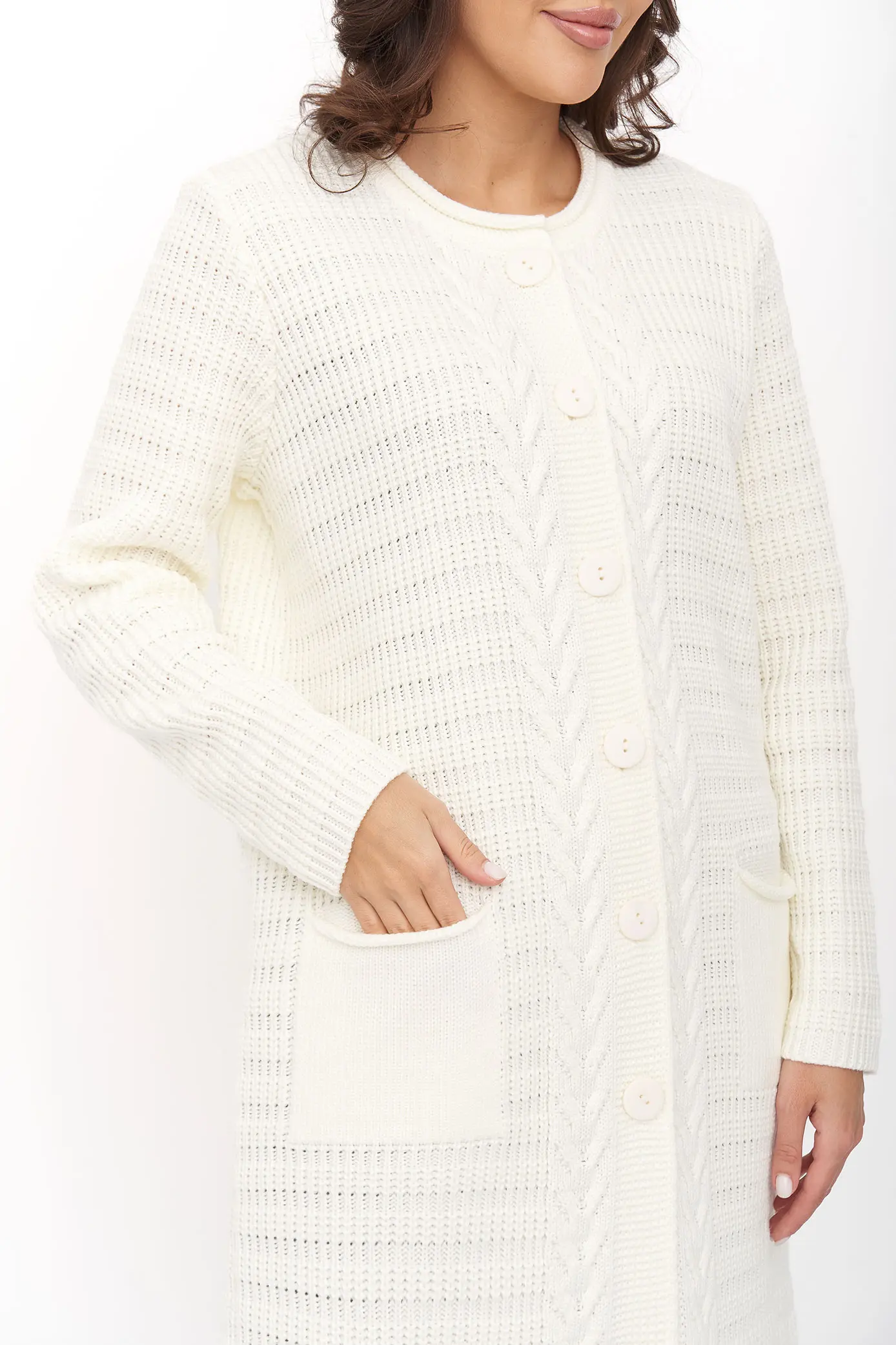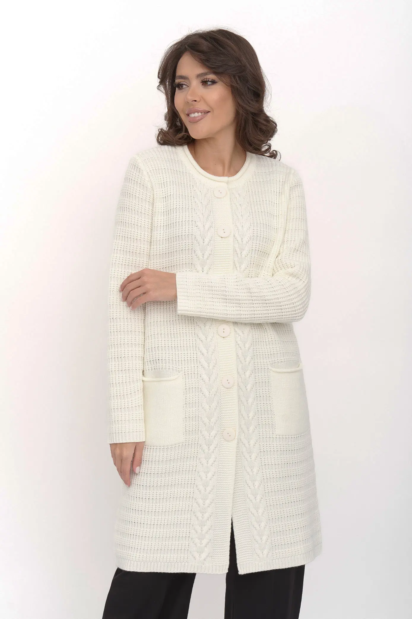 Стильный вязаный женский кардиган прямого силуэта на пуговицах с круглой горловиной. Рукав втачной полной длины. Накладные карманы. Оригинальный узор с ажуром и косами. Кардиган с добавлением шерсти согреет в прохладную погоду и придаст оригинальности любому повседневному образу.