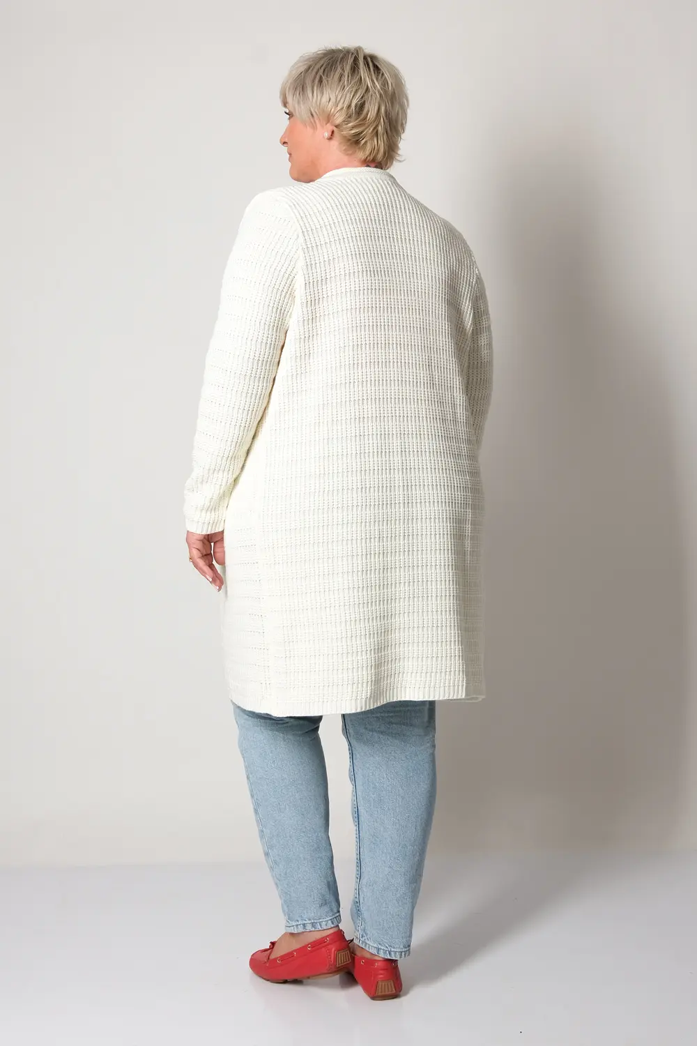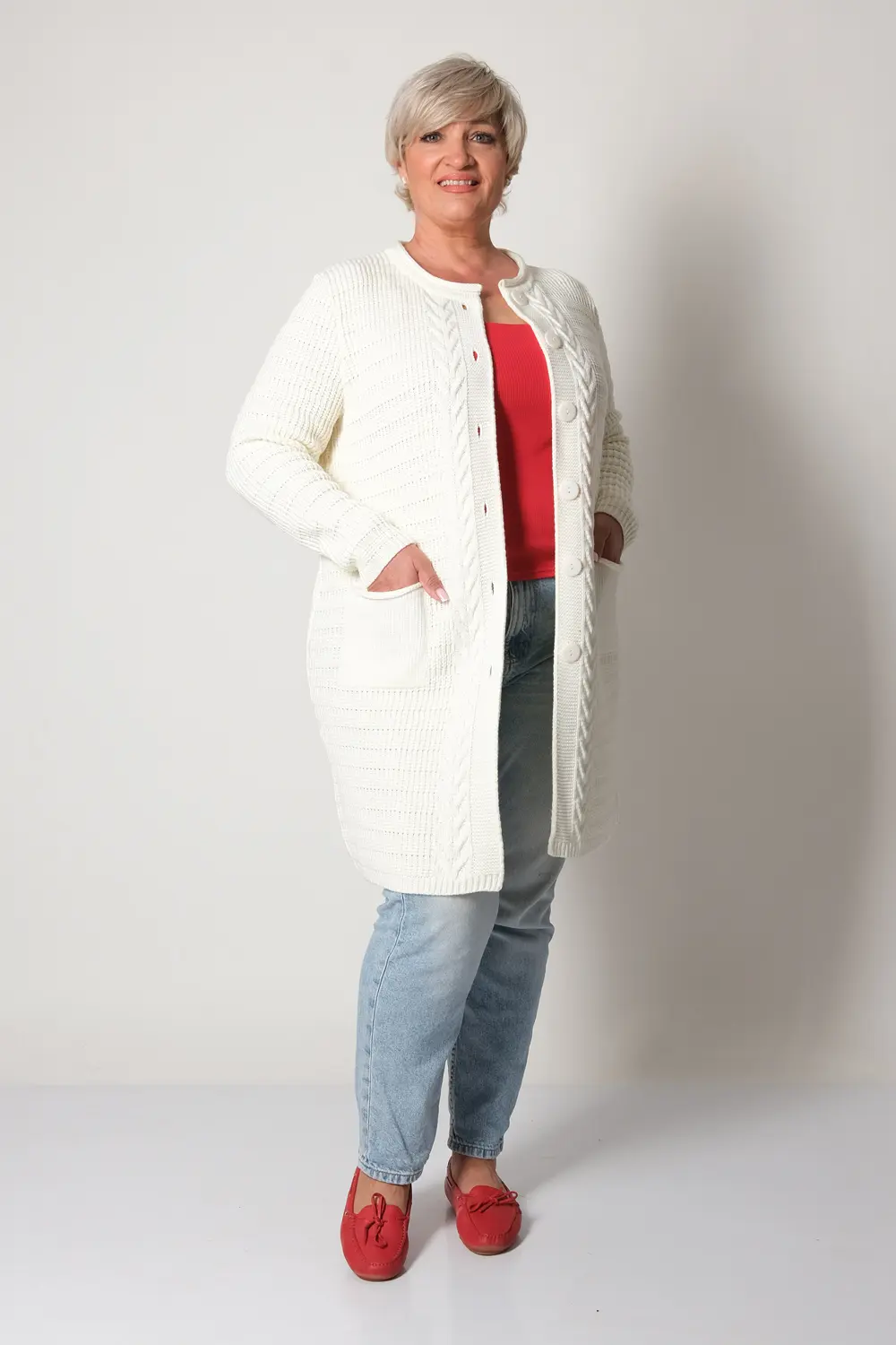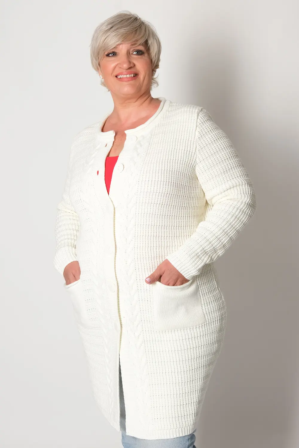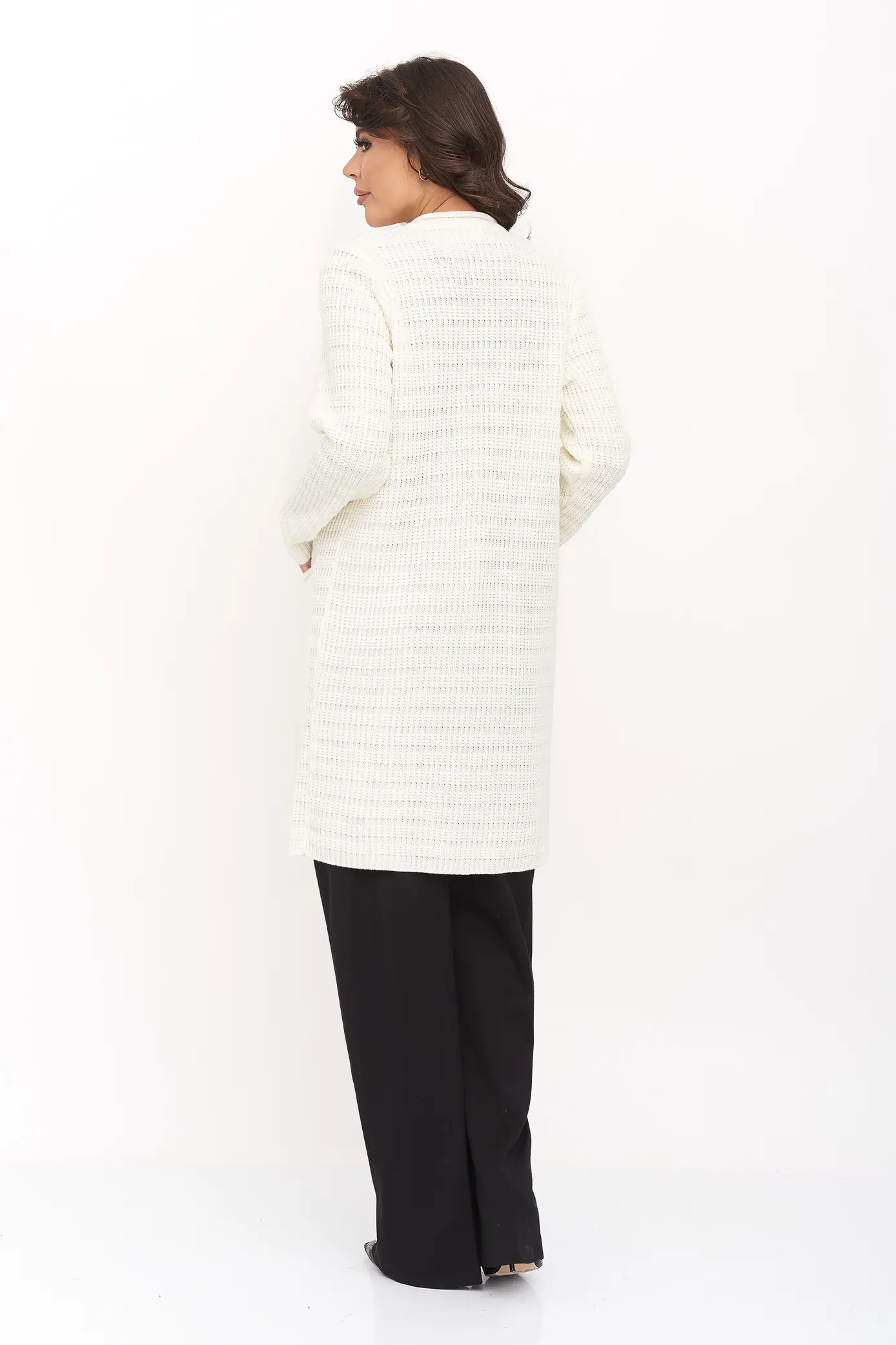 Стильный вязаный женский кардиган прямого силуэта на пуговицах с круглой горловиной. Рукав втачной полной длины. Накладные карманы. Оригинальный узор с ажуром и косами. Кардиган с добавлением шерсти согреет в прохладную погоду и придаст оригинальности любому повседневному образу.