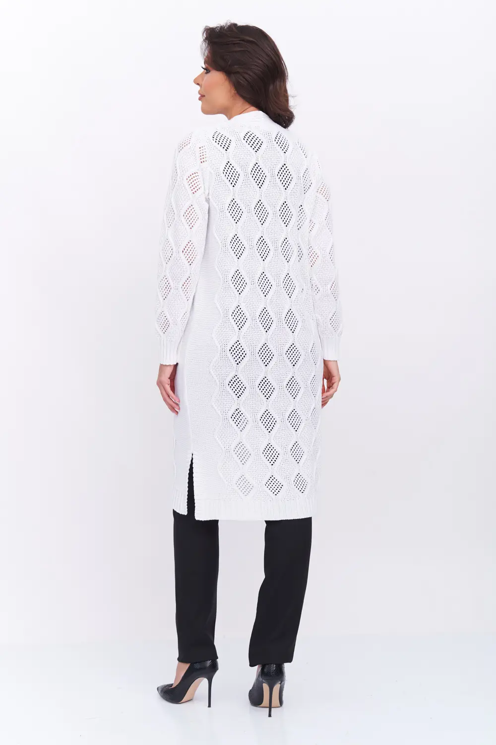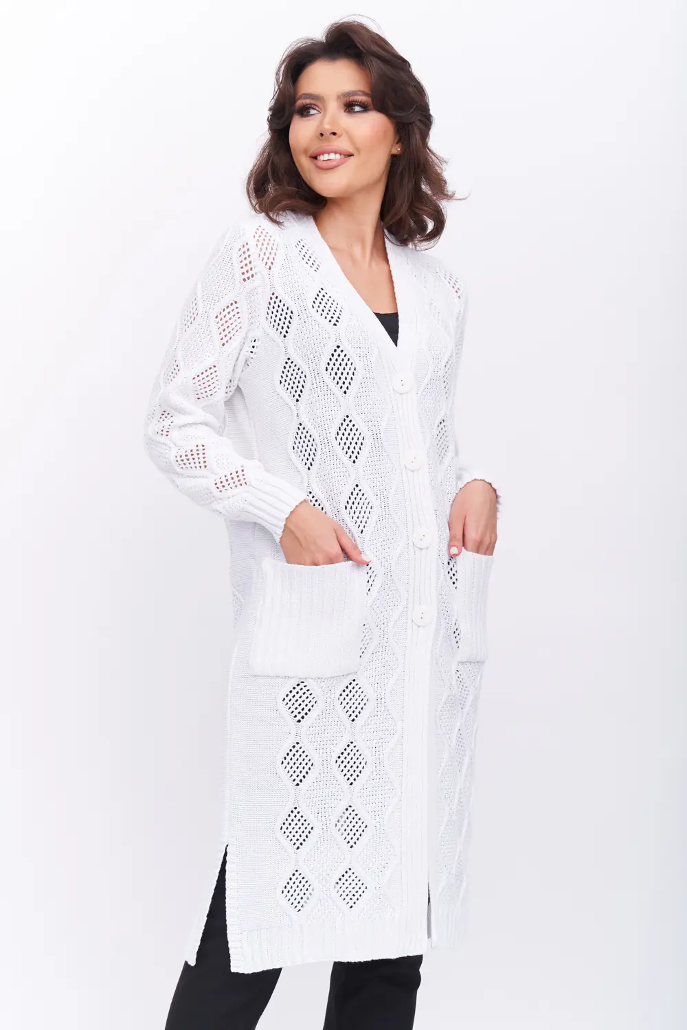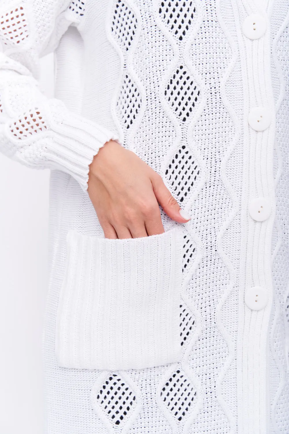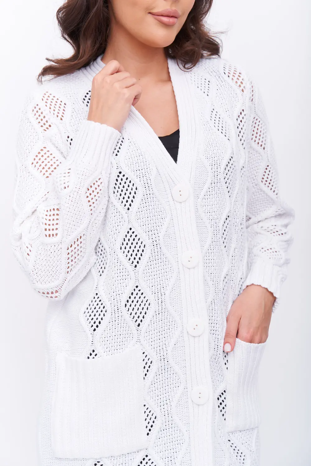 Трикотажный кардиган выполнен сочетанием ажурного и рельефного переплетения.