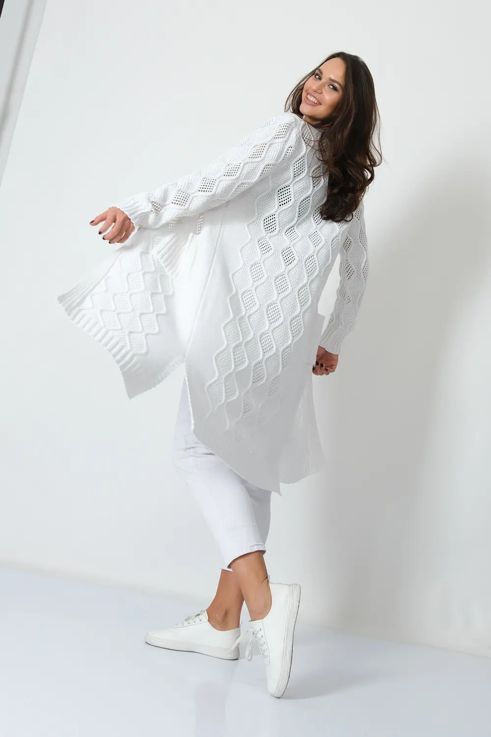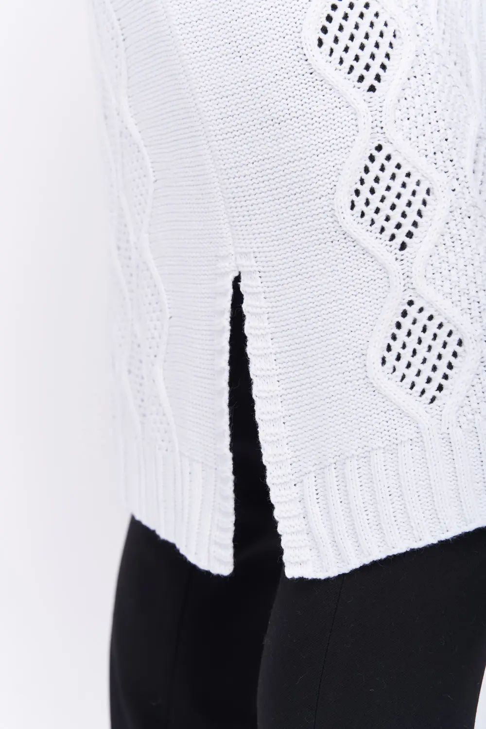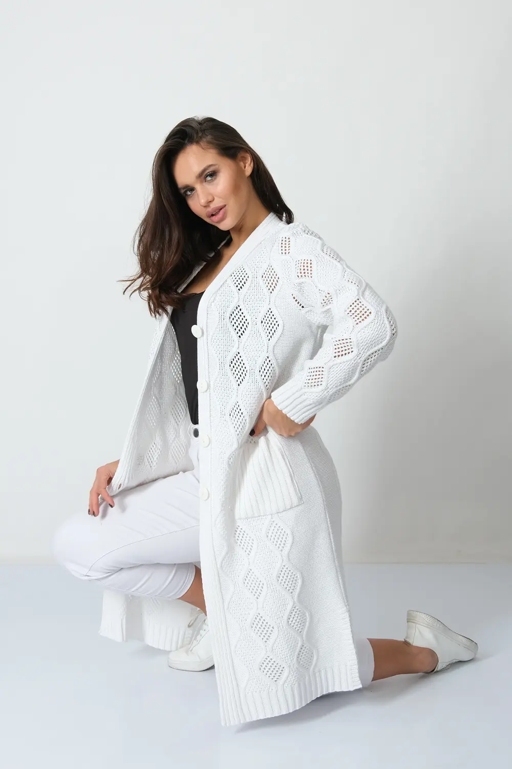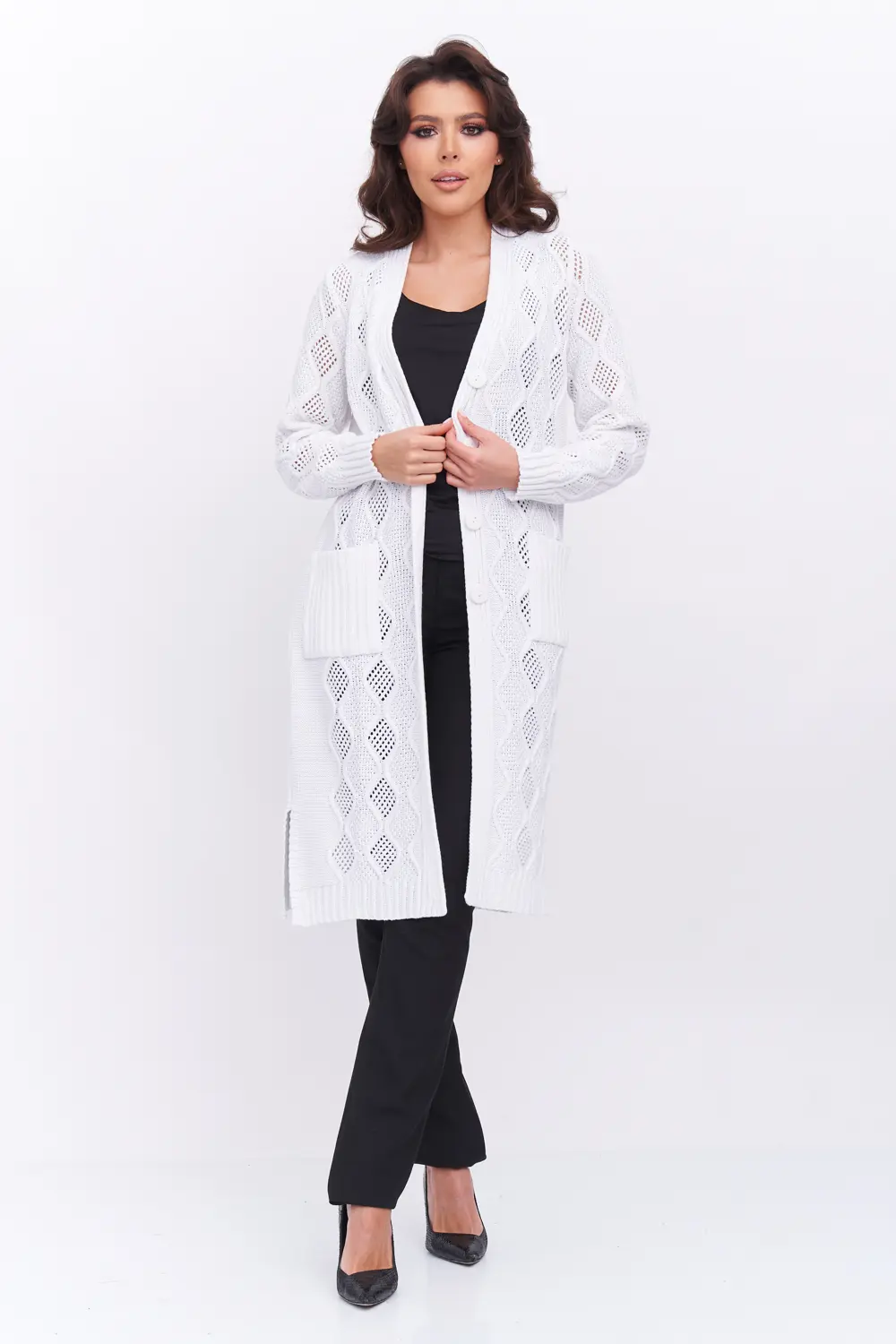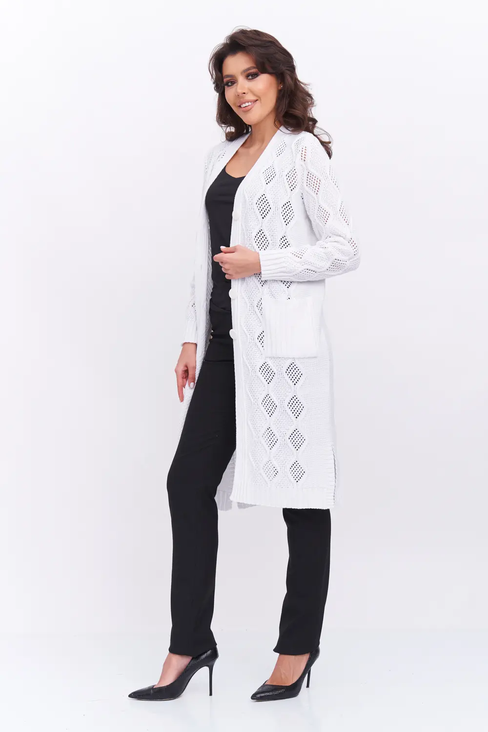 Трикотажный кардиган выполнен сочетанием ажурного и рельефного переплетения.