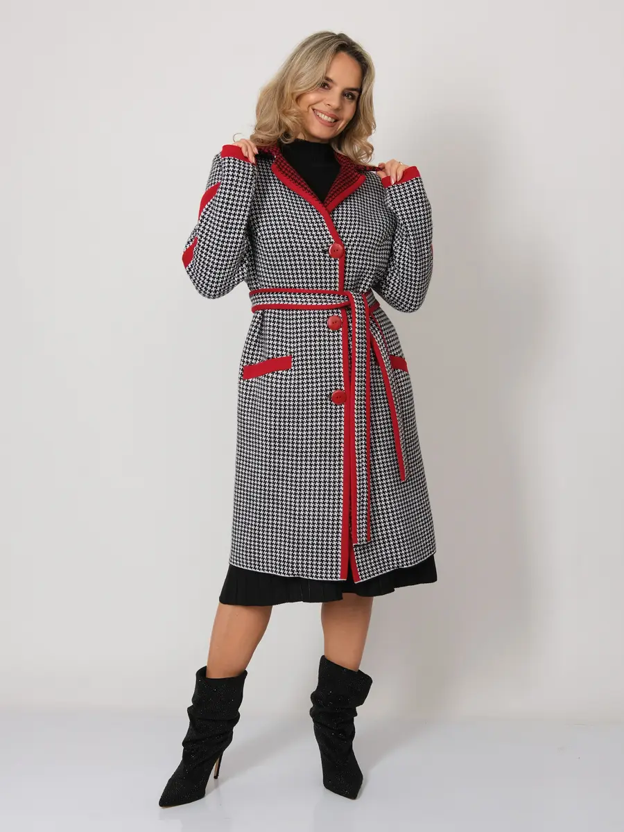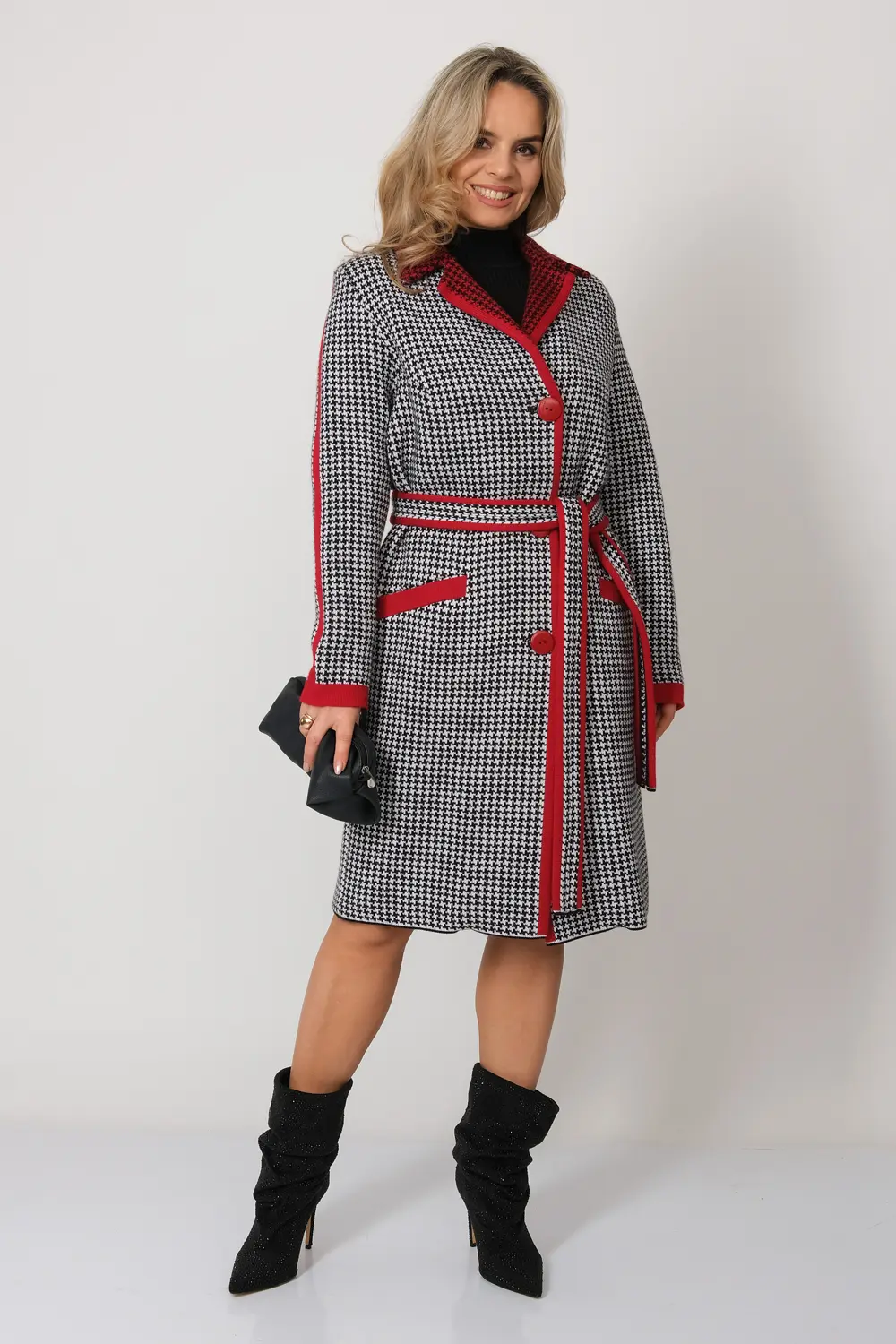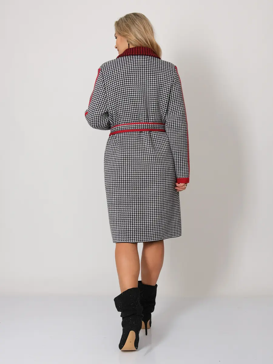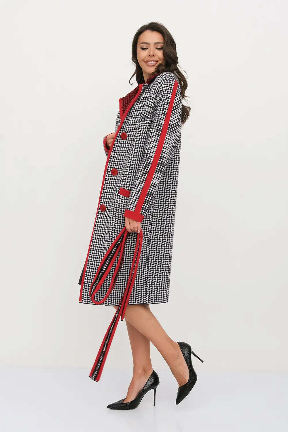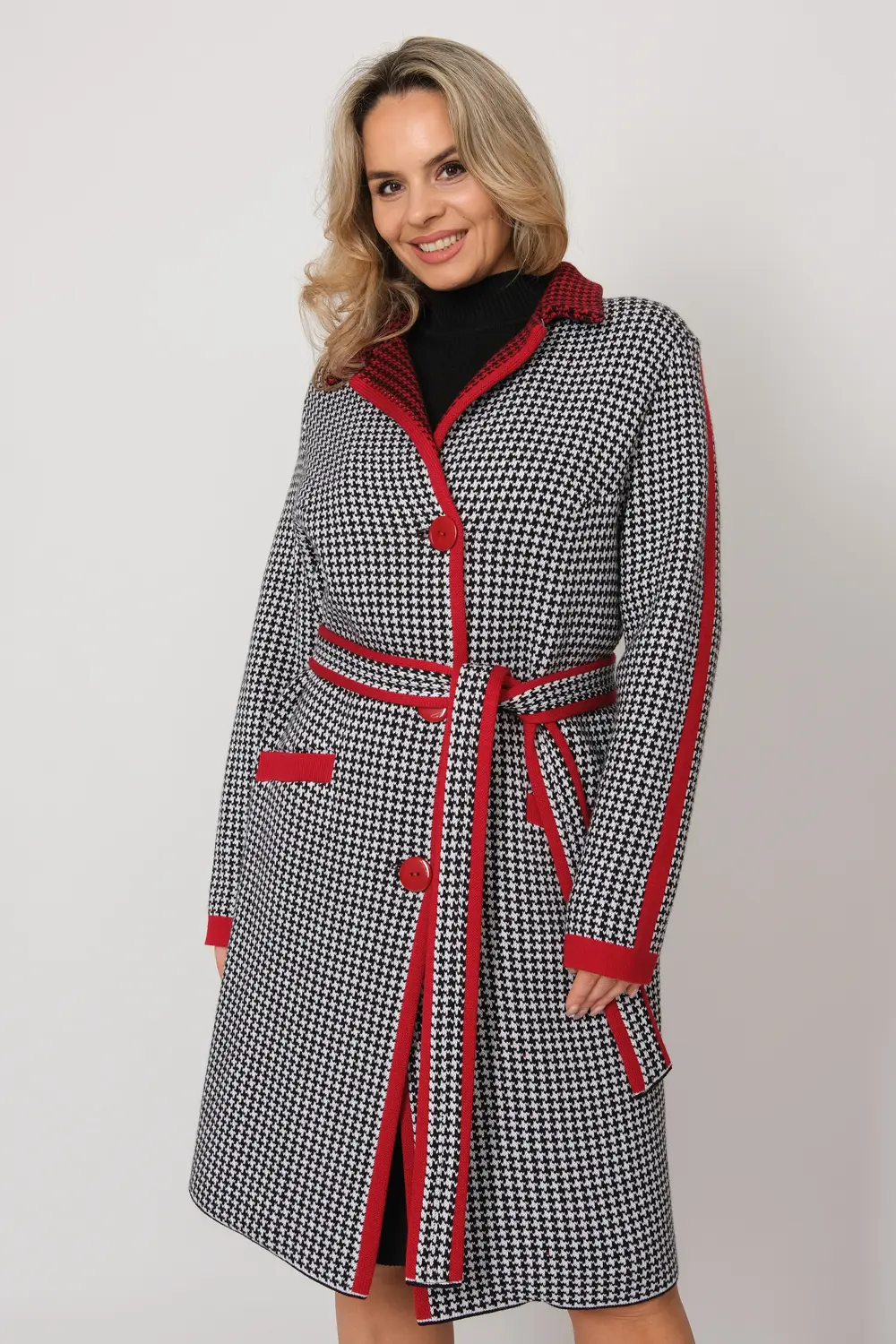 Кардиган женский вязаный, удлинённый, прямого силуэта, с поясом. Модель с английским отложным воротником, что придаёт модели деловой вид. Практичная застёжка на пуговицы. Рукав втачной. Прорезные карманы с листочкой.