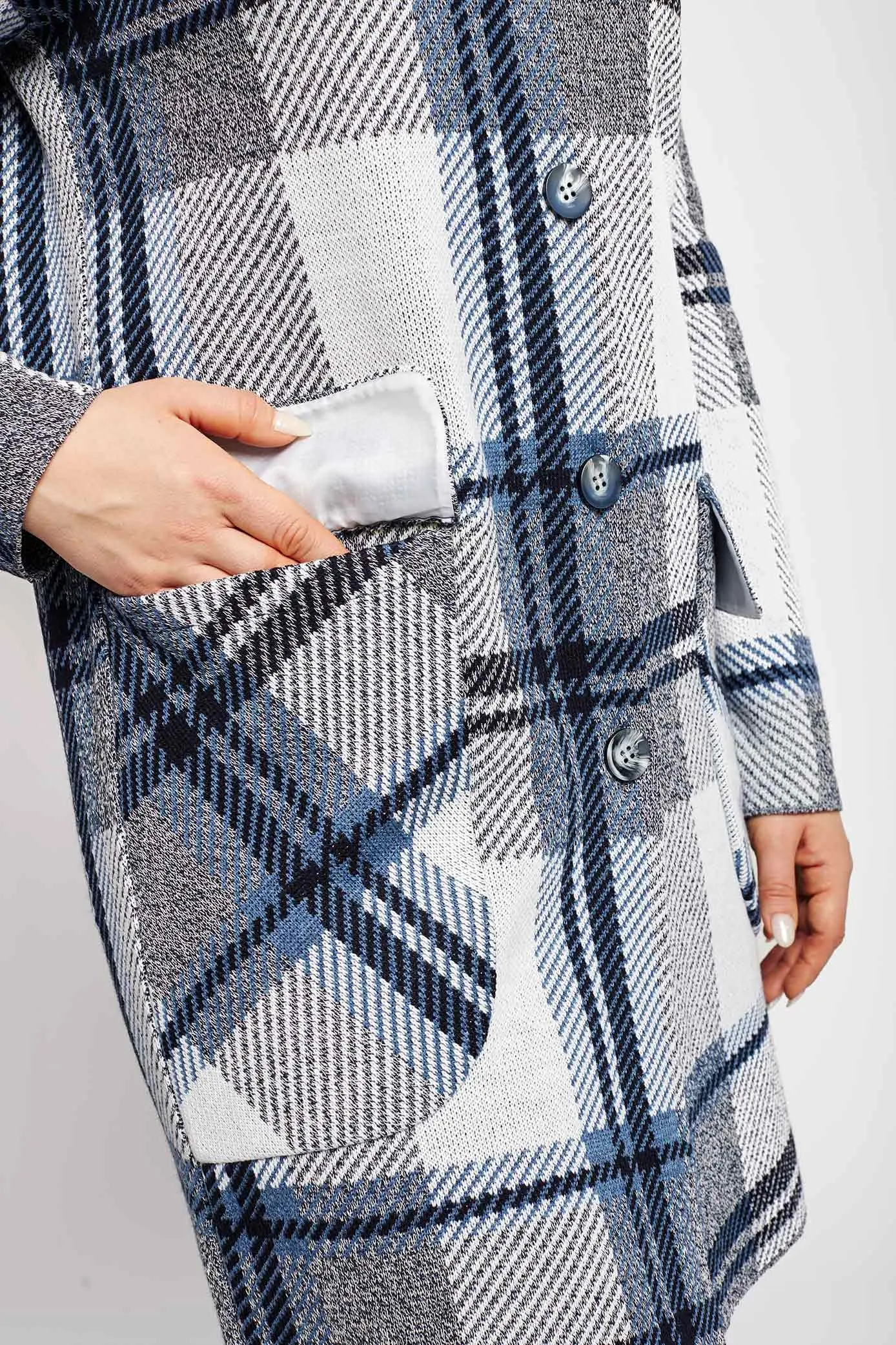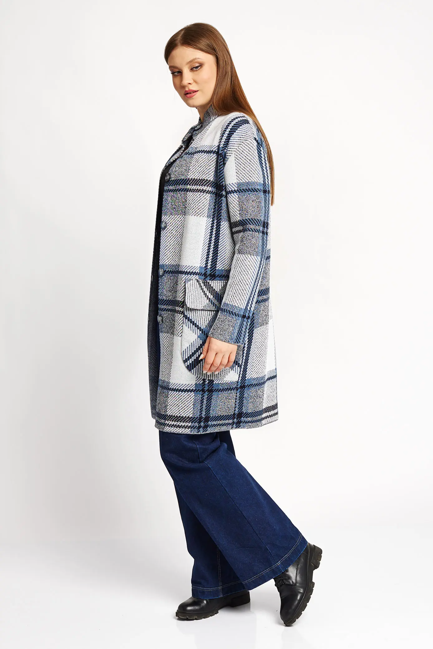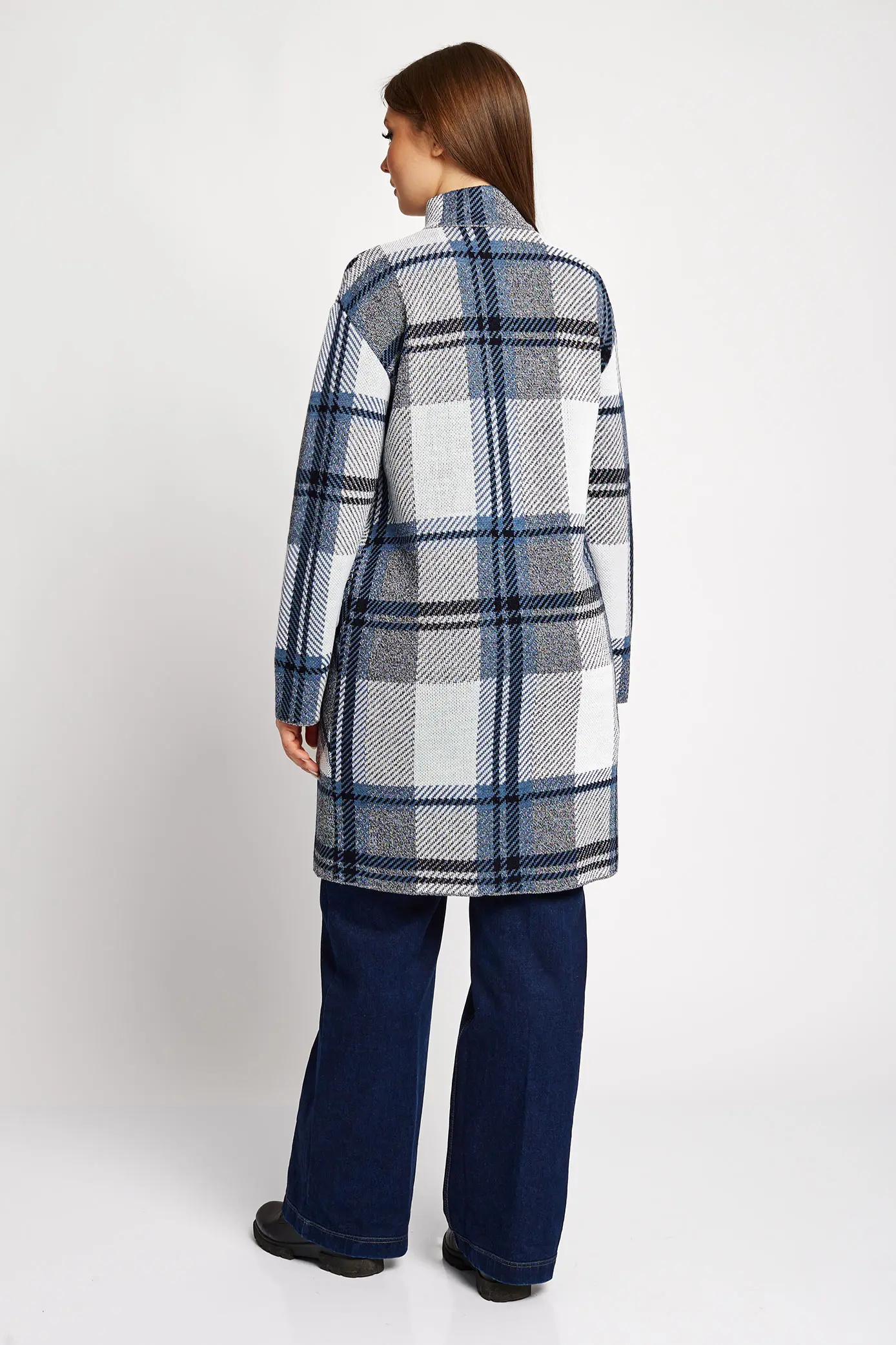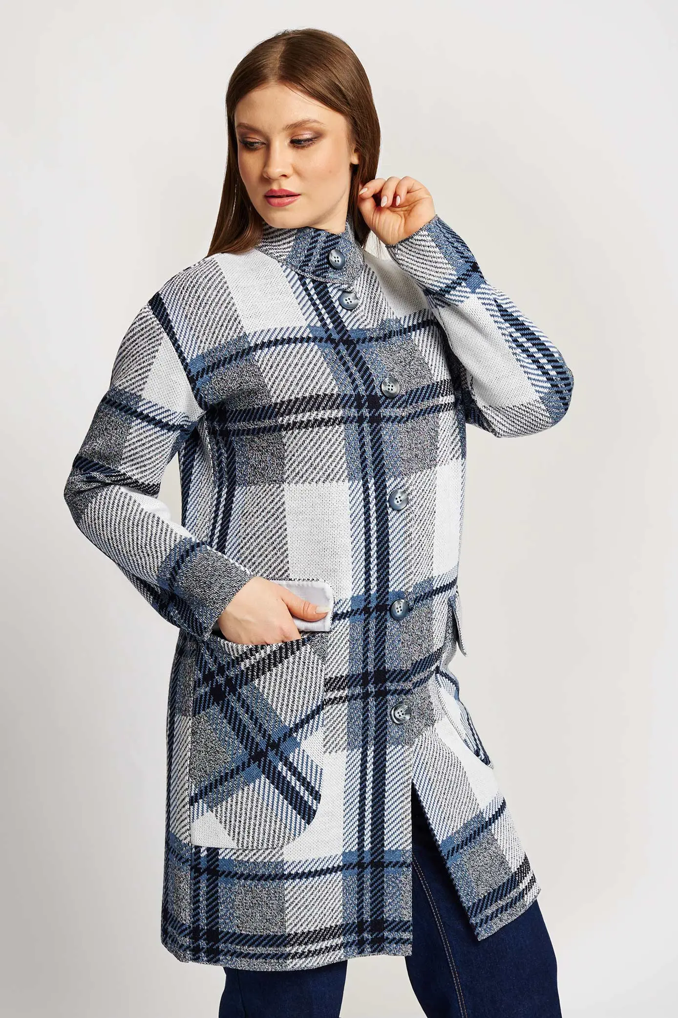 Женский вязаный кардиган, прямого силуэта, на пуговицах. Воротник-стойка. Спущенное плечо, рукав втачной длинный. Карманы накладные с клапаном. Кардиган выполнен жаккардовым переплетением рисунок клетка.
