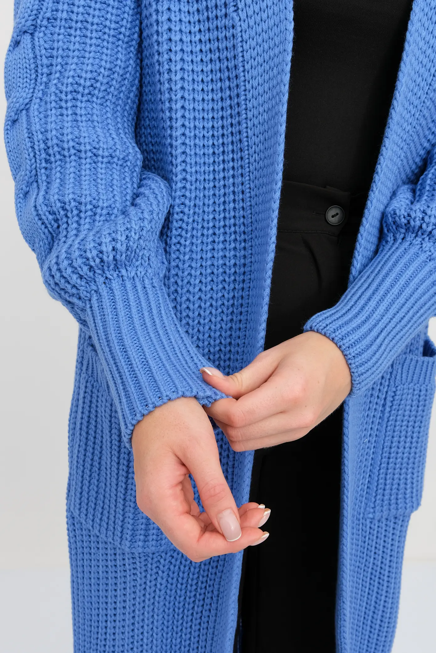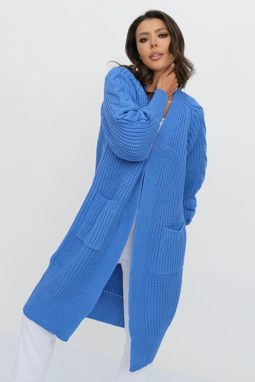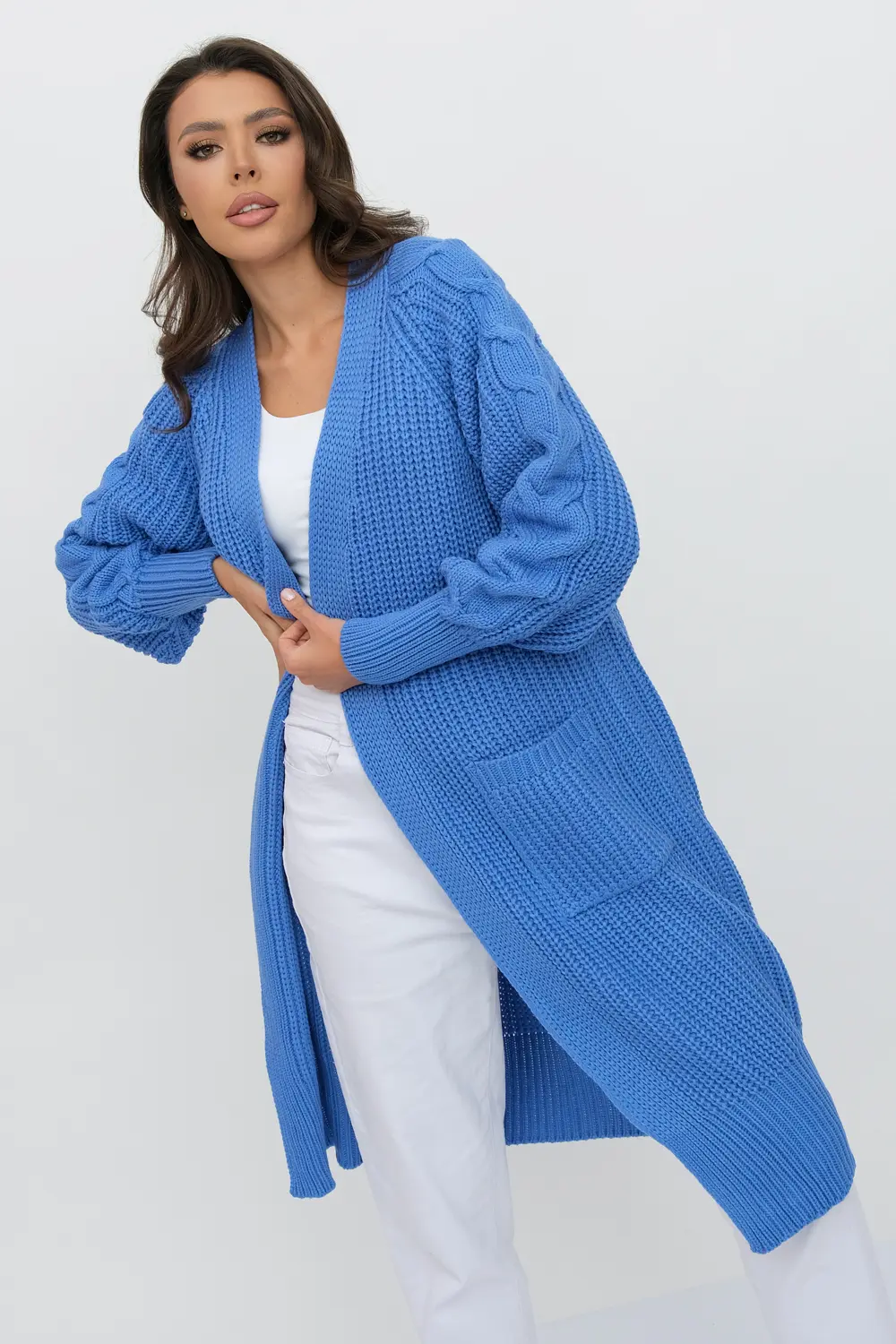 Кардиган женский вязаный свободного силуэта. V-образный вырез. Рукав-реглан длинный. По низу рукава и изделия эластичная резинка. Кардиган выполнен объемной вязкой "французская резинка". Карманы декорированы узором "косы".