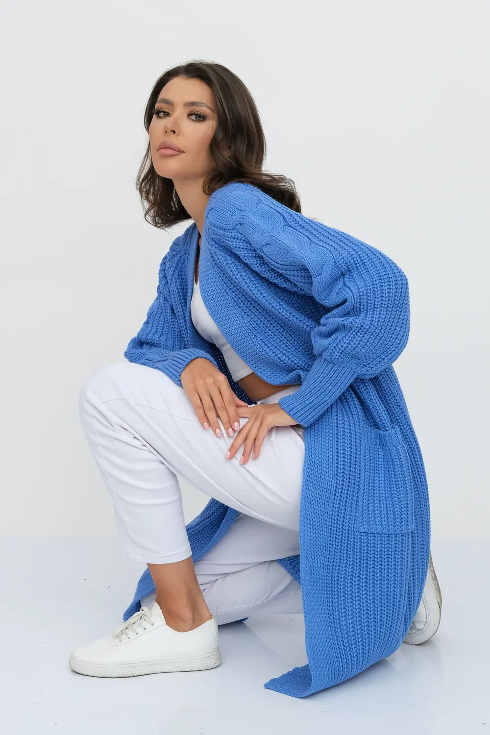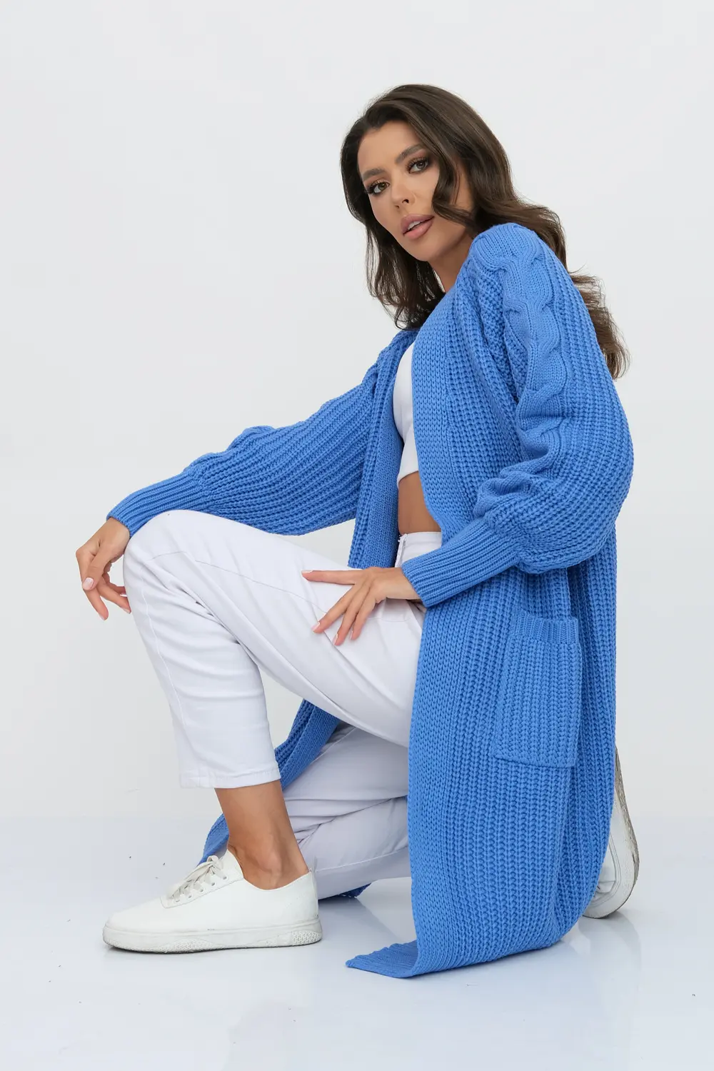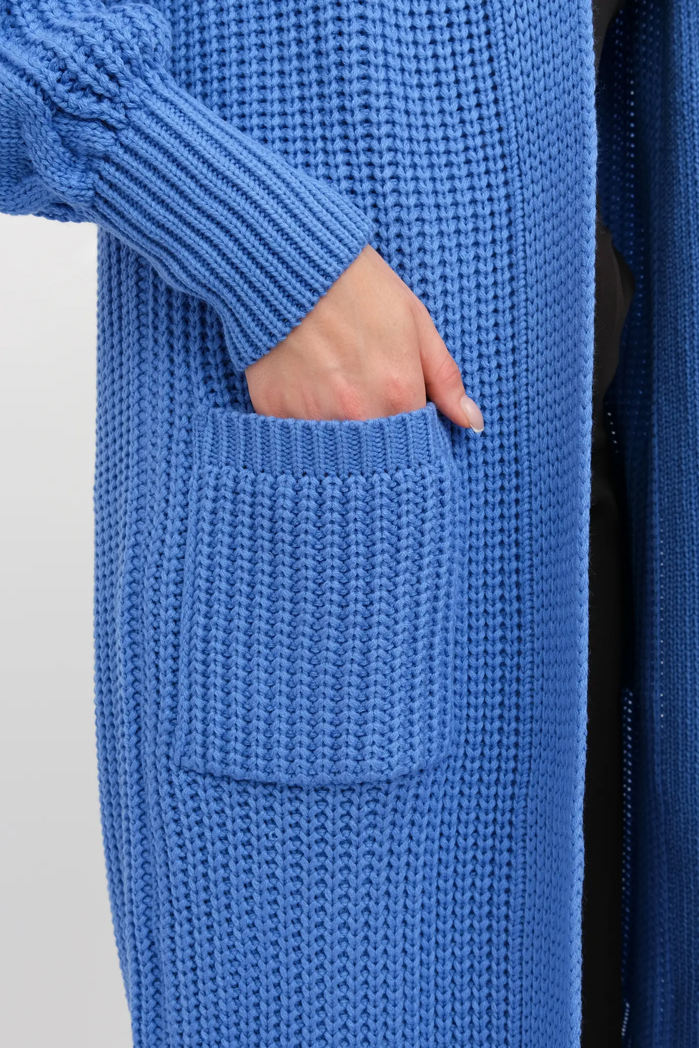 Кардиган женский вязаный свободного силуэта. V-образный вырез. Рукав-реглан длинный. По низу рукава и изделия эластичная резинка. Кардиган выполнен объемной вязкой "французская резинка". Карманы декорированы узором "косы".