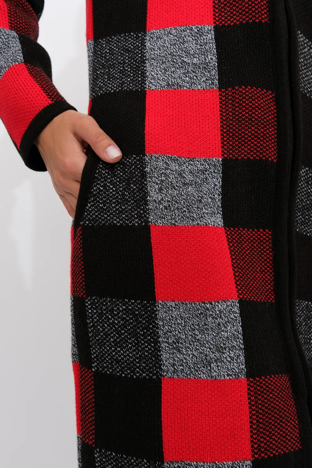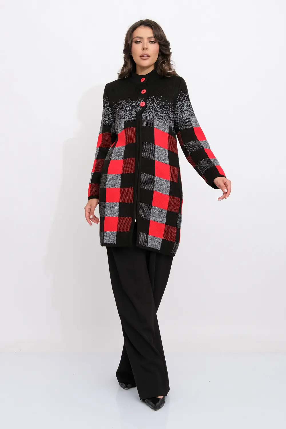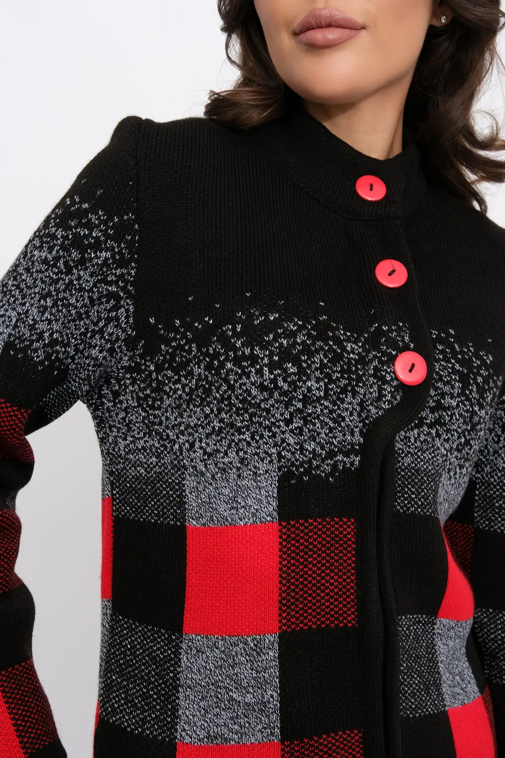 Женский эффектный вязанный кардиган с ассиметричным бортом. Кардиган на молнии по всей длине, с декоративными застежками- пуговицами по верху изделия. Рукава втачные длинные. Два прорезных кармана. Жаккардовое переплетение образует геометрический рисунок. Кардиган согреет вас в прохладный день и подарит ощущение невероятного комфорта.