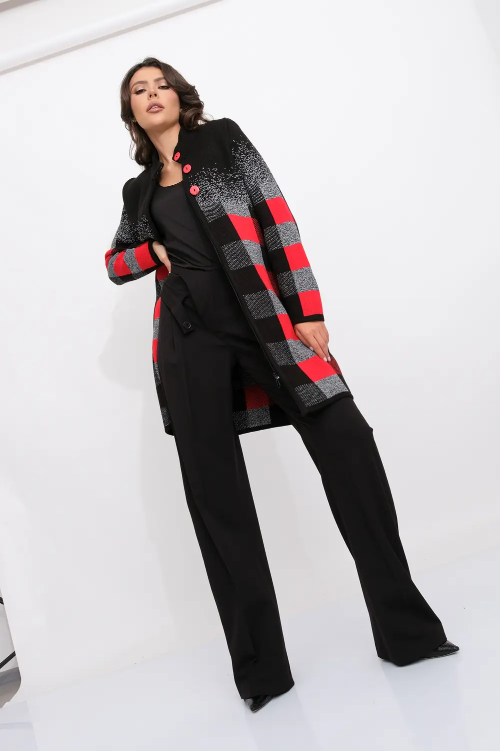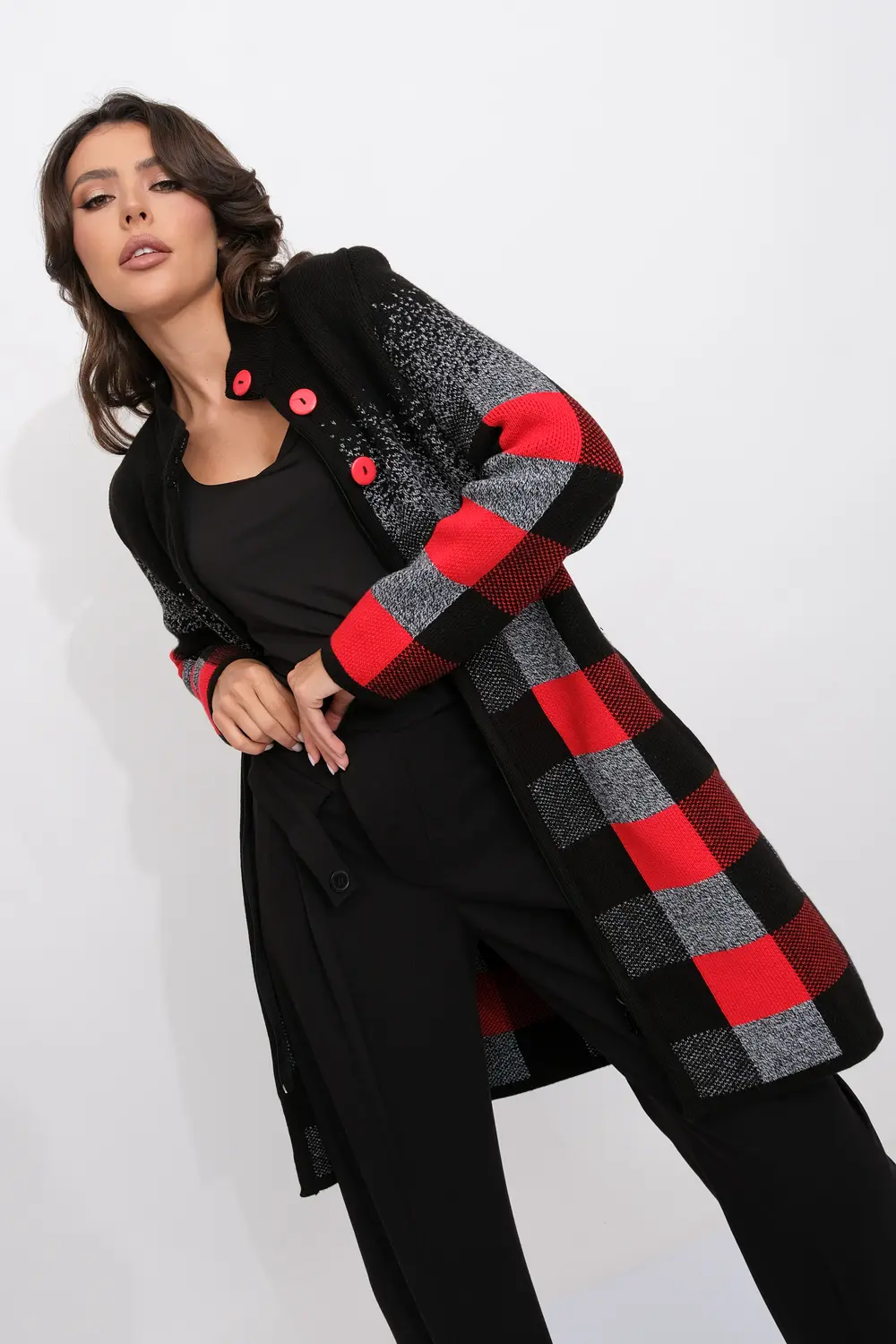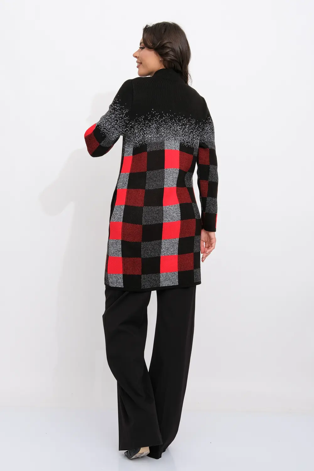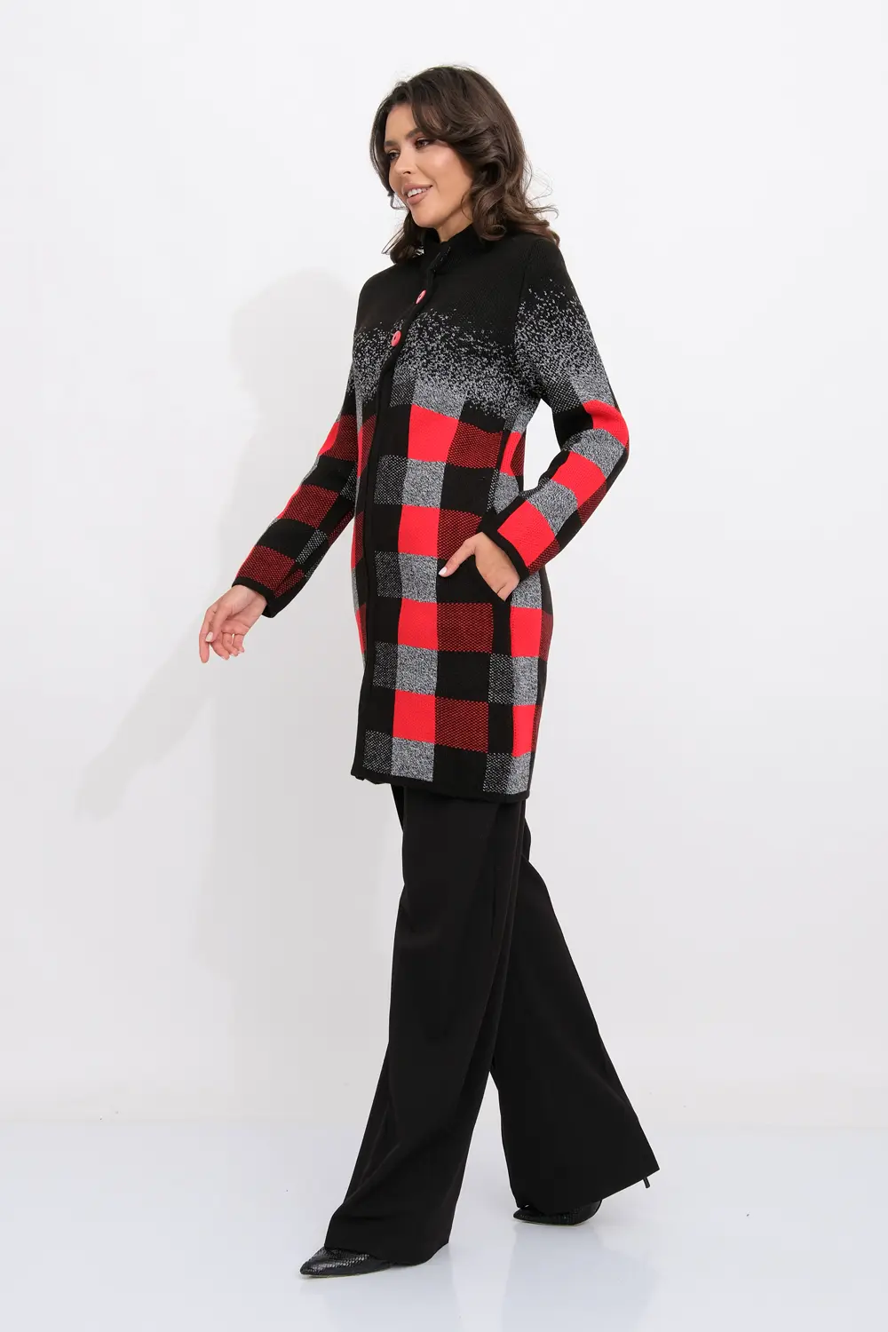 Женский эффектный вязанный кардиган с ассиметричным бортом. Кардиган на молнии по всей длине, с декоративными застежками- пуговицами по верху изделия. Рукава втачные длинные. Два прорезных кармана. Жаккардовое переплетение образует геометрический рисунок. Кардиган согреет вас в прохладный день и подарит ощущение невероятного комфорта.