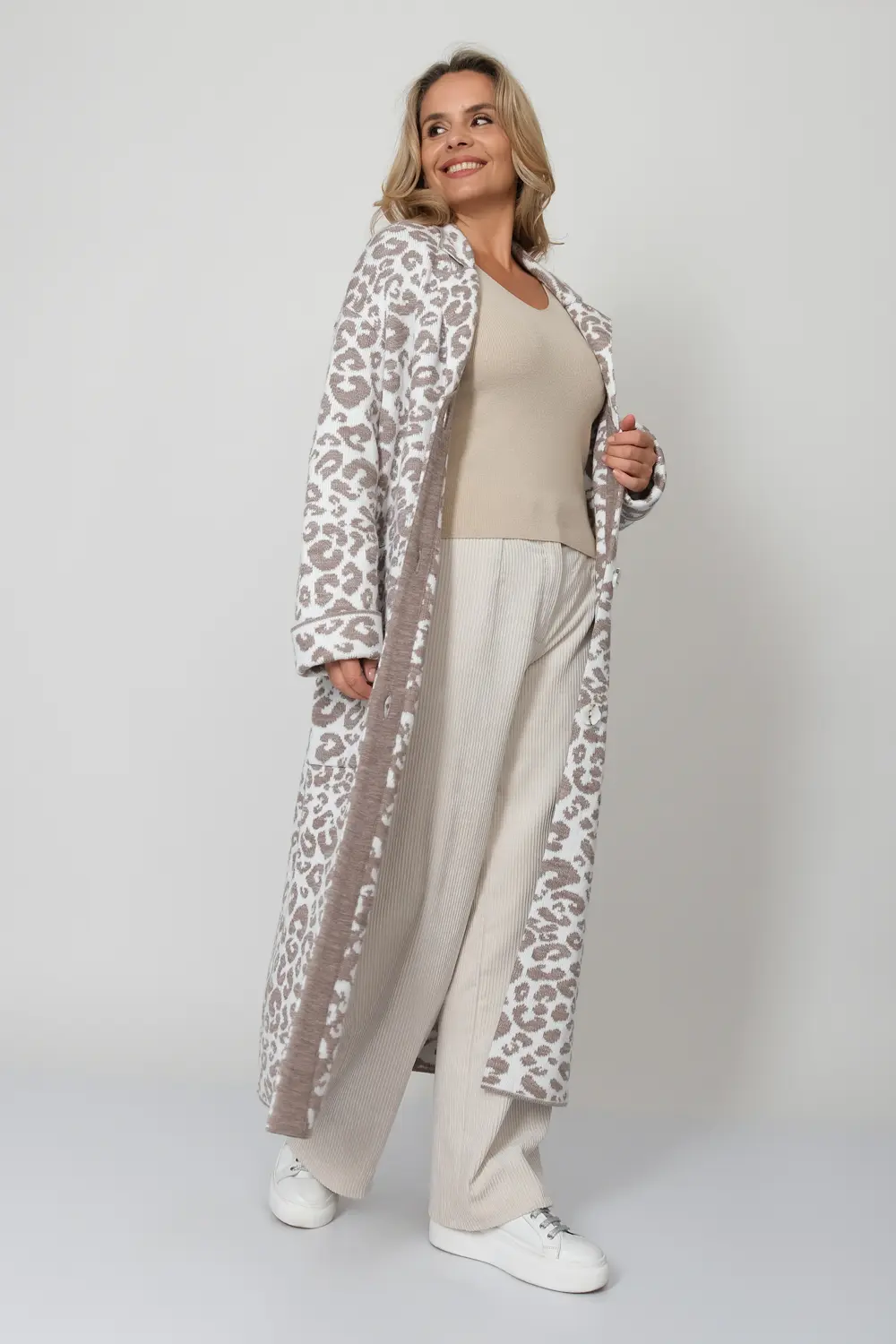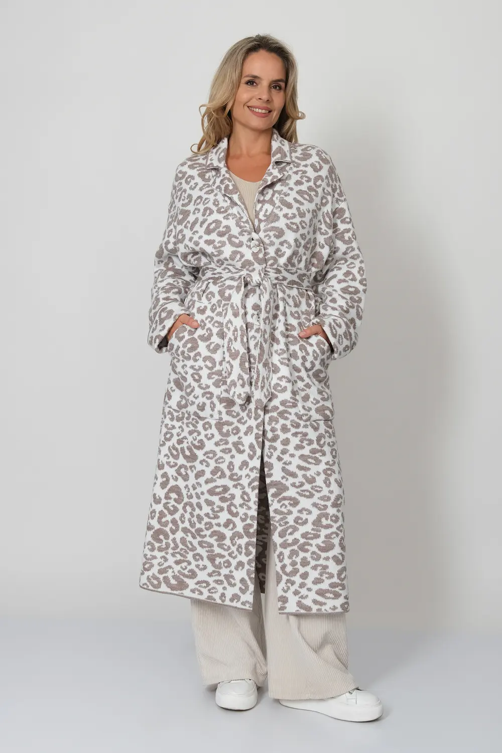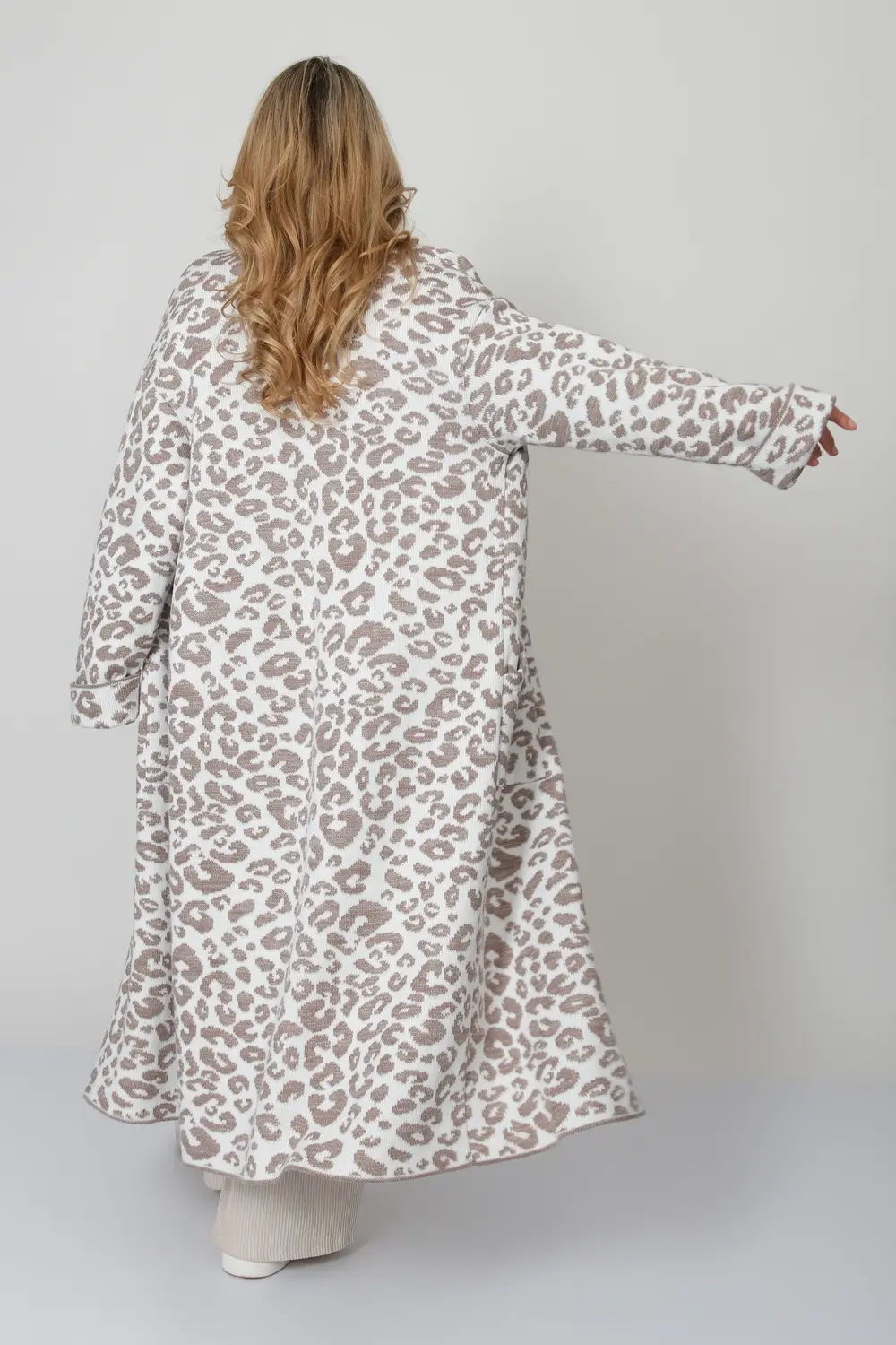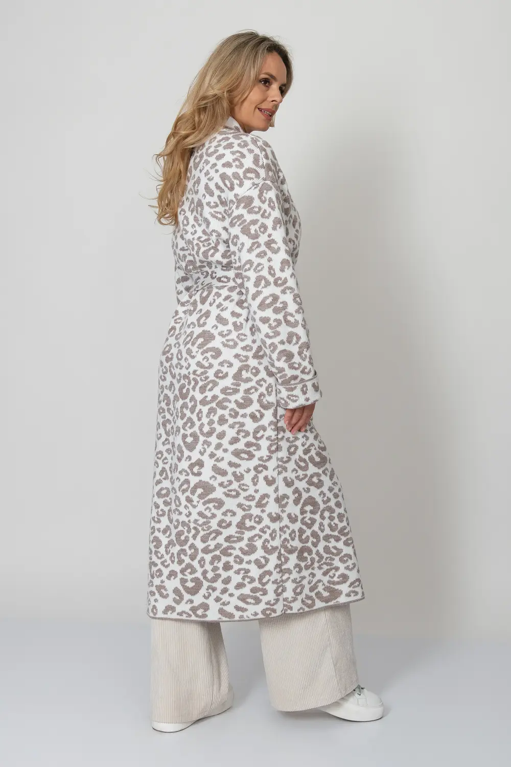 Трикотажный кардиган свободного силуэта. Плечо спущенное, рукава втачные длинные с отворотом. Кардиган застегивается на пуговицы образуя V-образный вырез горловины с отложным воротником. Кардиган выполнен жаккардовым переплетением образующим анималистический принт "леопард". В комплект входит пояс.