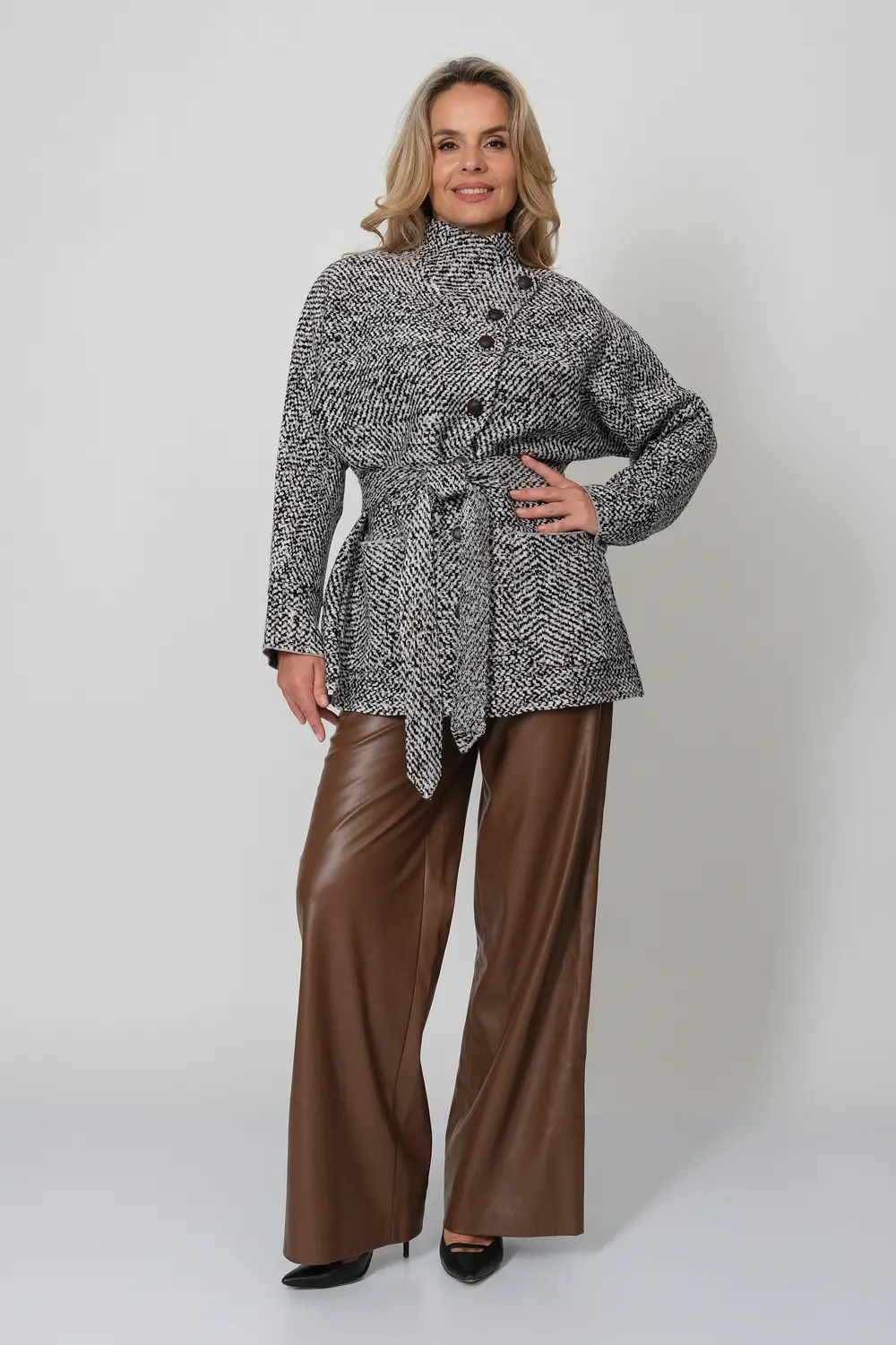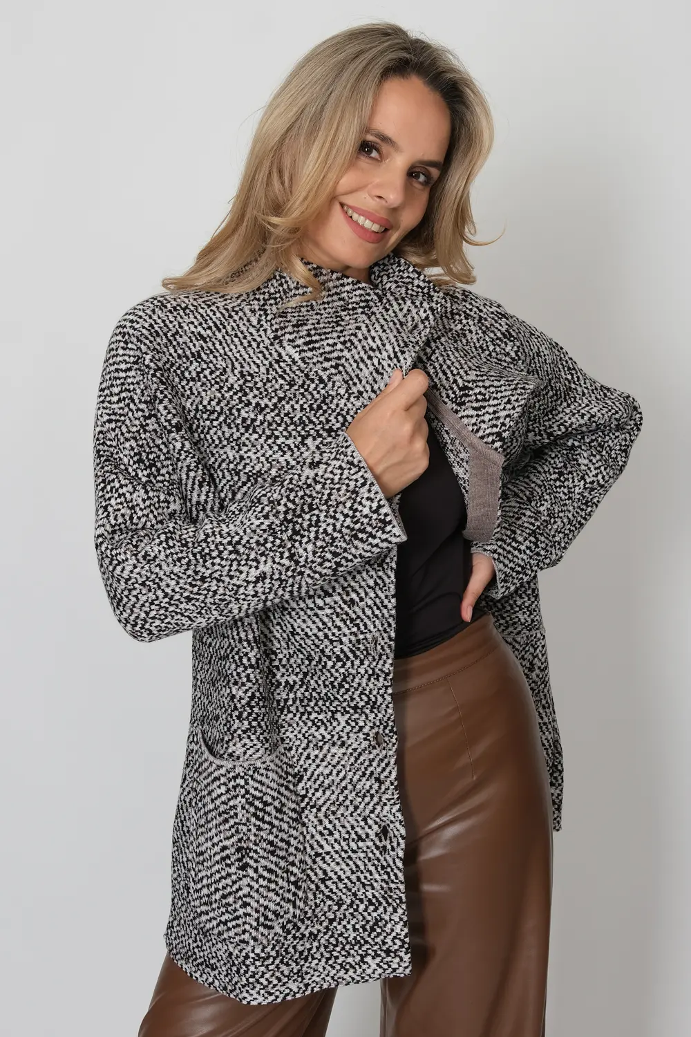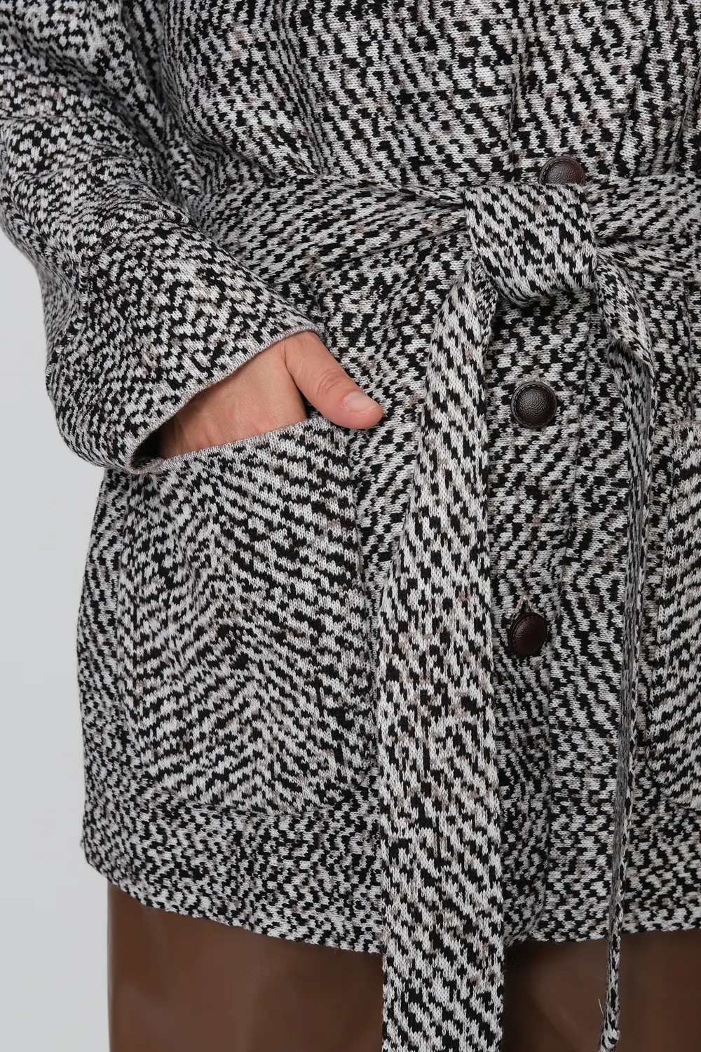 Кардиган женский трикотажный полуприлегающего силуэта длиной до середины бедра. Кардиган застегивается на пуговицы по переду и воротнику-стойке. Рукав цельнокроенный длинный. Накладные симметричные карманы. Изделие выполнено жаккардовым переплетением образующим мелкий геометрический рисунок.