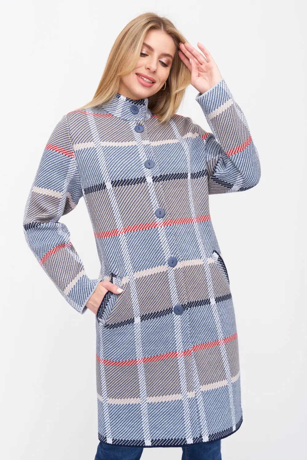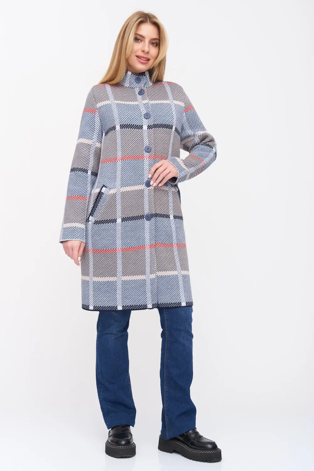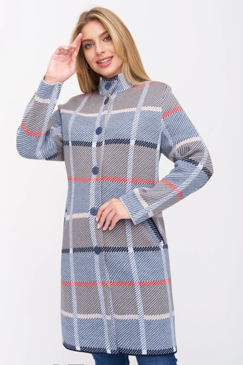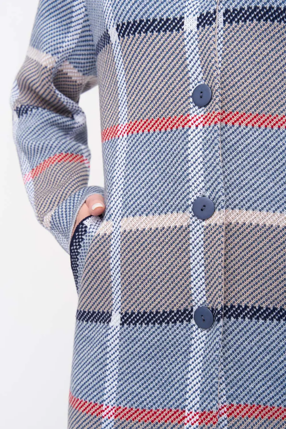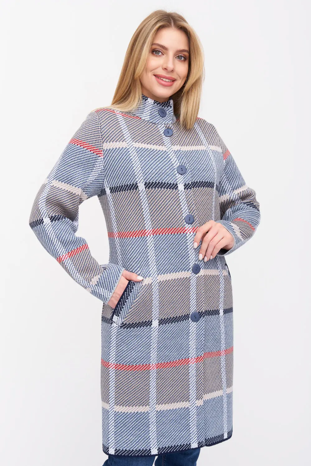 Кардиган женский трикотажный свободного силуэта. Воротник -стойка, рукава втачные длинные. Два функциональных прорезных кармана, Кардиган выполнен жаккардовым переплетением, образуя геометрический рисунок-клетка.