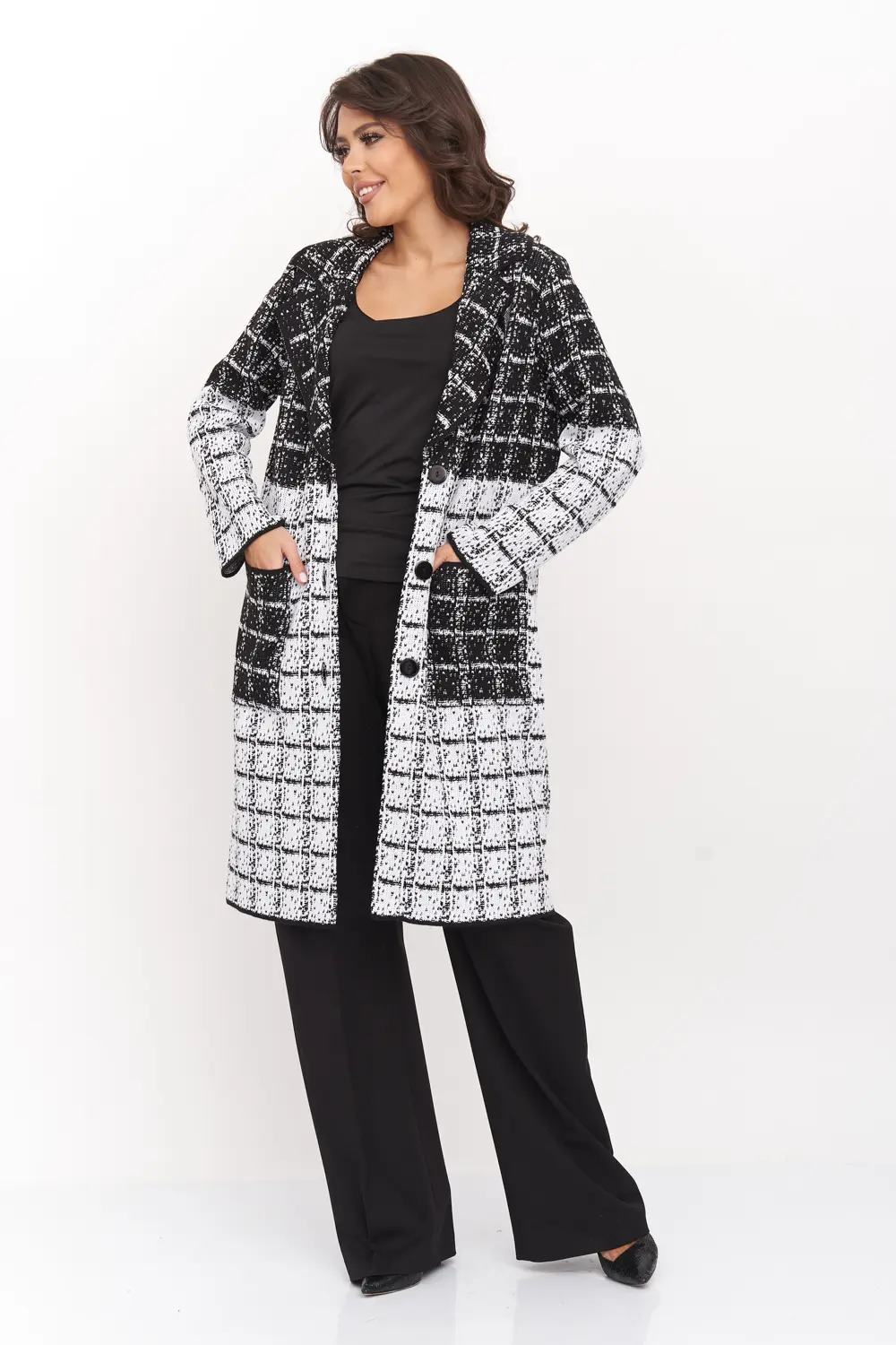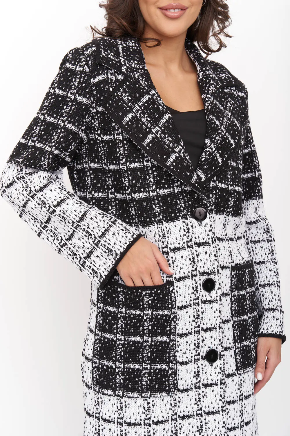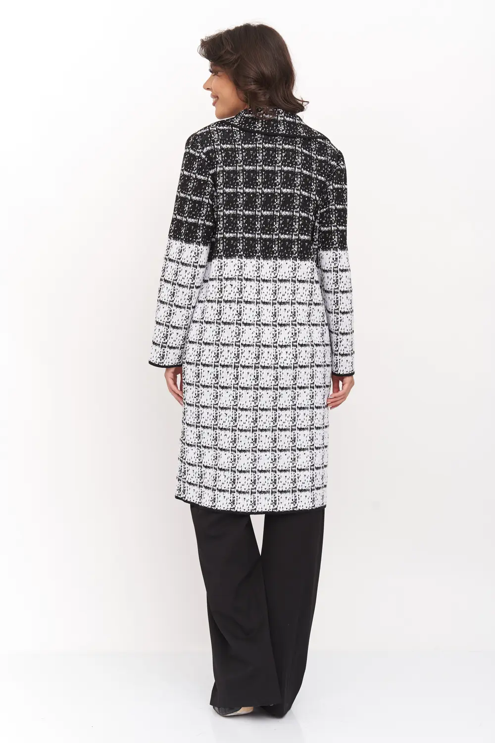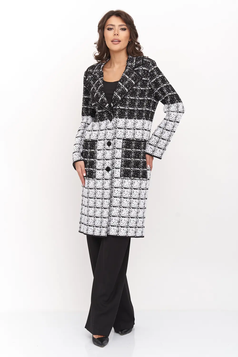 Кардиган женский трикотажный свободного силуэта. Воротник английский классический, рукава втачные длинные. Два функциональных накладных кармана, Кардиган выполнен жаккардовым переплетением, образуя геометрический рисунок-клетка.