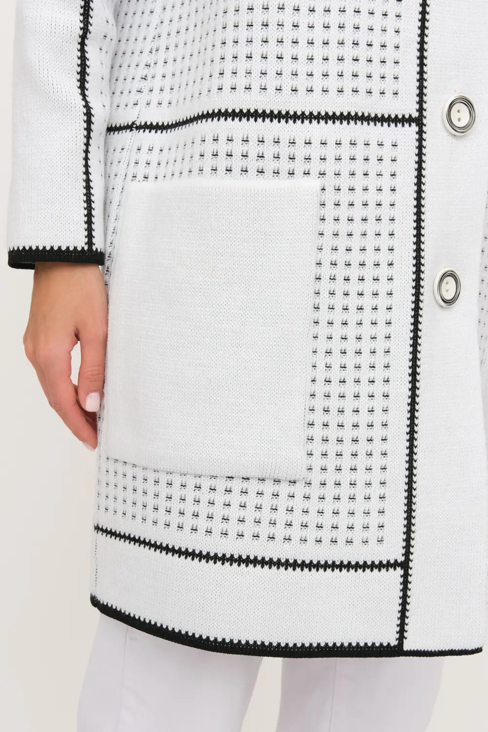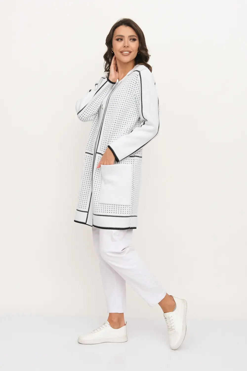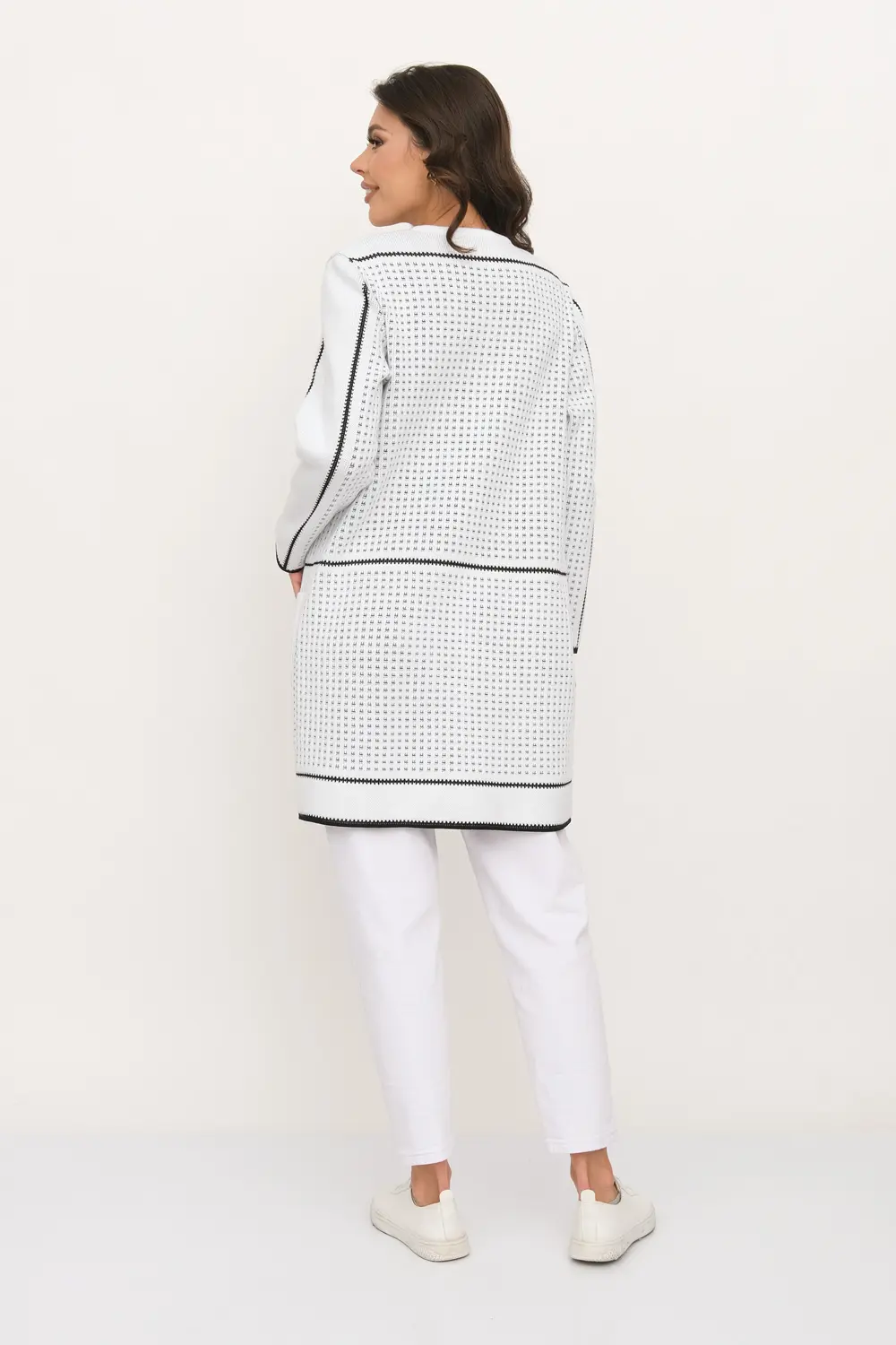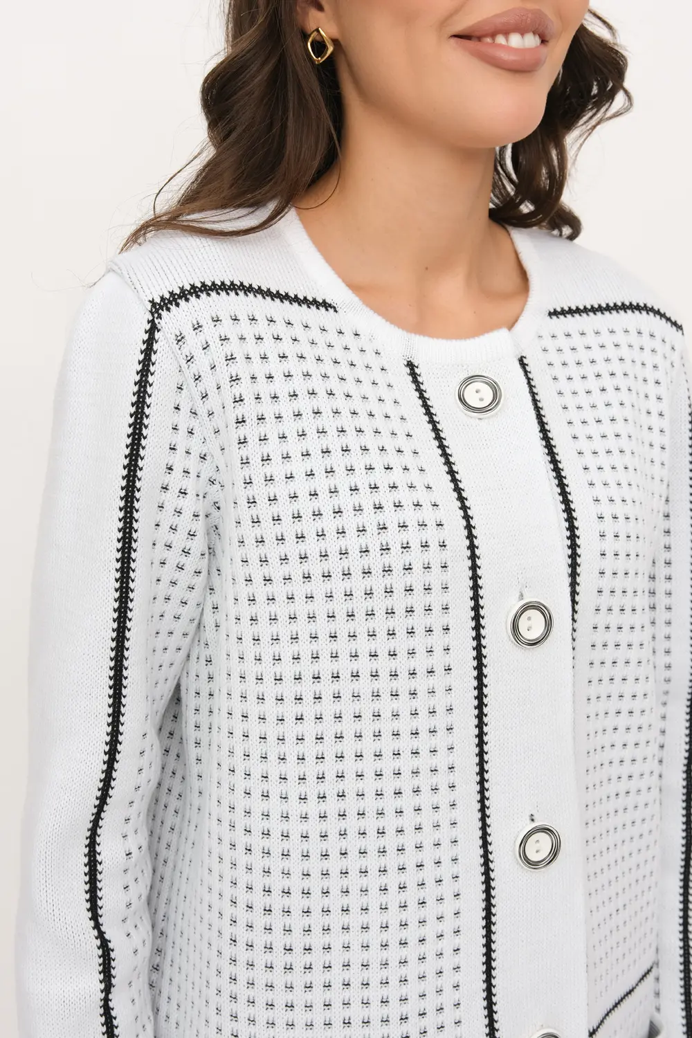 Трикотажный кардиган прямого силуэта. Круглая горловина, рукава втачные длинные. Кардиган застегивается на пуговицы.