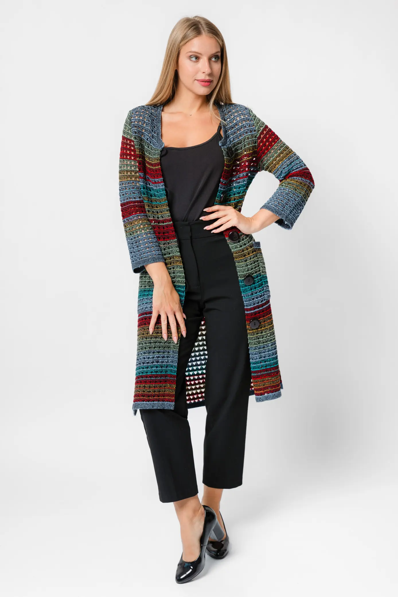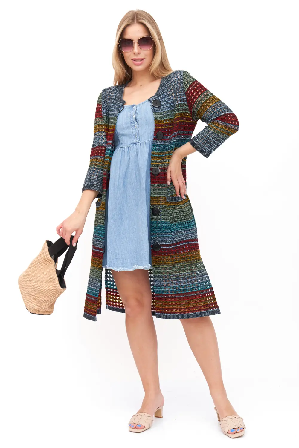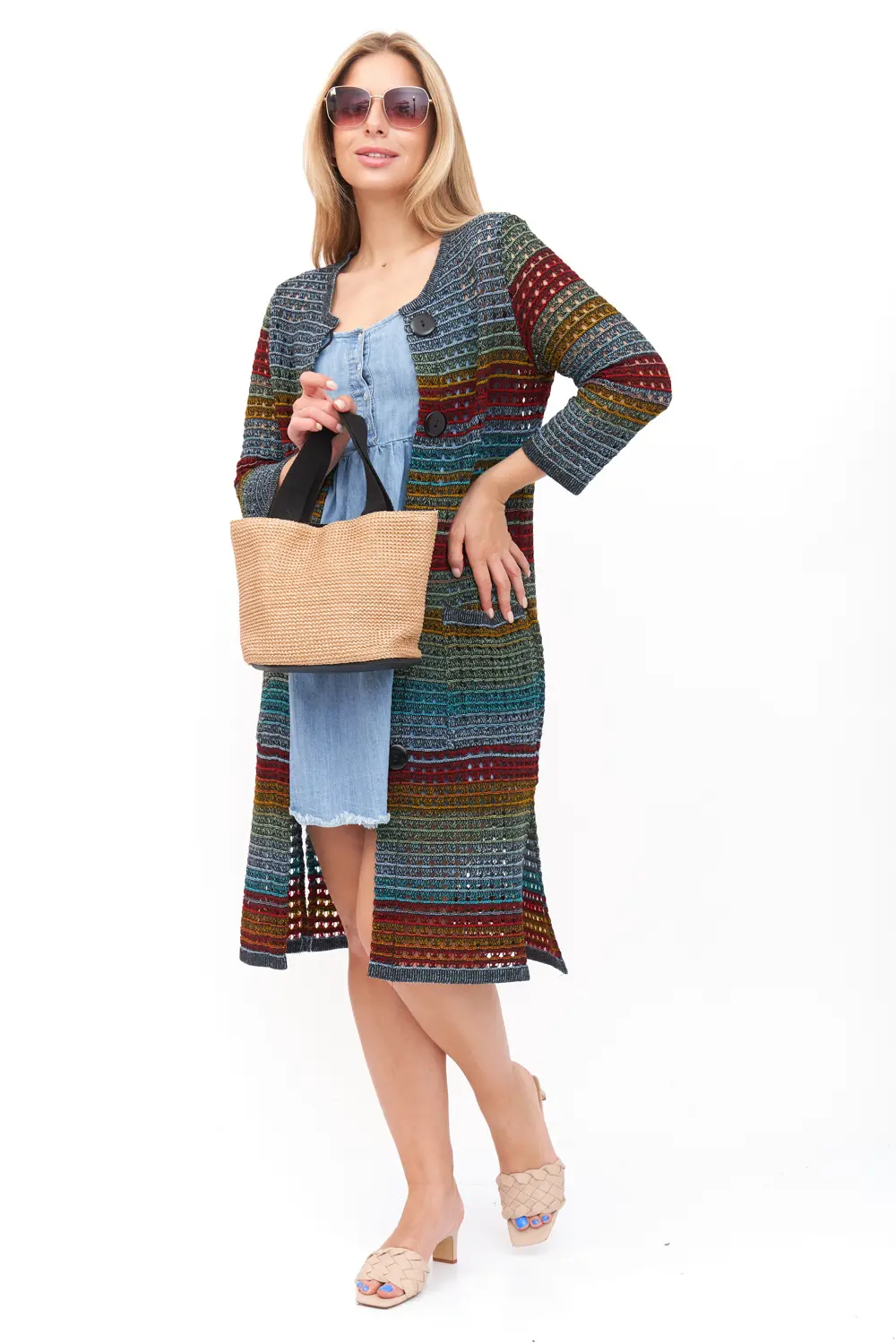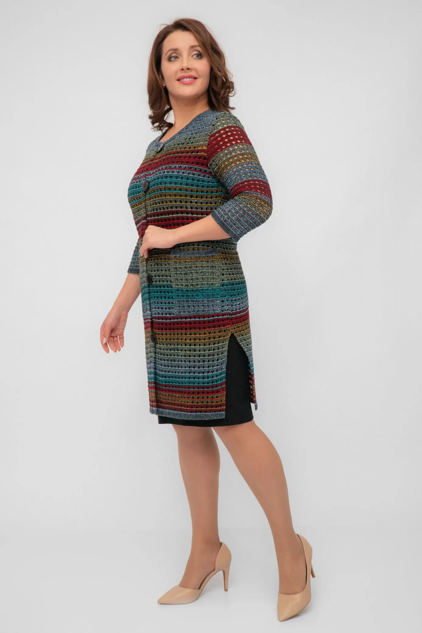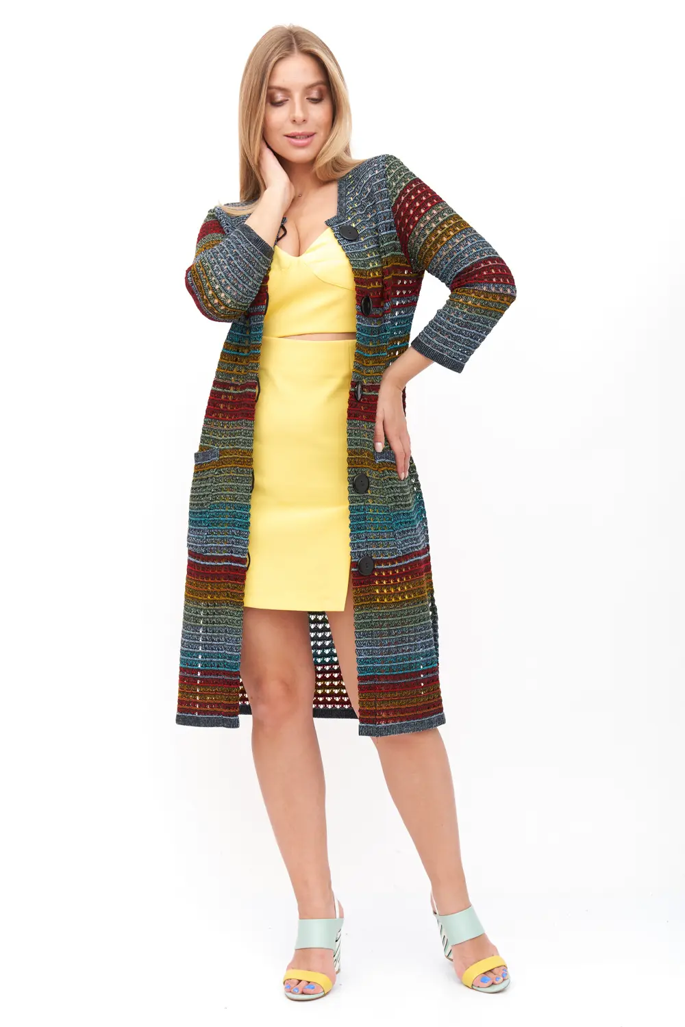 Кардиган можно сочетать с различной одеждой цветных и пастельных тонов.