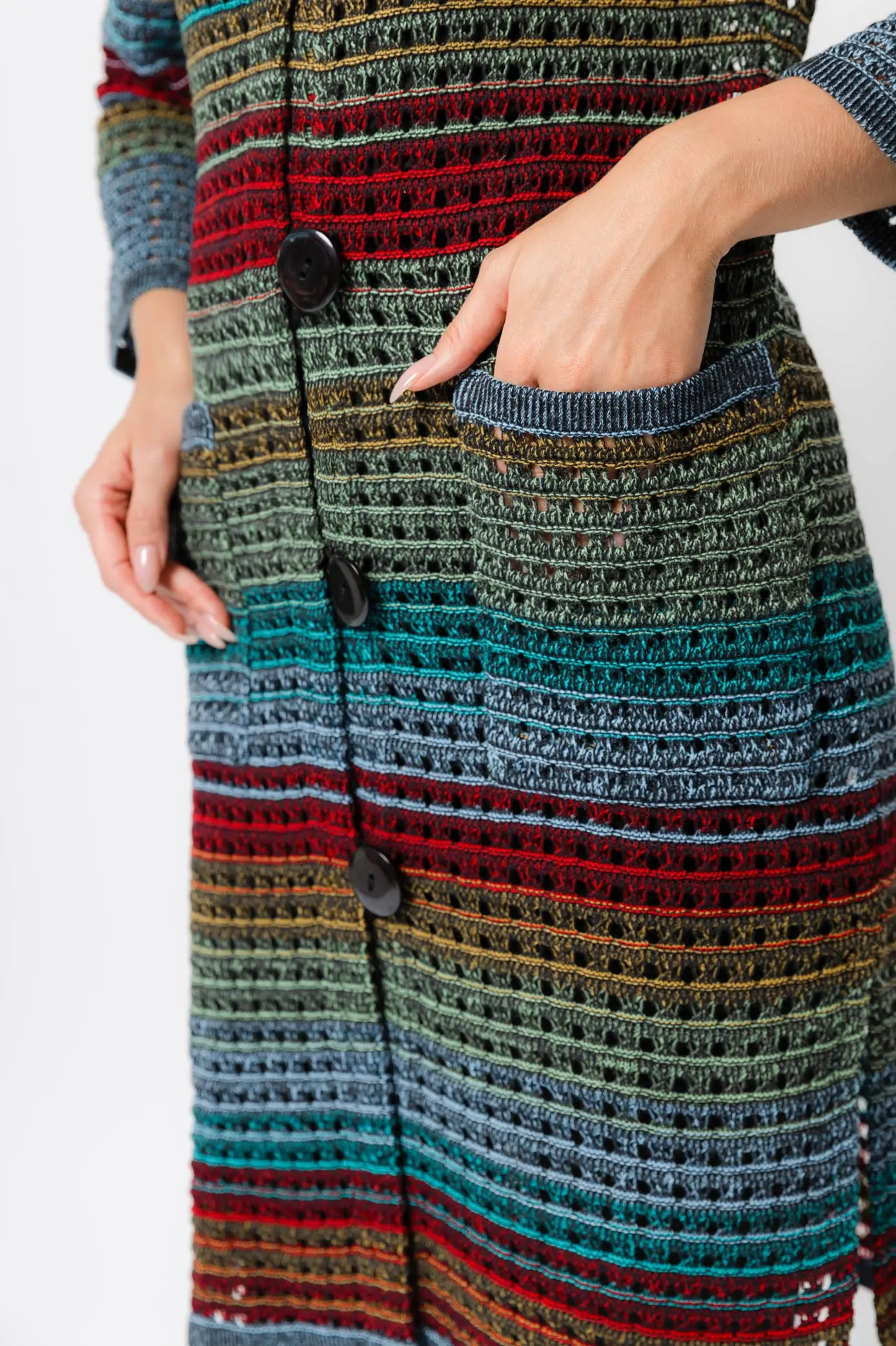 Свободный прямой силуэт и крупная сеточка придают кардигану оригинальную легкость. А цветовая гамма показывает в изделии романтический стиль. Представлена она темными, мягкими тонами и полутонами с нежными переходами от одного цвета в другой. Благодаря такому многоцветию палитра красок подобна радуге после дождя. Горловина кардигана круглая и лёгкая. Небольшие удобные накладные карманы.